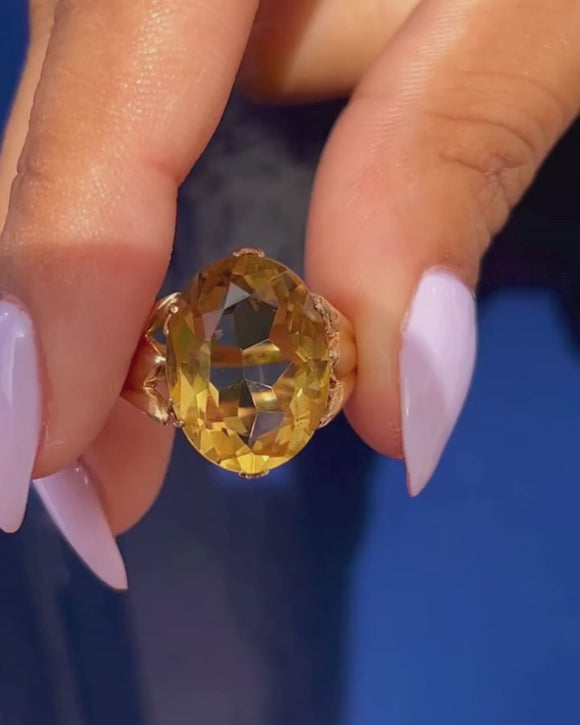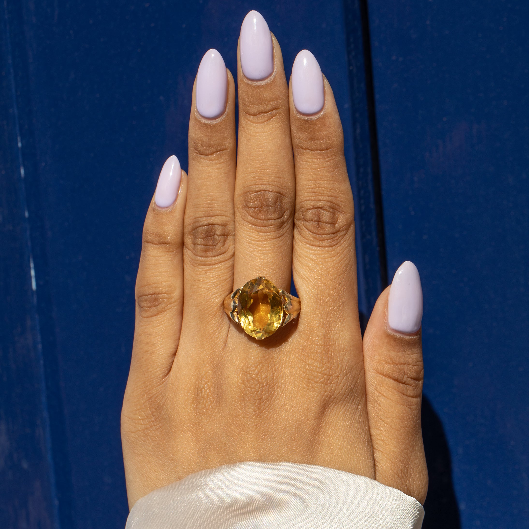 Golden 9ct Gold with delightful honey hues form the cathedral setting in which her 8.30ct Citrine sits. She slides smoothly onto your finger and provides ample finger coverage creating a real statement piece. This vintage Citrine ring is sure to brighten up any room you enter!