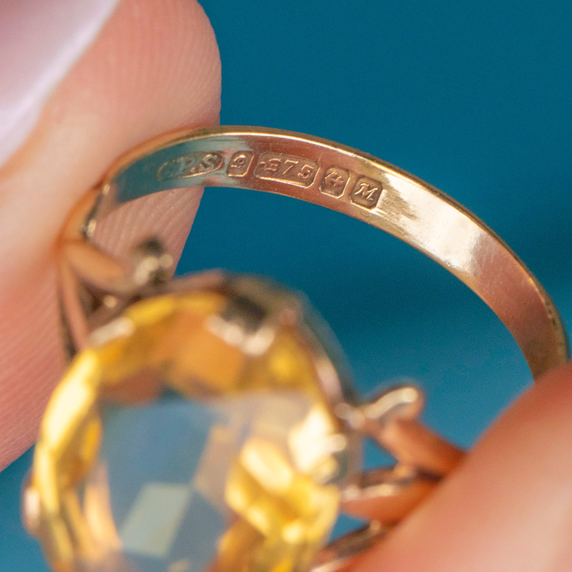 EXCELLENT. This 9ct Gold Citrine dress ring is in excellent condition. The Citrine is secure within its settings and free from chips or abrasions. The ring has lovely split shoulders that lead out onto a gorgeously smooth band, stamped and dated to 1961. You will love wearing this ring!