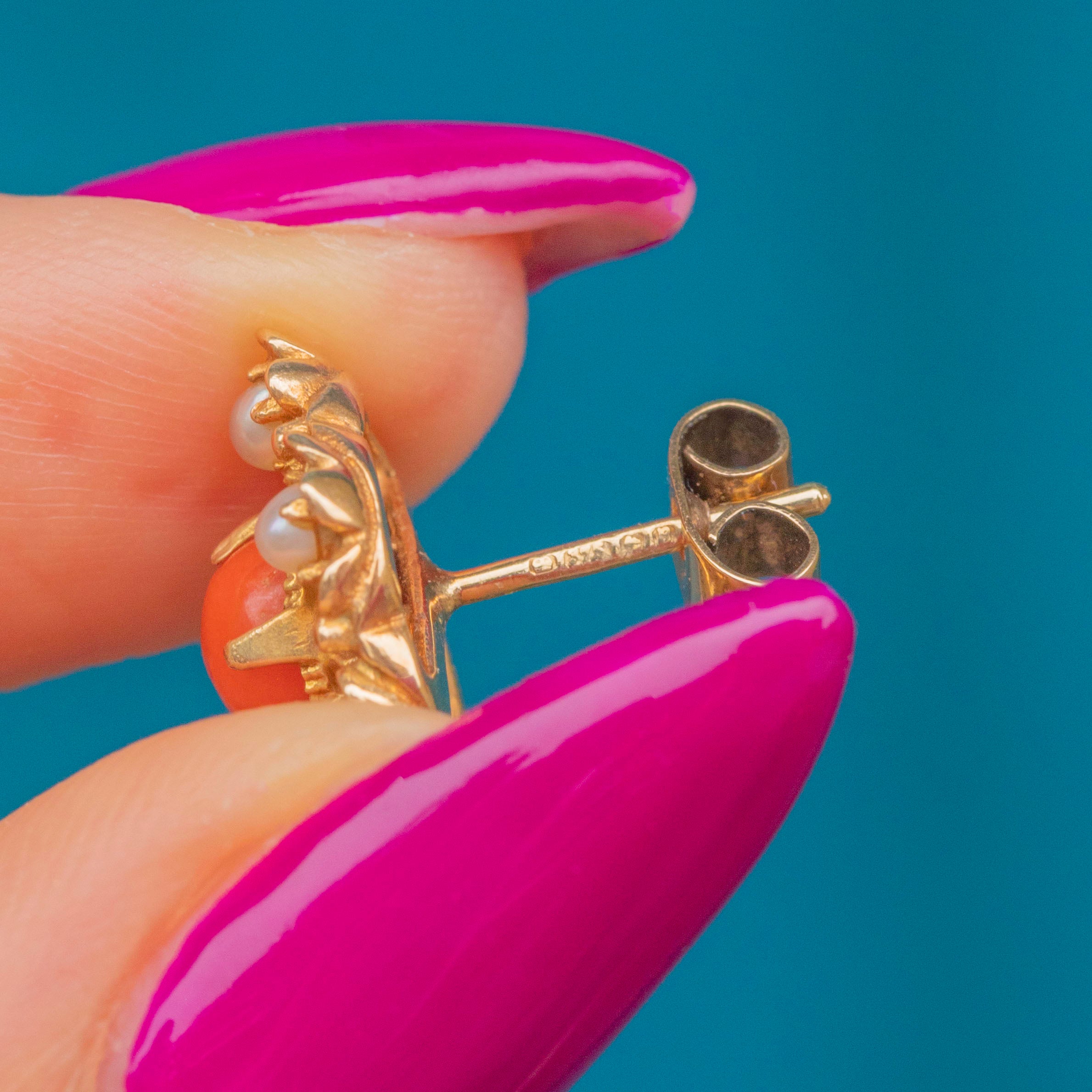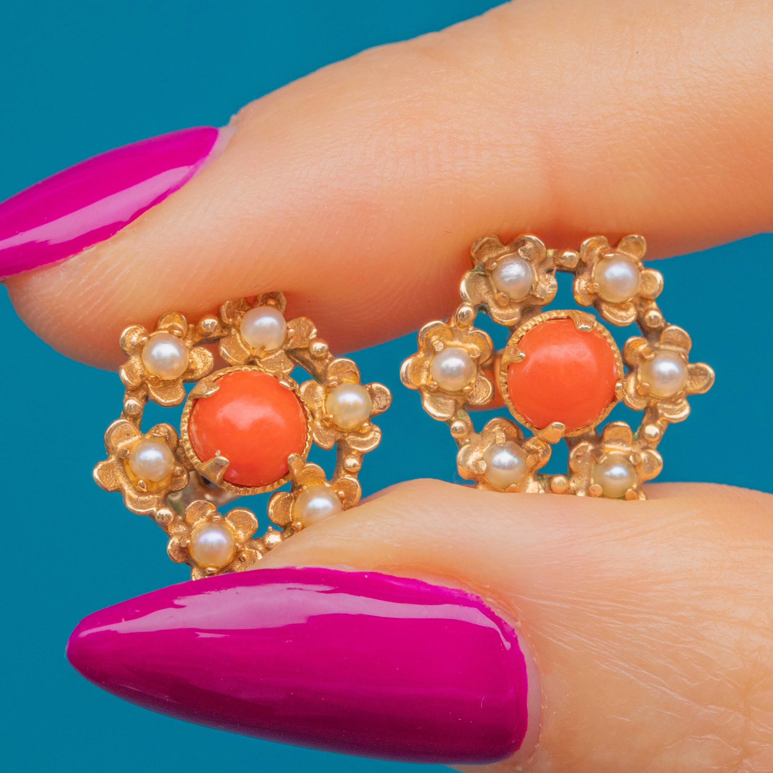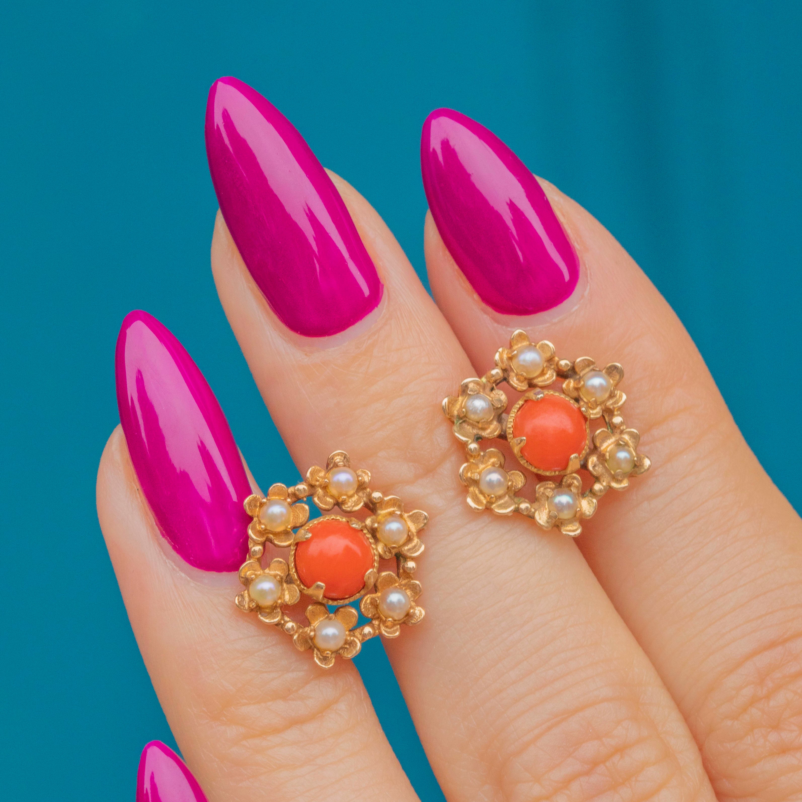 These mid-century vintage studs are formed from solid 9ct Gold and centred by apricot-hued Coral haloed by iridescent Seed Pearls, combining to create a sophisticated colour palette.