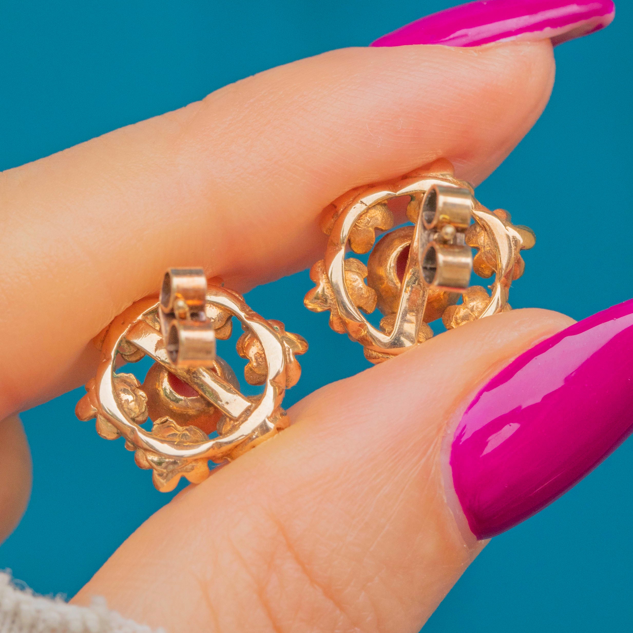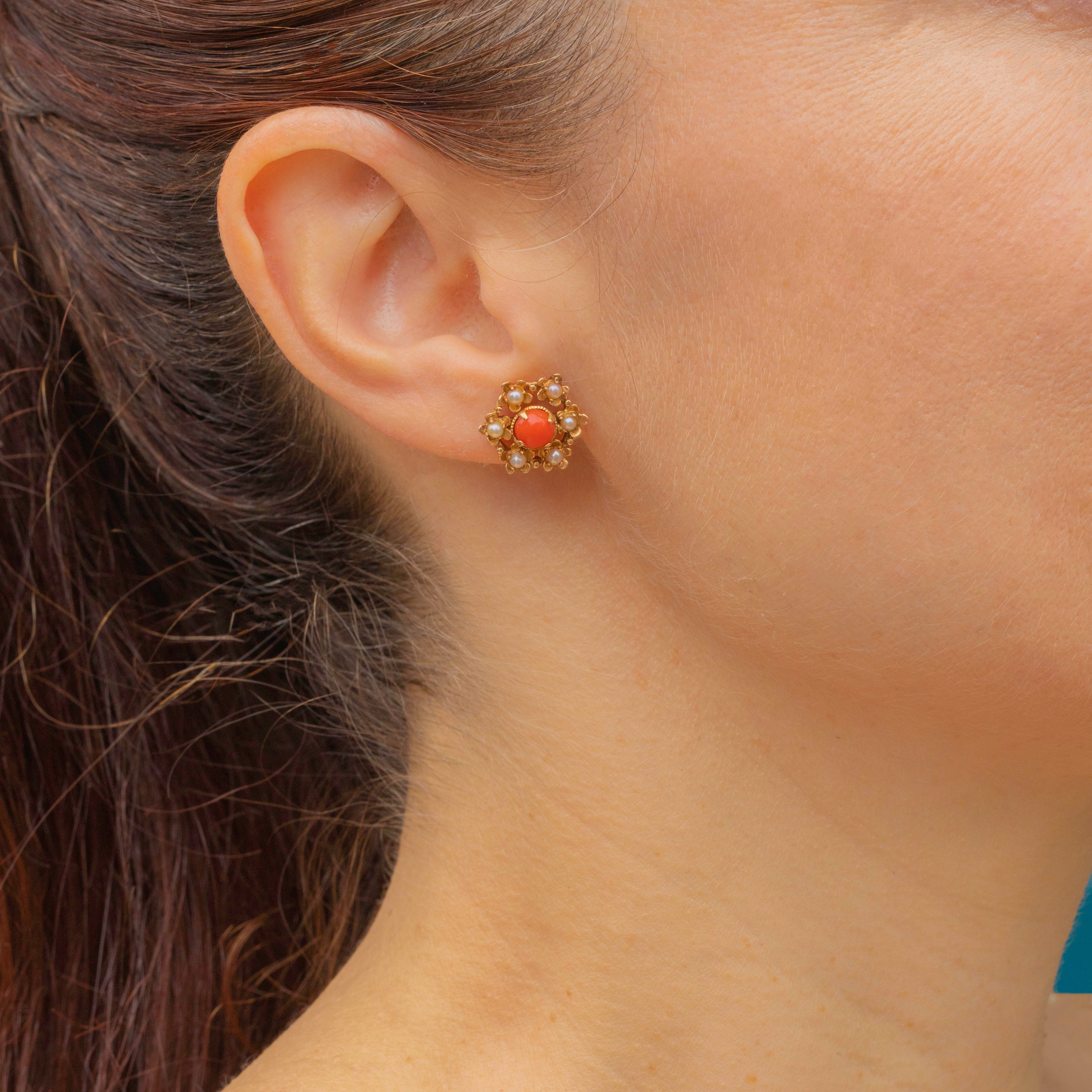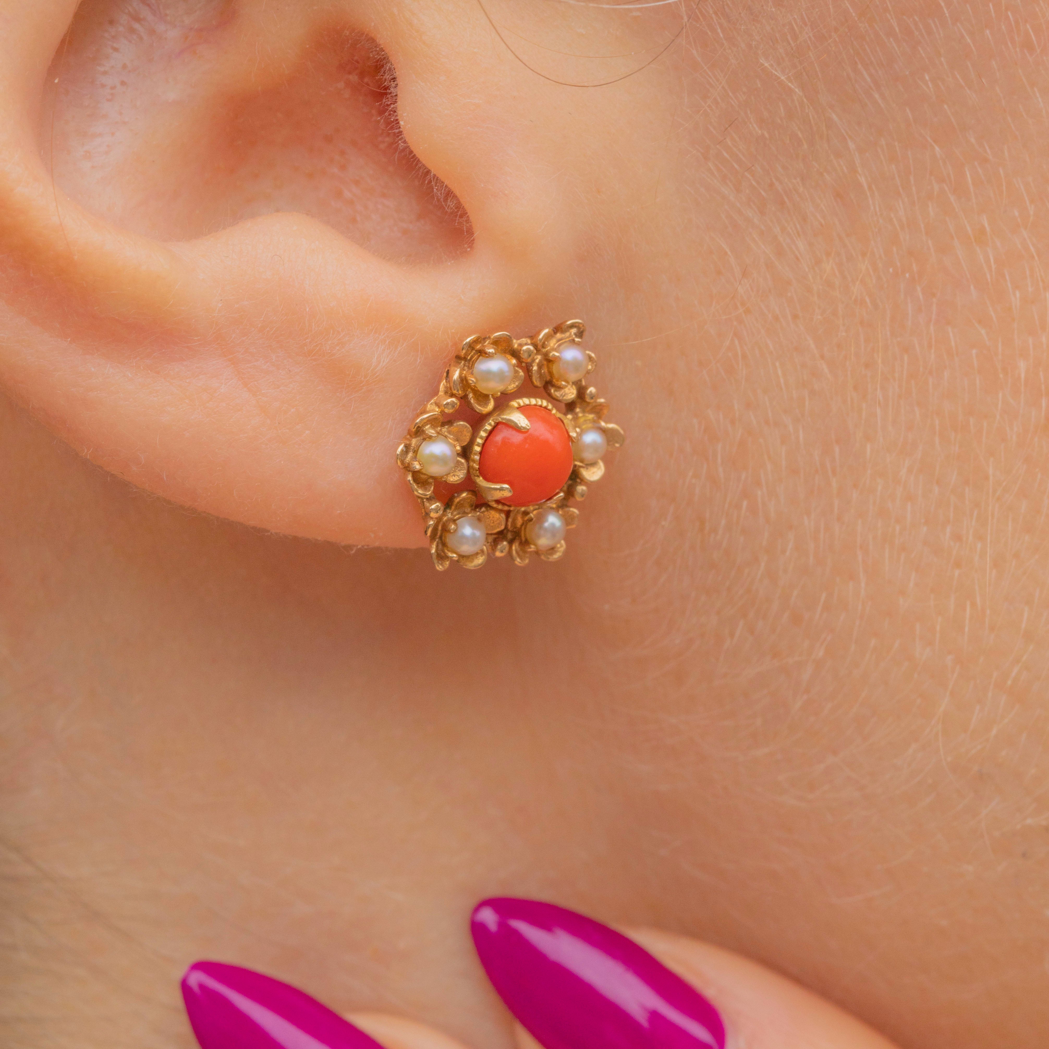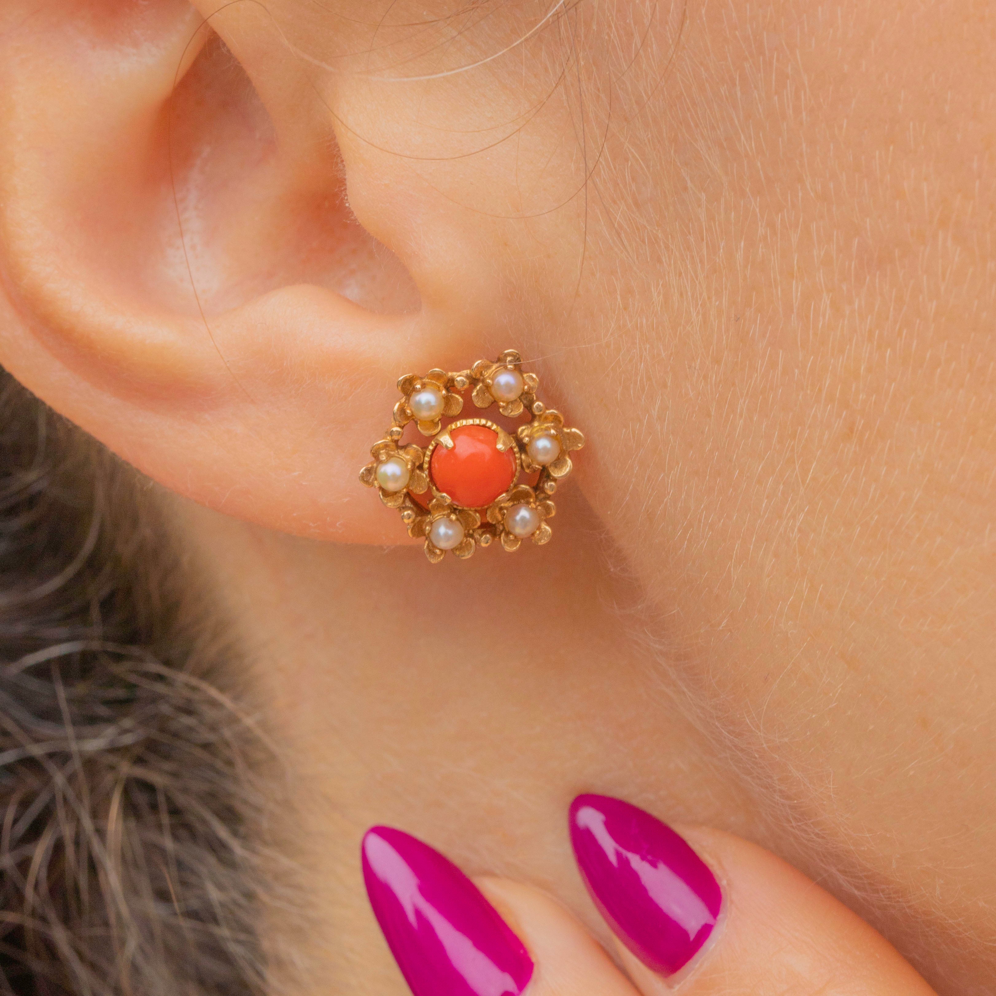 These mid-century vintage studs are formed from solid 9ct Gold and centred by apricot-hued Coral haloed by iridescent Seed Pearls, combining to create a sophisticated colour palette.