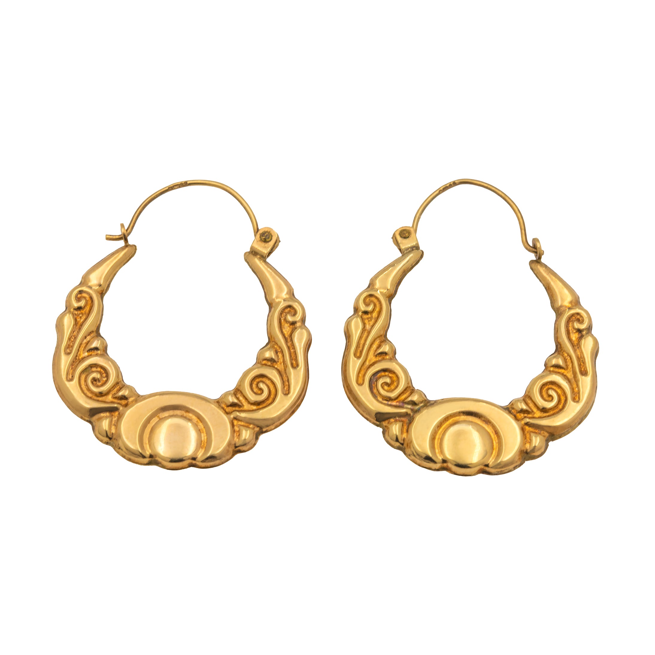 VERY GOOD-EXCELLENT. These 9ct Gold Creole hoop earrings are in wonderful condition! The details are crisp throughout and they have retained a great form. There is some darkening to the Gold that runs along the edge, but rest assured this isn't noticeable when worn. With ear levers that securely hold the earring in place, you can wear these vintage Creole hoops with the utmost confidence!