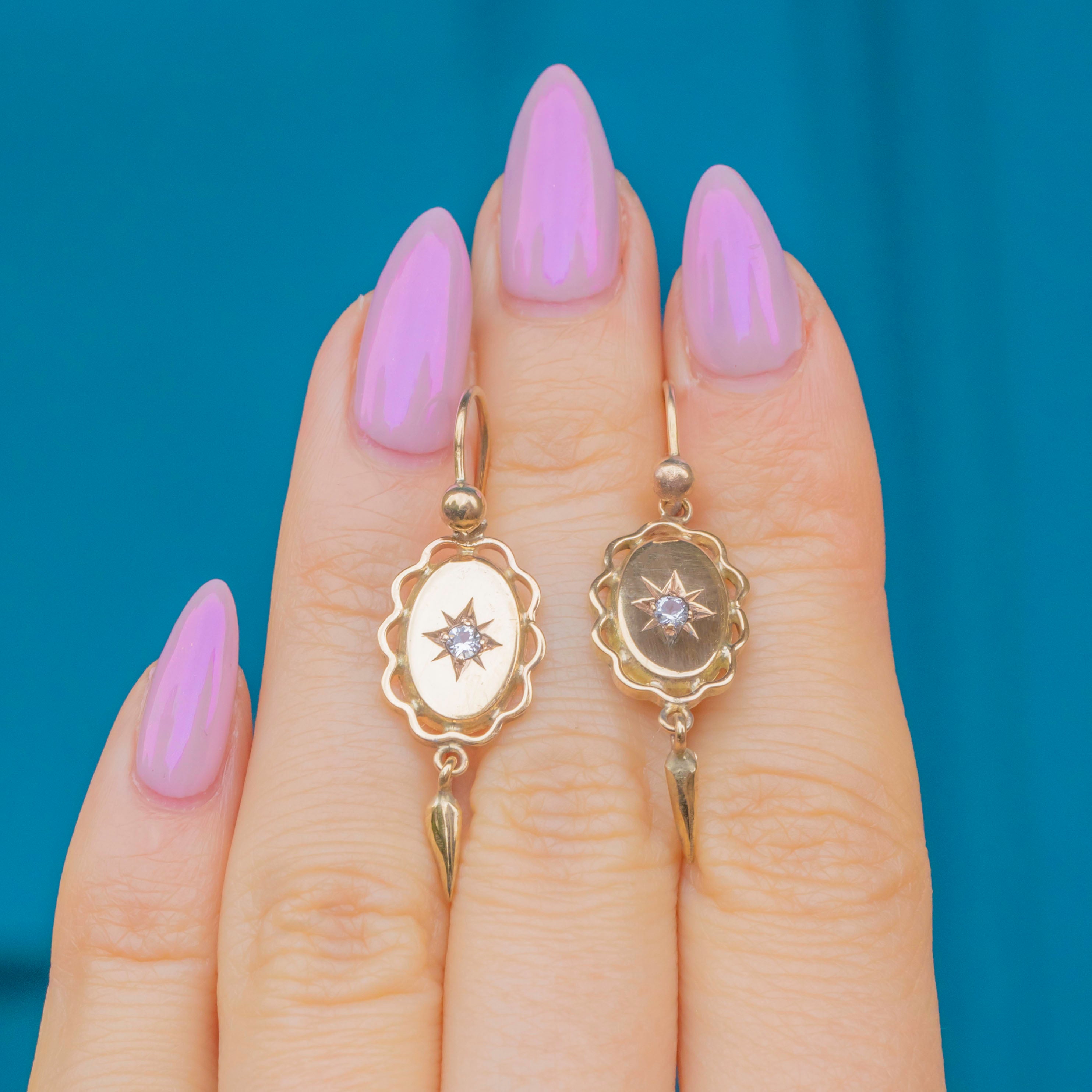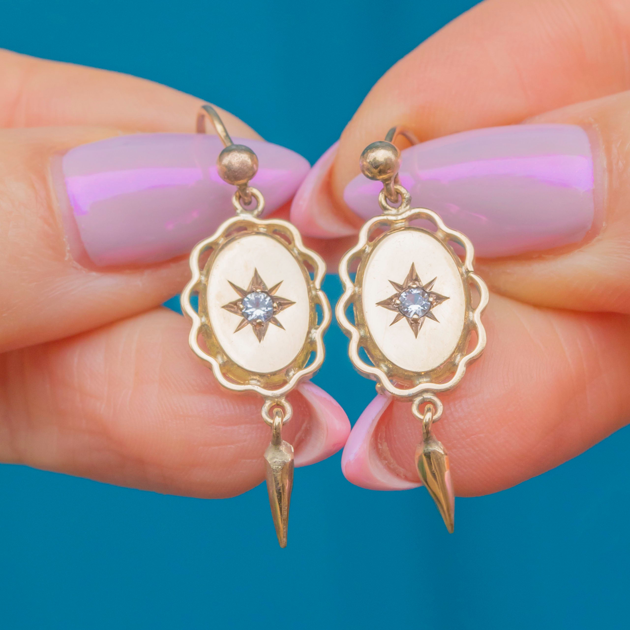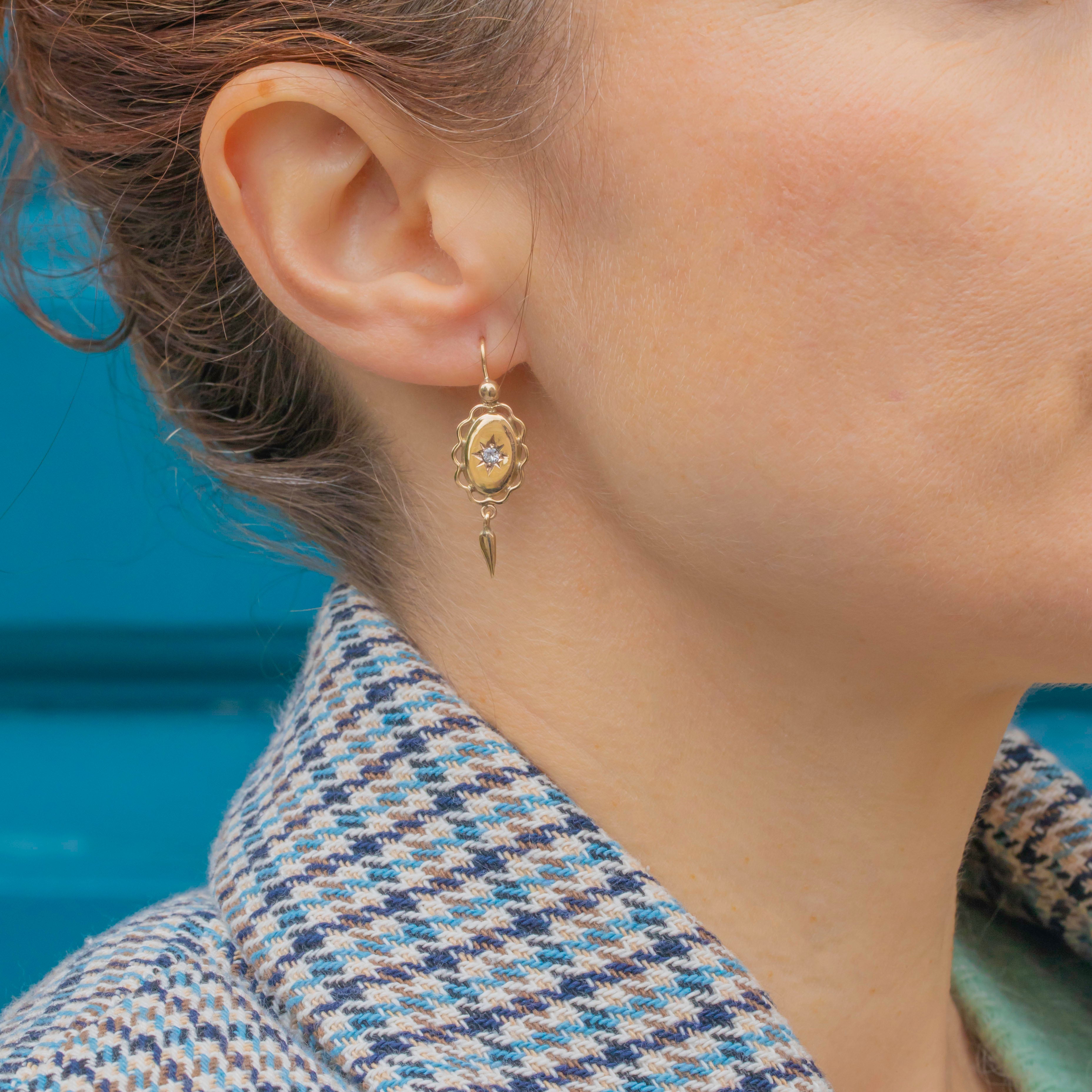 These charming solid Gold Diamond star earrings are crafted in warm 9ct Yellow Gold, each feature a twinkling natural Diamond set at the centre of each disc. The oval discs are framed by pretty scalloped edges and finished with elegant Gold drops, giving them a refined and feminine silhouette.