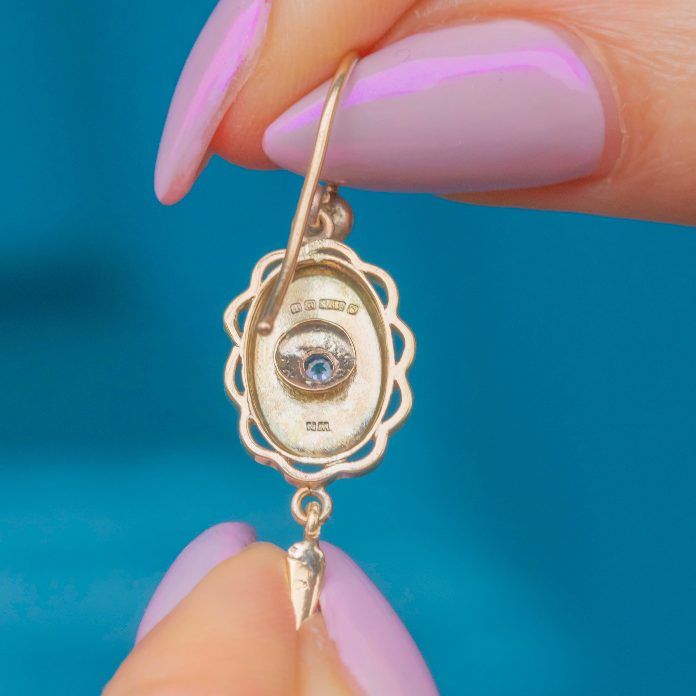 EXCELLENT: Diamonds are bright and securely set. Gold surfaces are polished with minimal age-related wear. A beautifully preserved pair of quality English-made solid Gold vintage drop earrings.