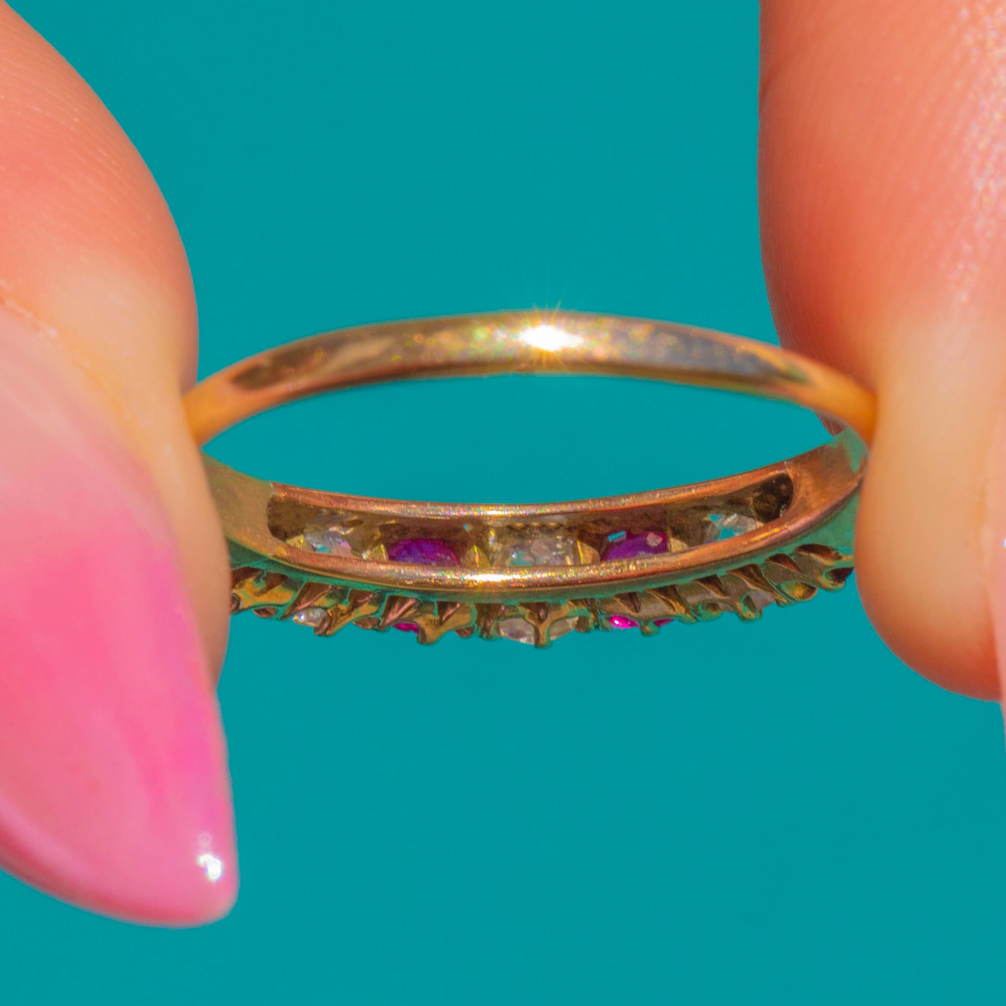 A delicate delight in 9ct Gold, this half eternity ring pairs vivid Rubies with twinkling Diamonds in a neat, alternating line. Each round stone is individually claw-set to catch the light, creating a refined ribbon of pink-red and white sparkle across the finger.