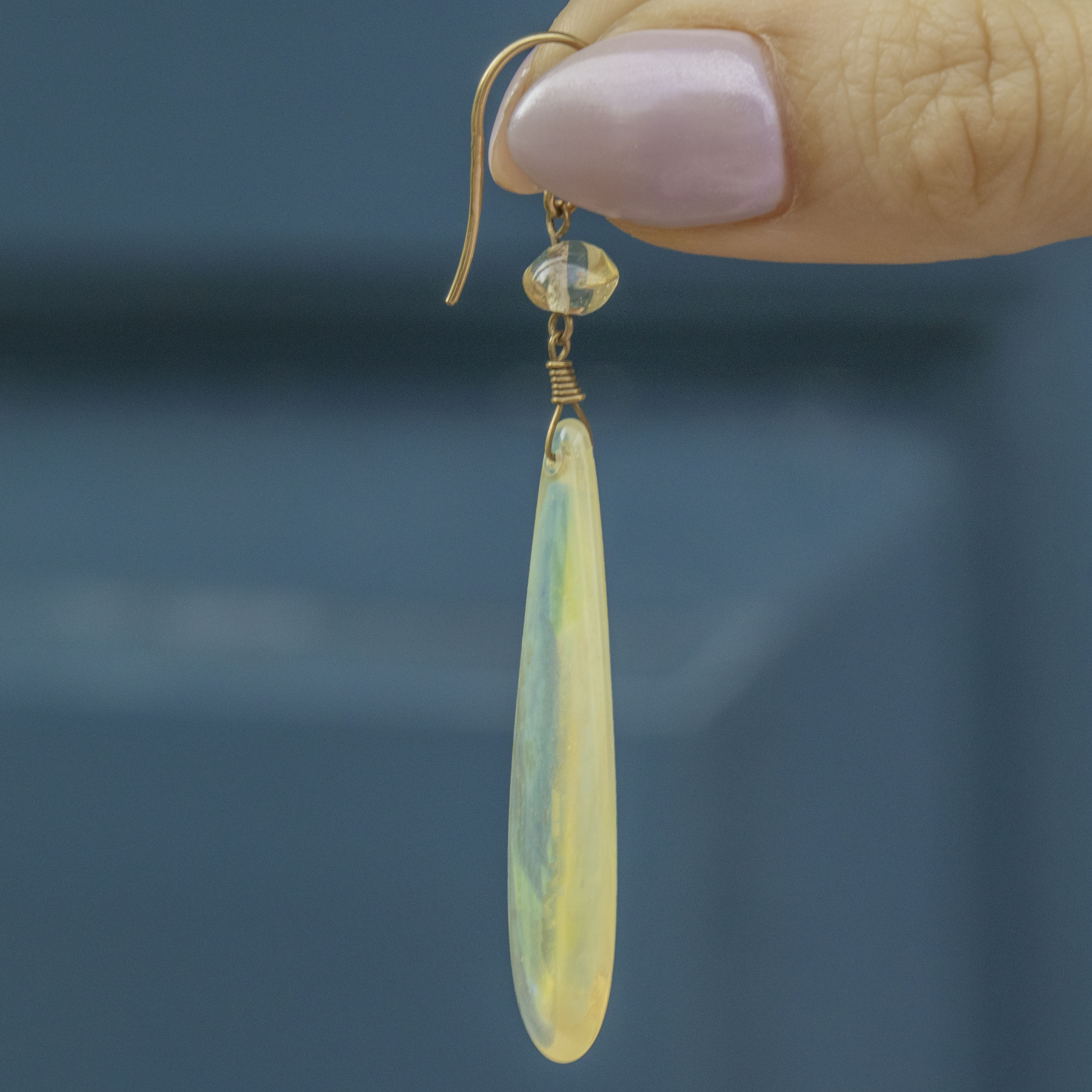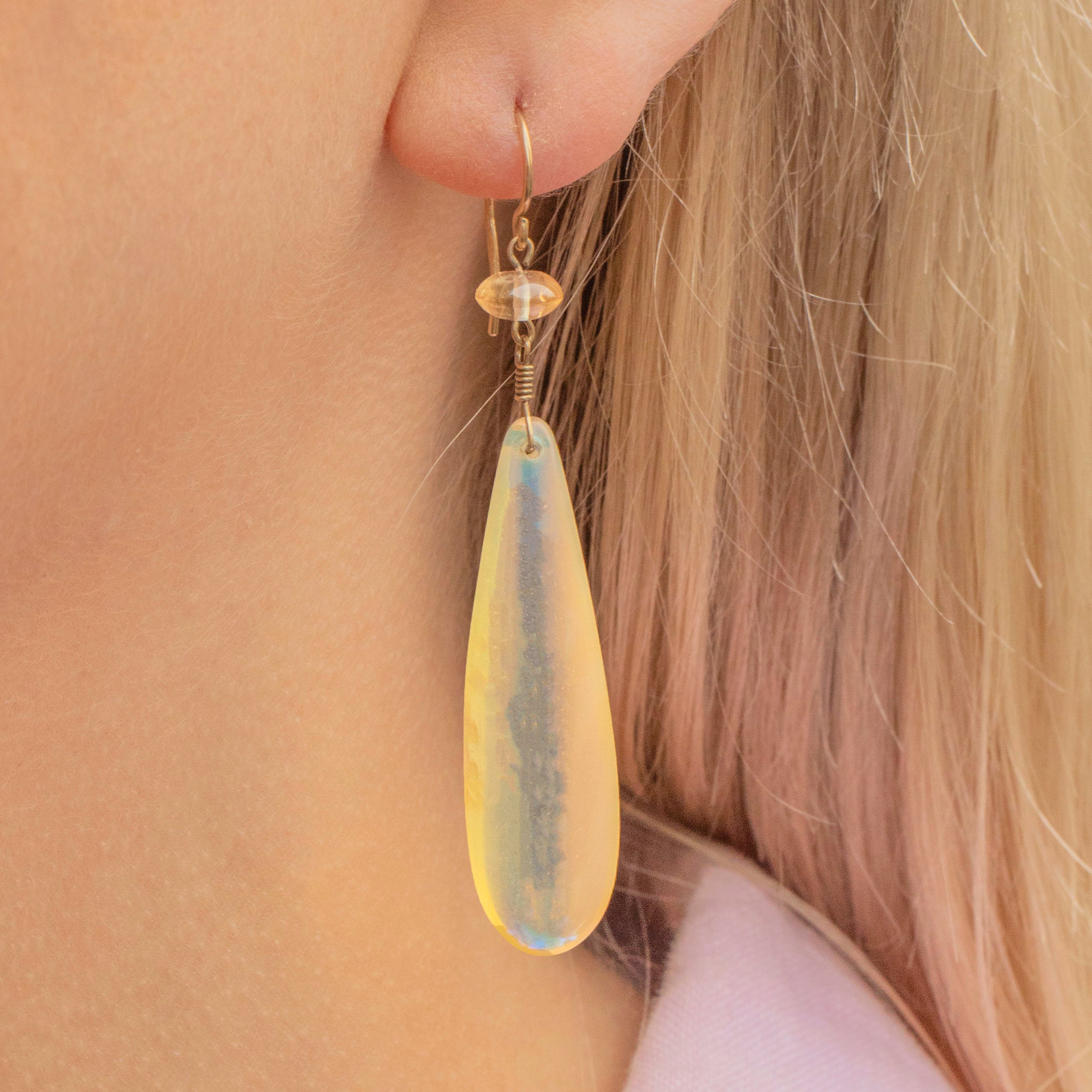 VERY GOOD. These 9ct Gold Dragon’s Breath drop earrings are in very good condition, with the glass displaying vibrant opalescent hues. There is minor wear on the surface of the glass, which is only visible under close inspection with a jeweller's loupe. The 9ct Gold hooks are hallmarked to the year 1990, with a gorgeous saturated tone, and provide comfortable and confident wear