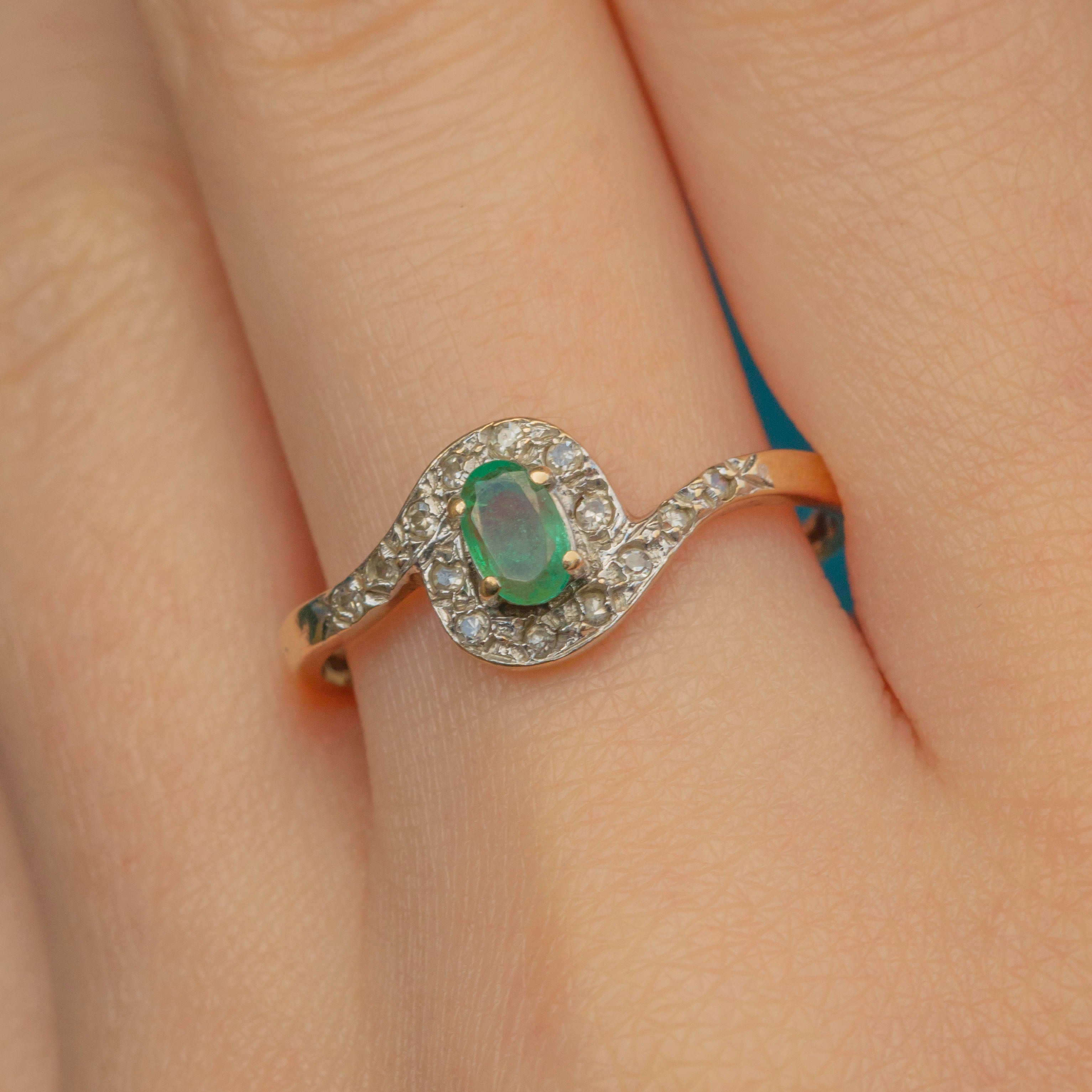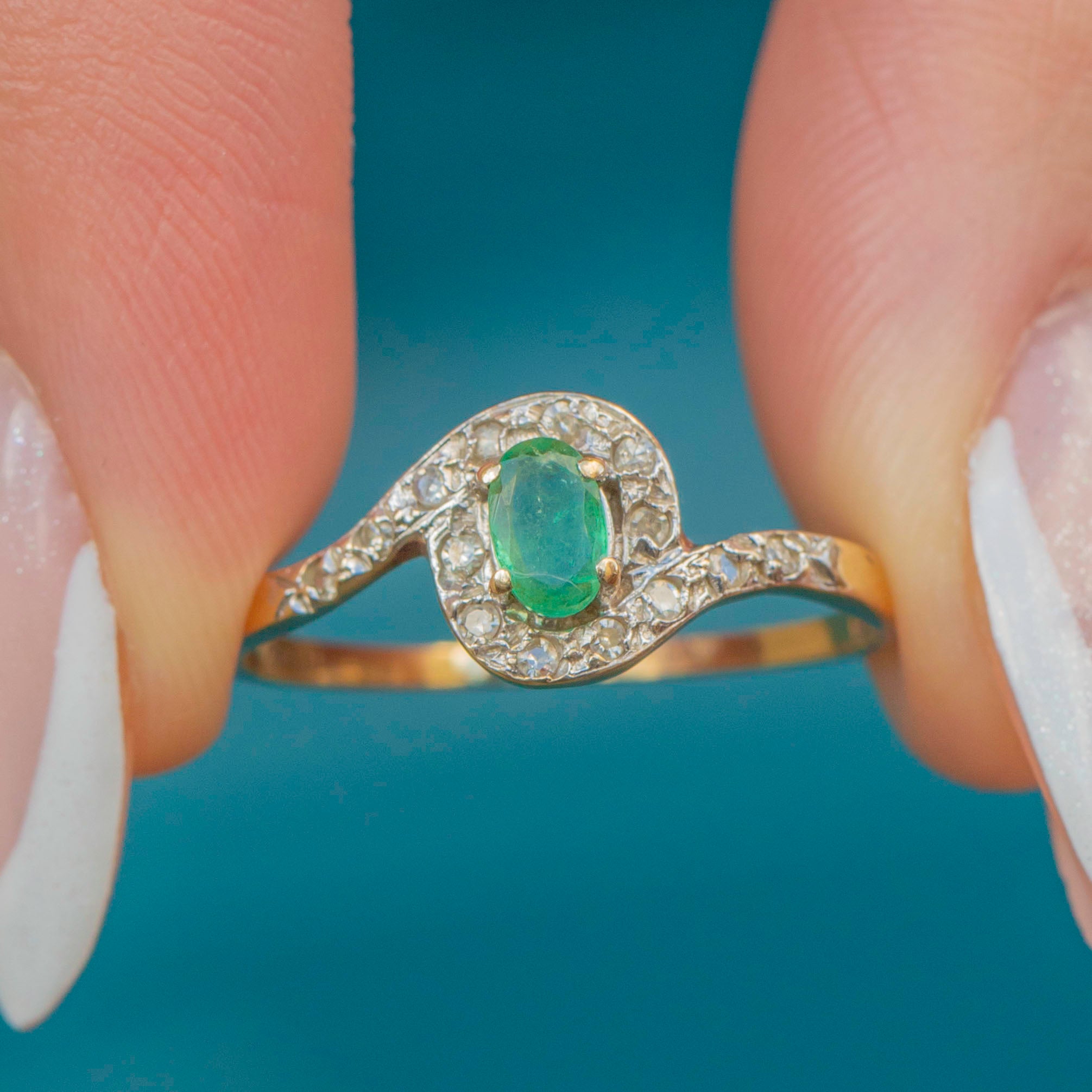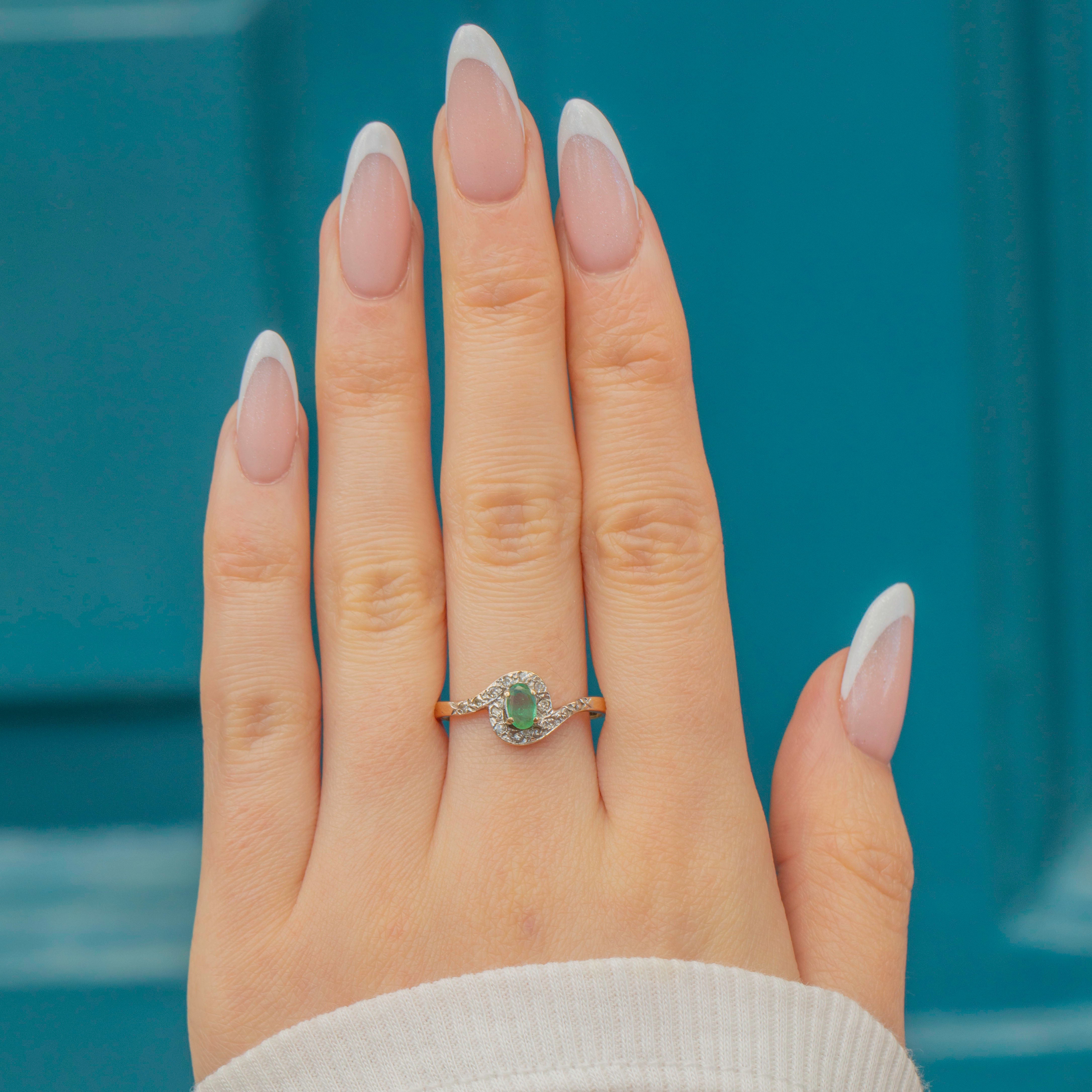 Crafted from buttery 9ct Gold, in her centre sits a vibrant Emerald, radiating fresh green hues. She is adorned by scintillating Diamonds, arranged in a gorgeous Tourbillon swirl style, creating an eye-catching piece.