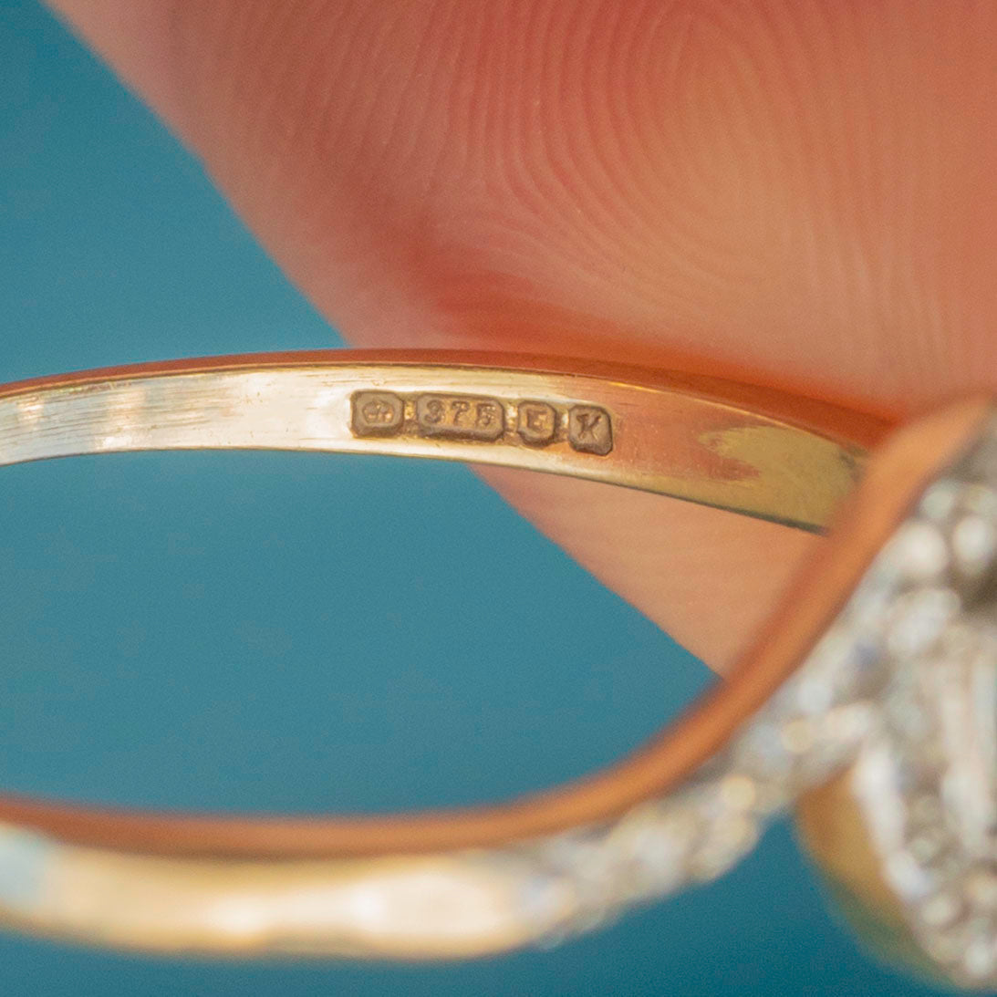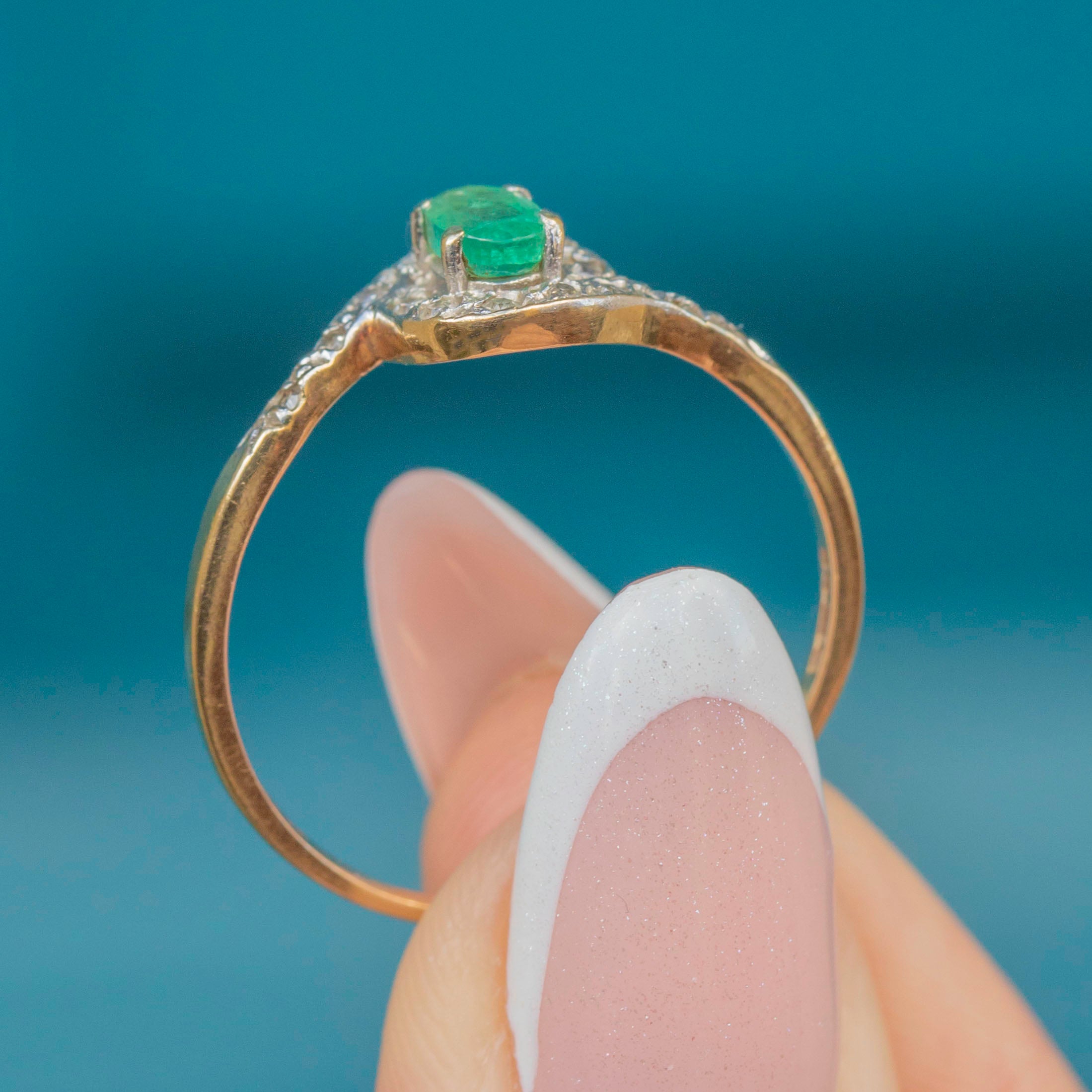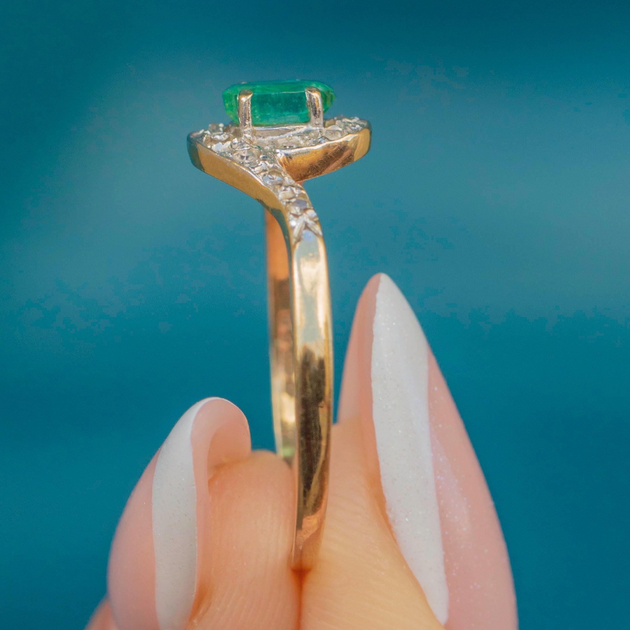 VERY GOOD-EXCELLENT: This 9ct Gold Emerald Diamond tourbillon ring is in lovely condition. The gemstones are all present and securely set. There are some inclusions to the Emerald - a little nod to Mother Nature! There is some minor wear throughout, though this is commensurate with age and does not detract from the beauty of the piece. With a full set of hallmarks, we can date this vintage treasure to 1984!