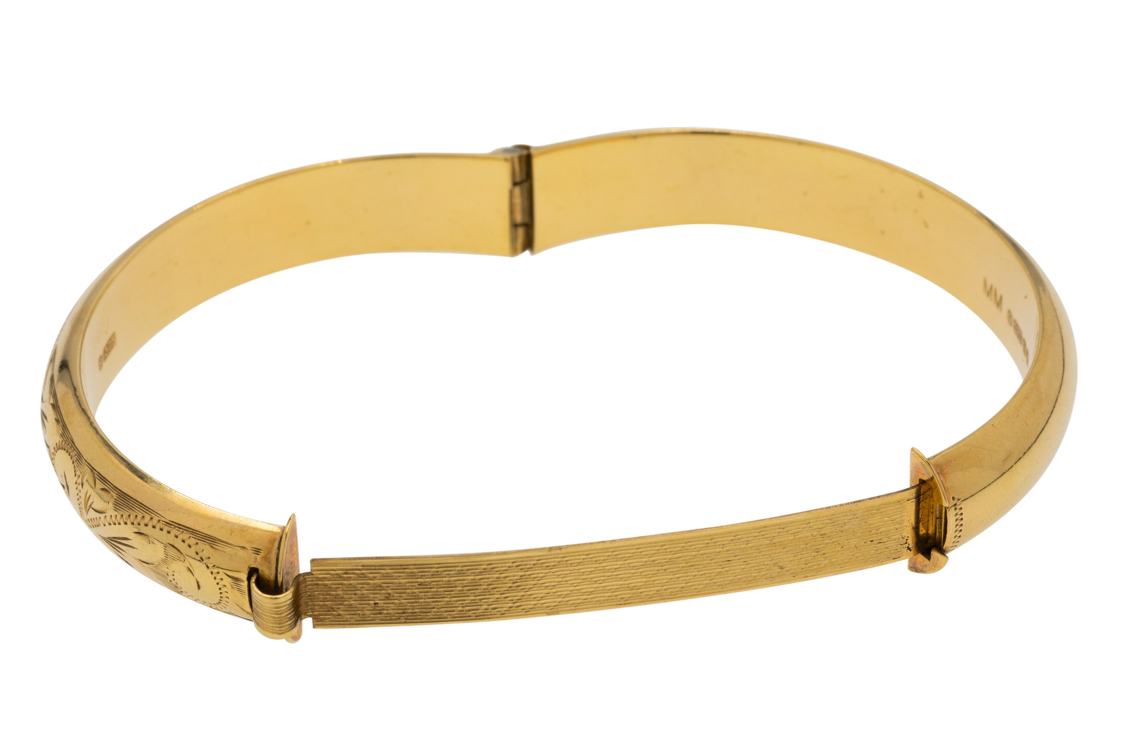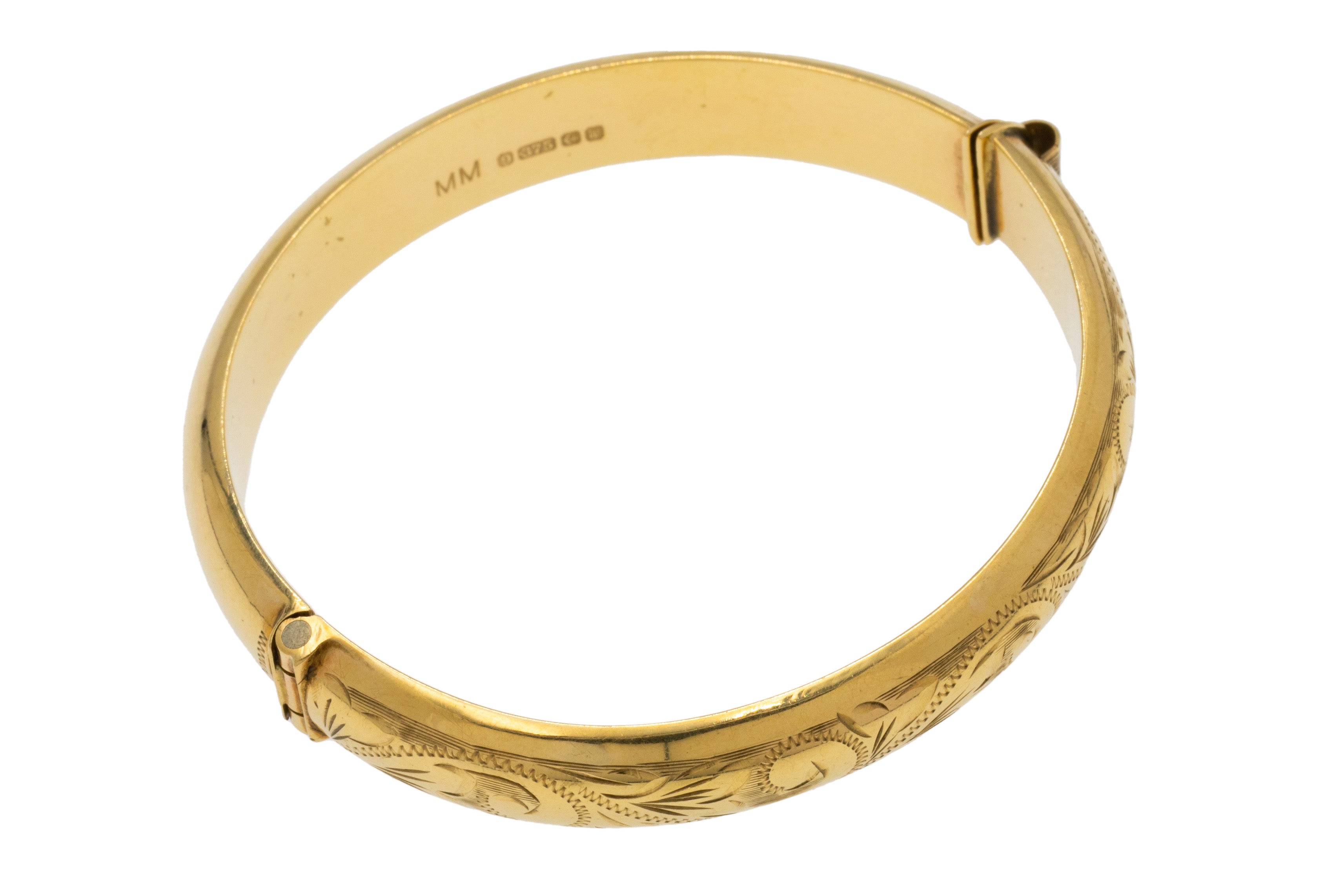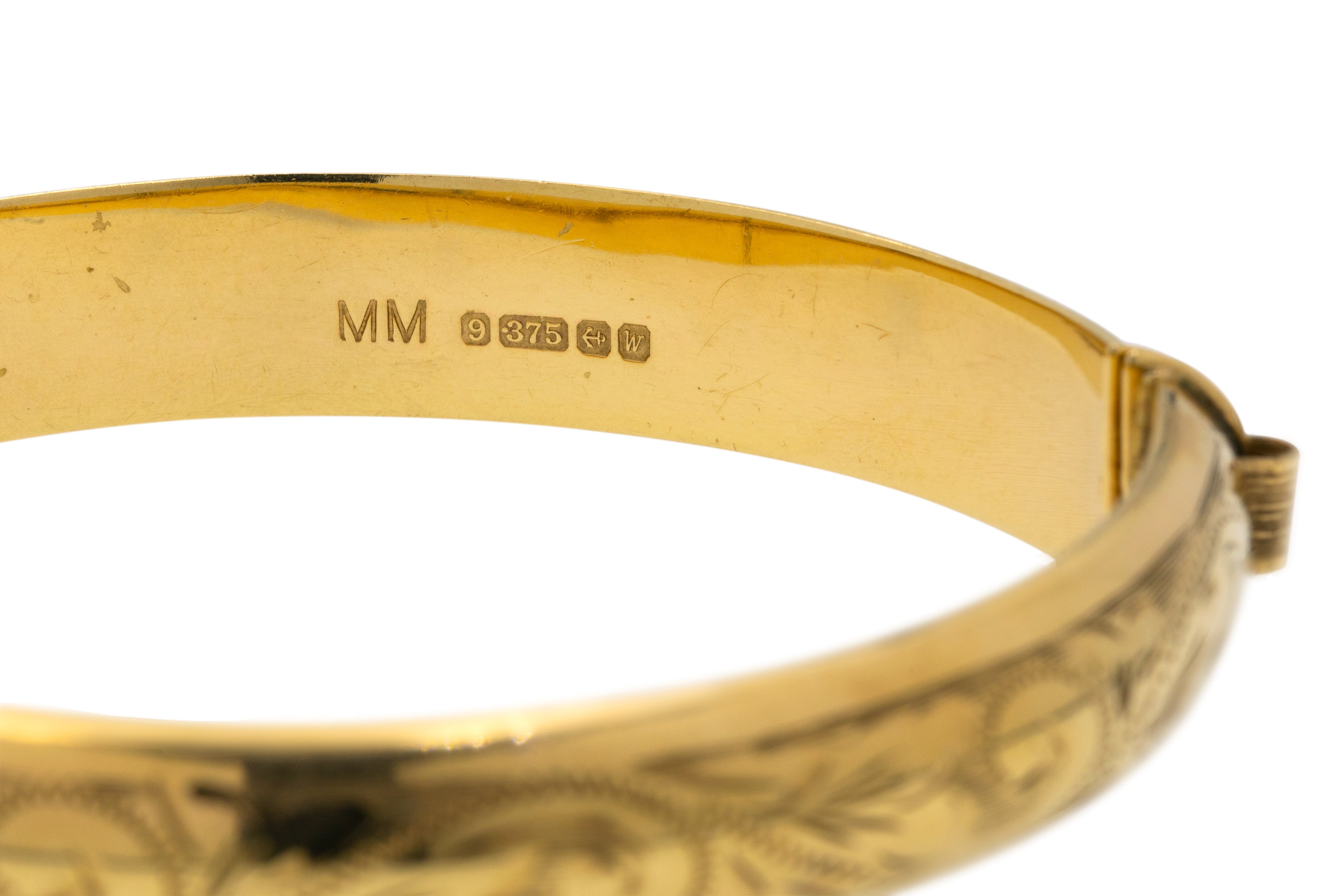 HALLMARKS: MM Makers mark, 9, .375, Birmingham Anchor, Date letter W for the year 1971 inside bangle.