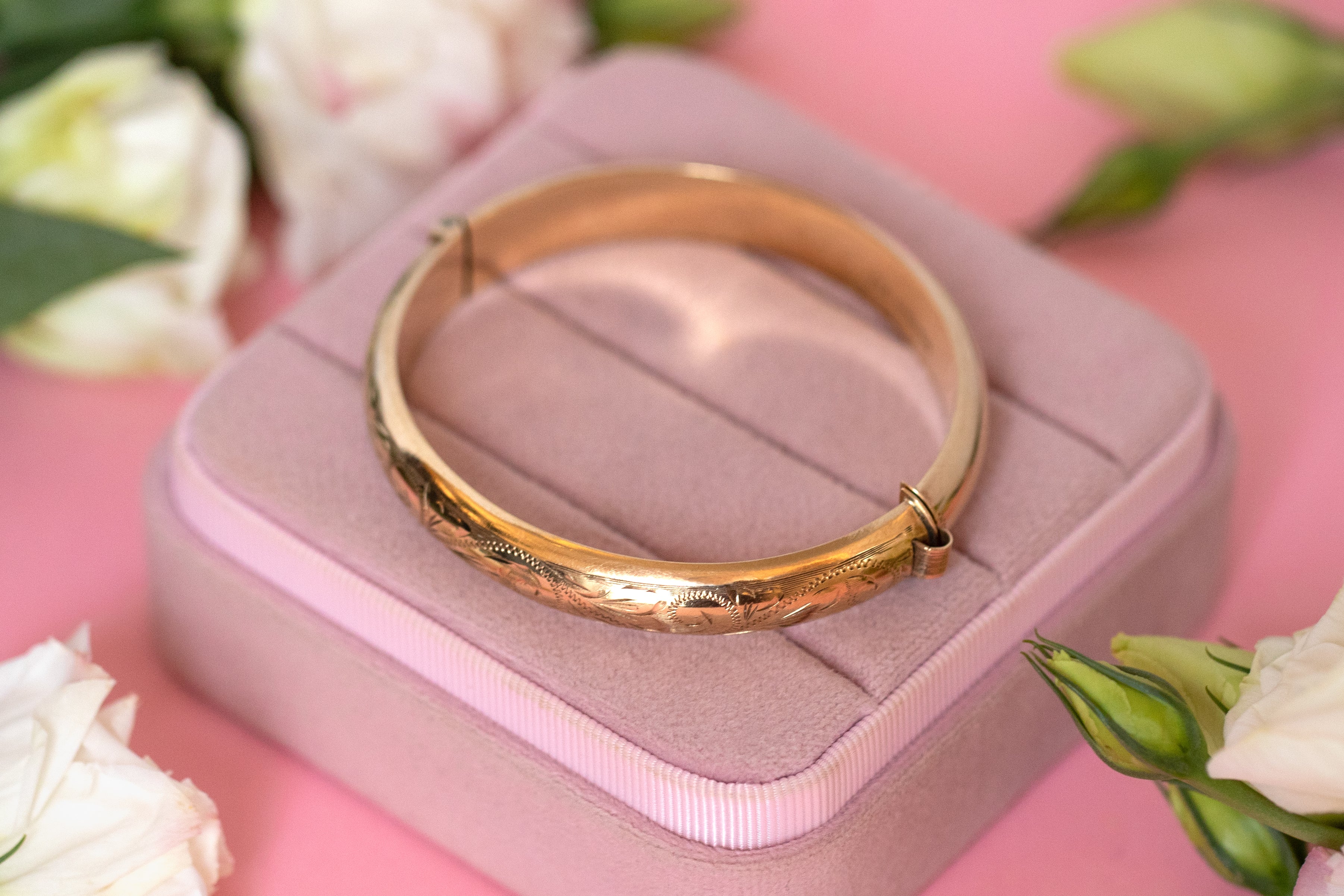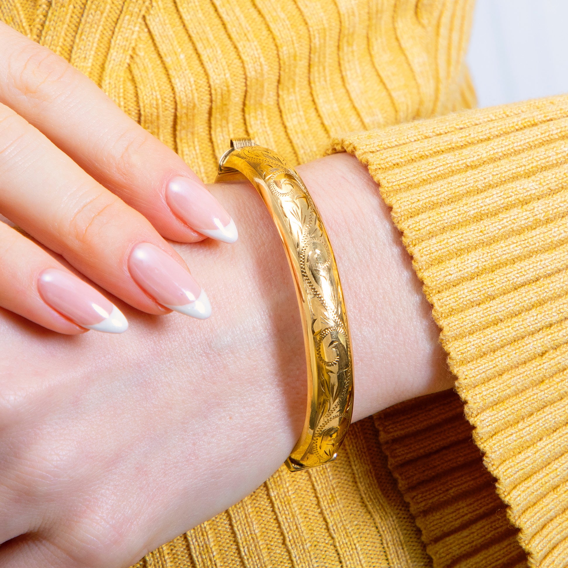 EXCELLENT. This 9ct Gold engraved bangle is in excellent condition! Her engravings are crisp and add bundles of femininity and charm. The slide clasp is in perfect working order and as she always remains connected, adds an extra layer of security. At the clasp, there is a small area of darkening, but other than this her Gold is saturated and possesses great reflective qualities. She was made for your vintage jewellery collection!