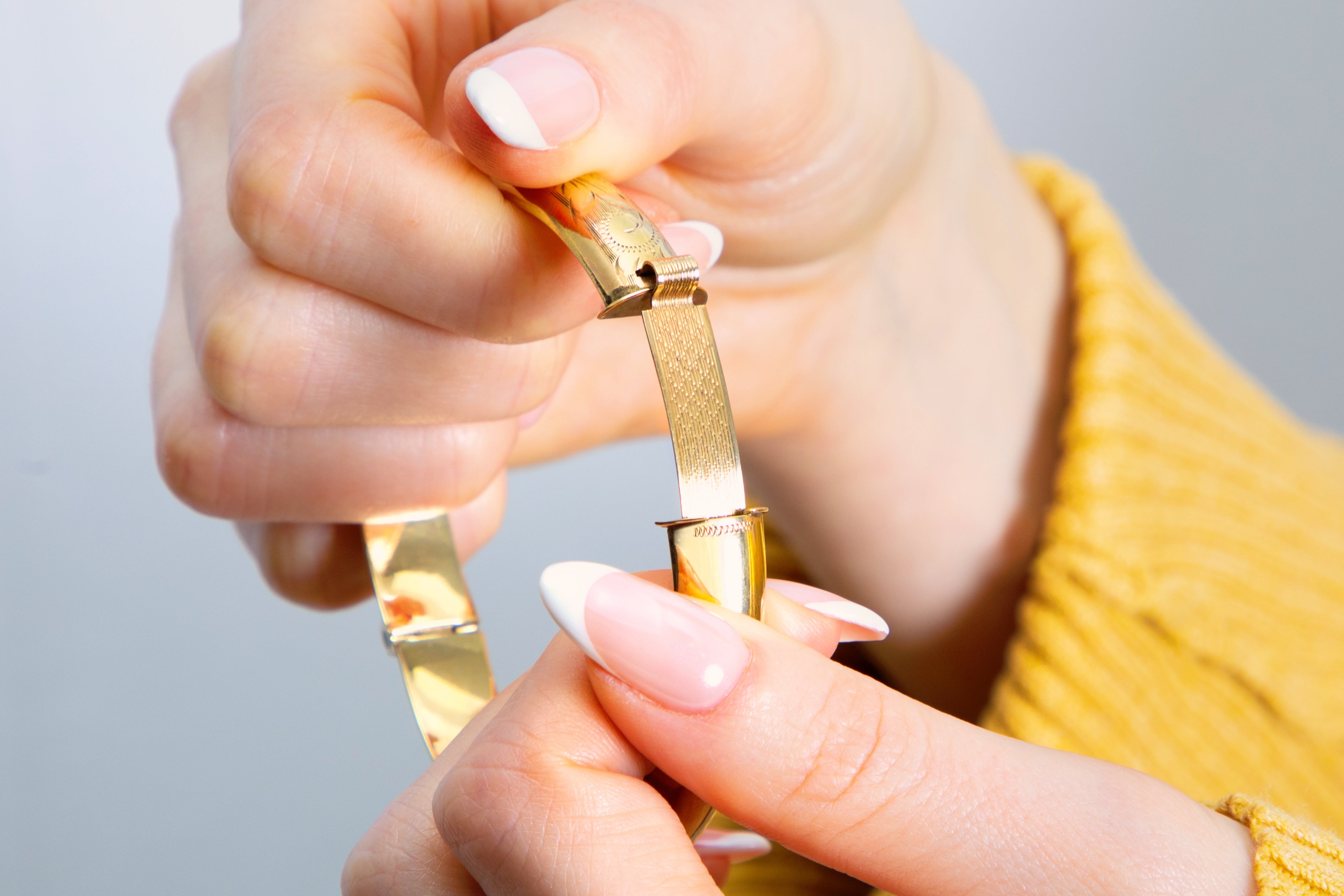 The domed form of this vintage Gold bangle gives her a chunky feel, but being hollow is still light enough to comfortably wear from day to night. The satisfying slide lock on this engraved bangle even displays geometric detailing; an indication there has been attention to detail when developing her sleek design!
