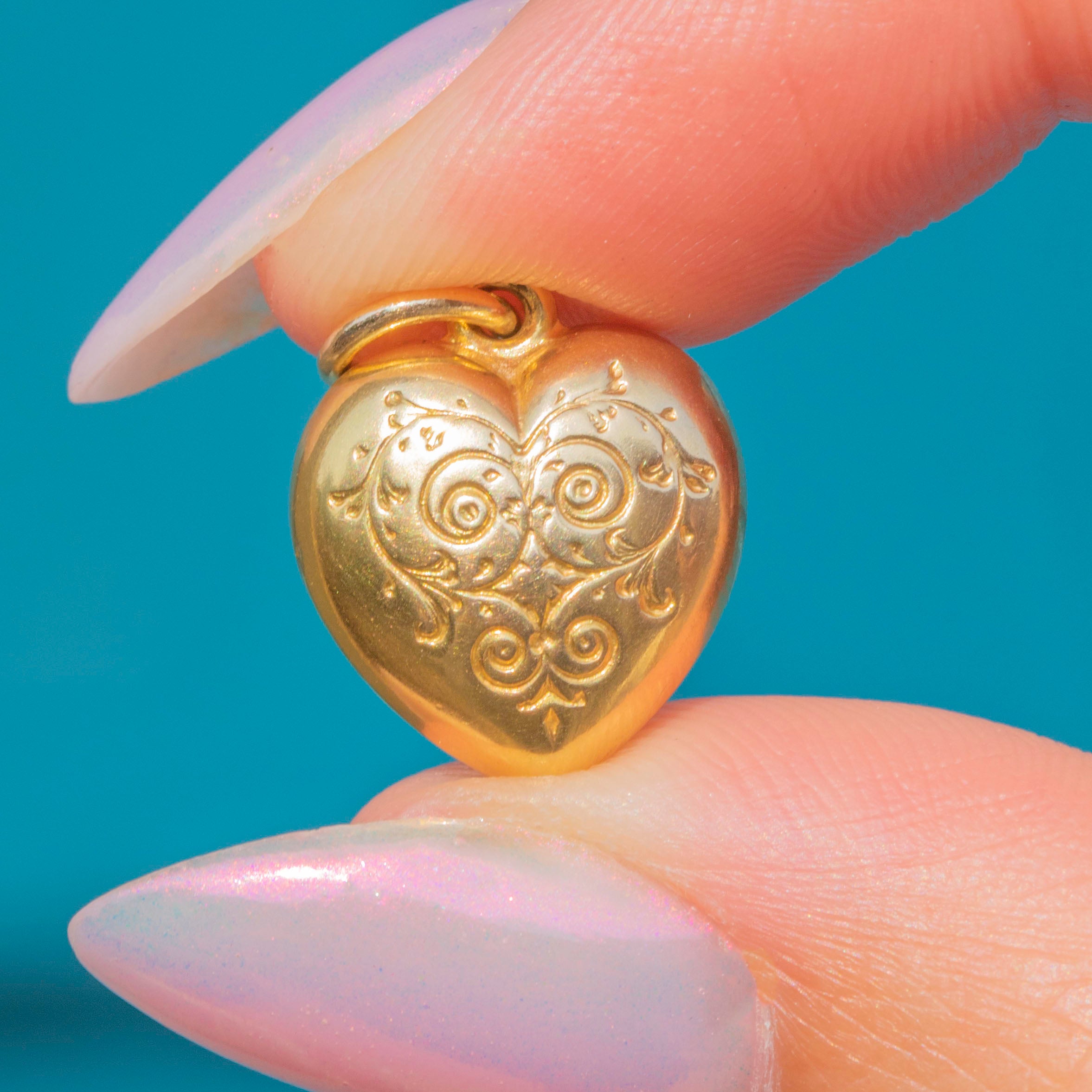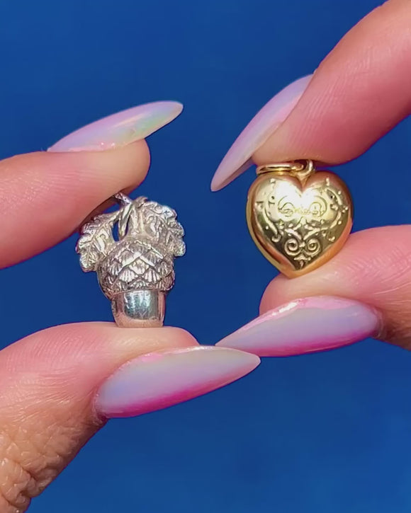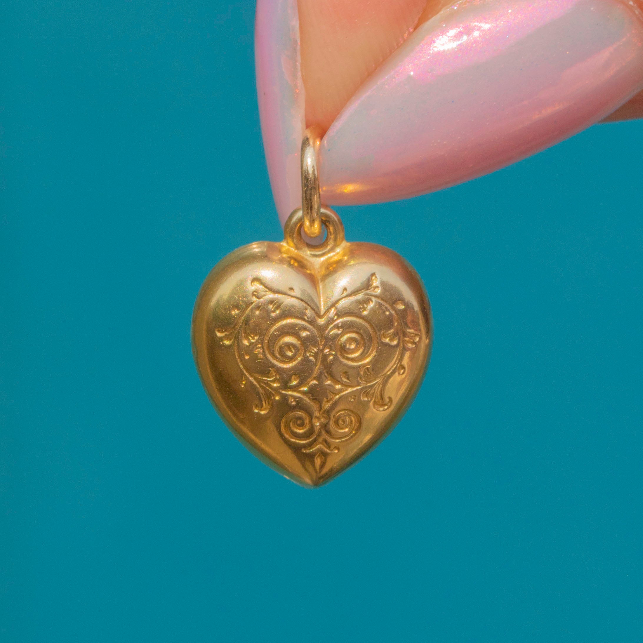 This 9ct Gold engraved puffy heart charm exudes vintage prestige! Crafted from bright Gold, the surface of the heart displays beautiful engravings, bringing ample texture to this dainty vintage pendant.