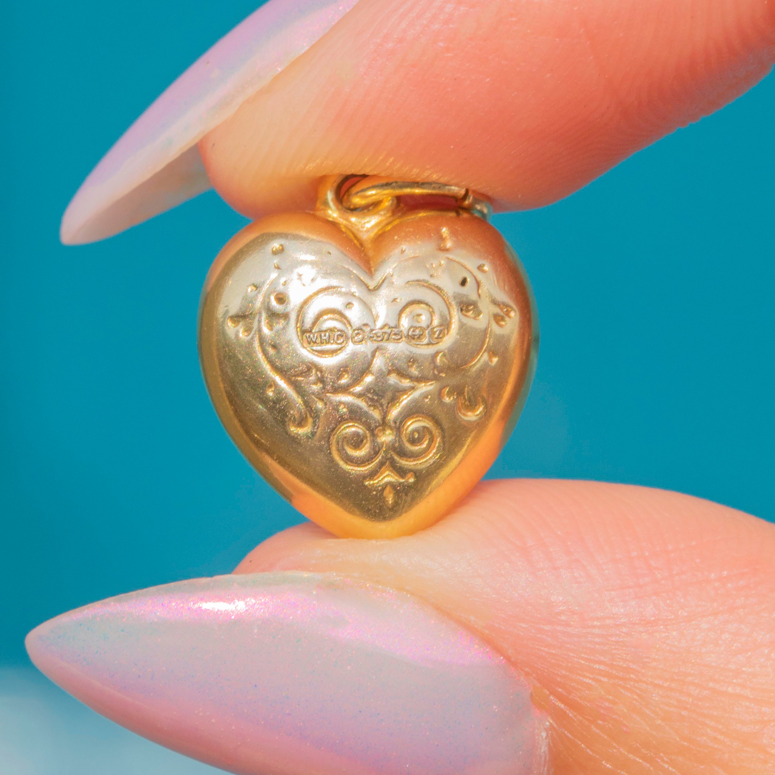 EXCELLENT: This 9ct Gold engraved puffy heart charm is in excellent condition. The Gold is buttery and her engraved details are defined with no signs of surface wear. With so much wear potential, this vintage Gold heart pendant can be worn and enjoyed every day!
