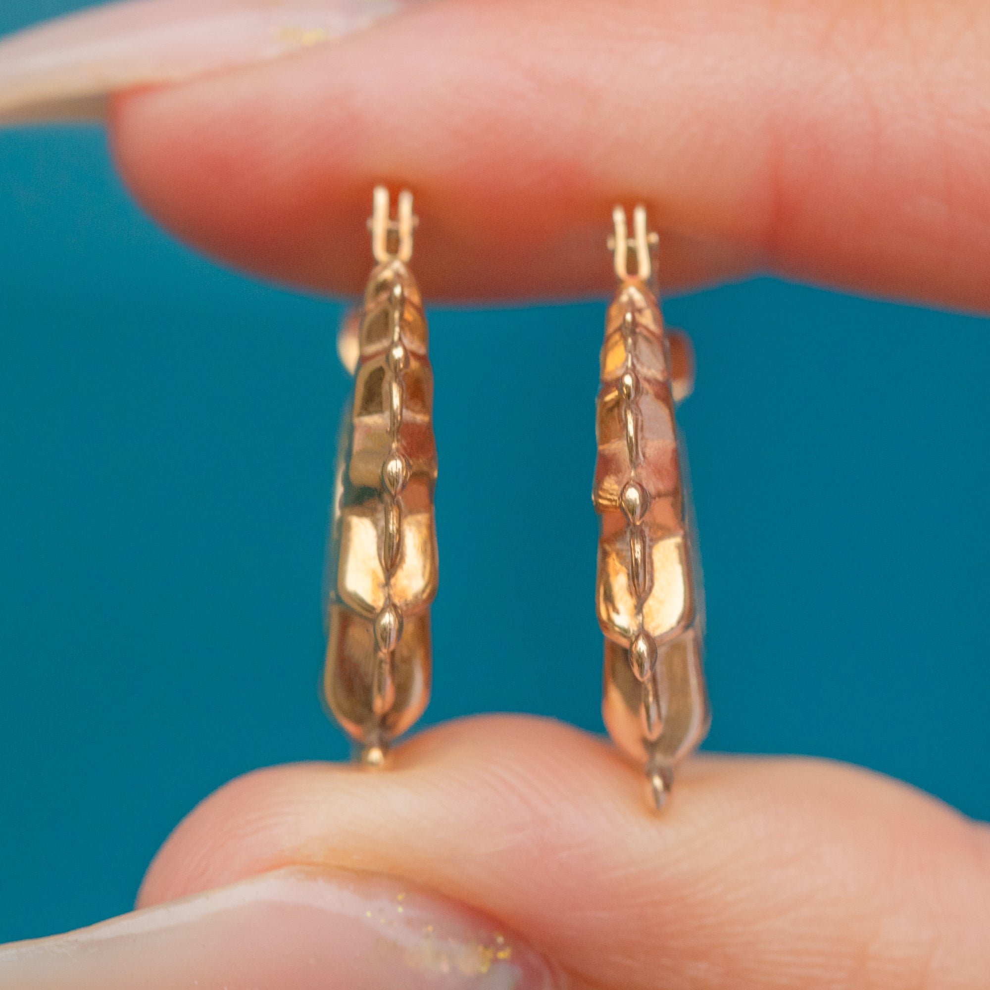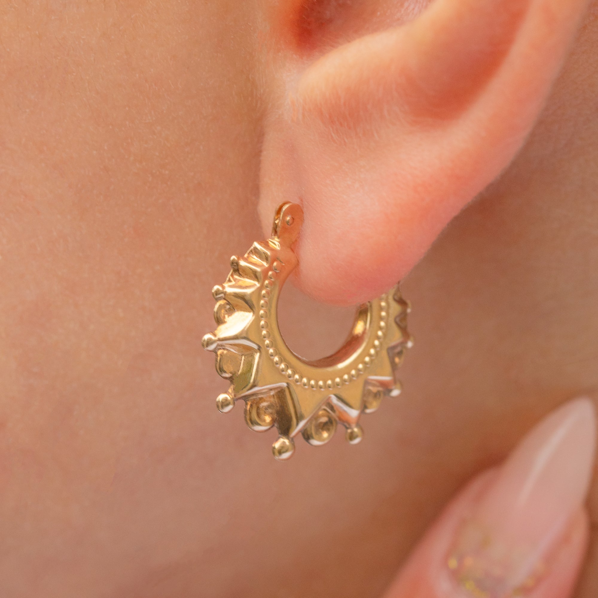 These Vintage 9ct Gold Creole hoop earrings are styled in the Etruscan revival manner, with richly textured detail and an elegant curved form. Their bold yet wearable design makes them a versatile pair that carries both antique inspiration and timeless appeal.