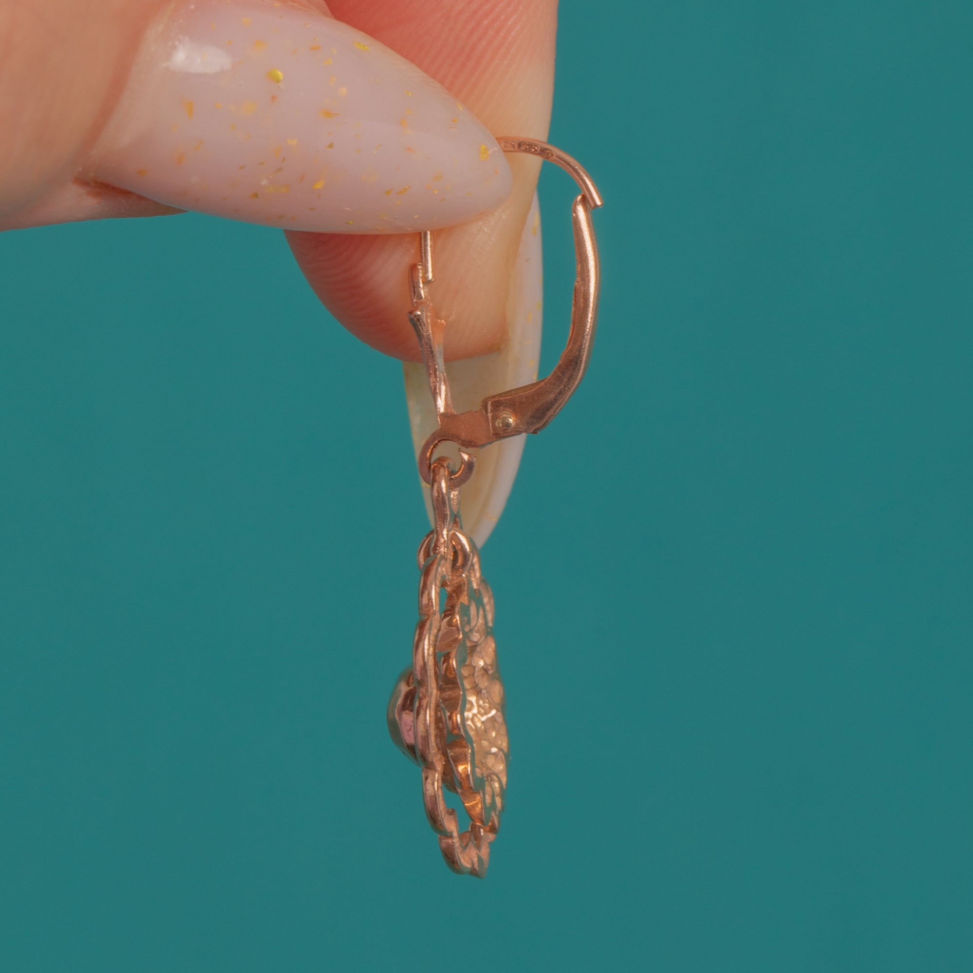 Delicate and beautifully detailed, these Etruscan-style 9ct Gold drop earrings showcase openwork rosettes with scalloped “petals,” a raised domed central boss and a fine beaded collar. The articulated construction gives them a graceful, fluttering movement, while the foliate-detailed ear wires add a refined finishing touch.