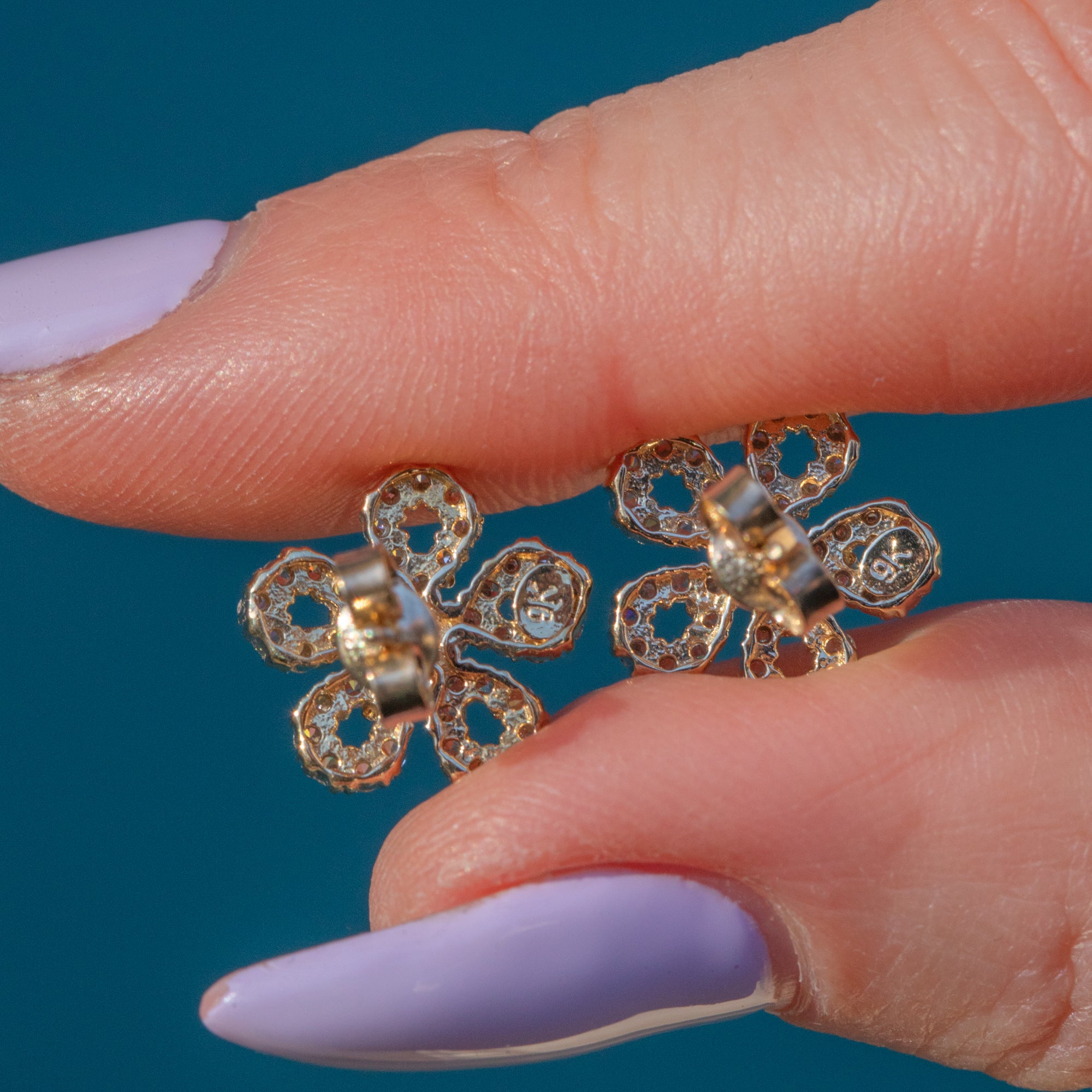 EXCELLENT. These 9ct Gold flower stud earrings are in excellent condition. The Cubic Zirconia are all present and securely set, free from surface wear and providing exceptional sparkle. The posts are robust and the butterfly backs are snug-fitting, allowing you to wear these romantic flower earrings with absolute confidence!