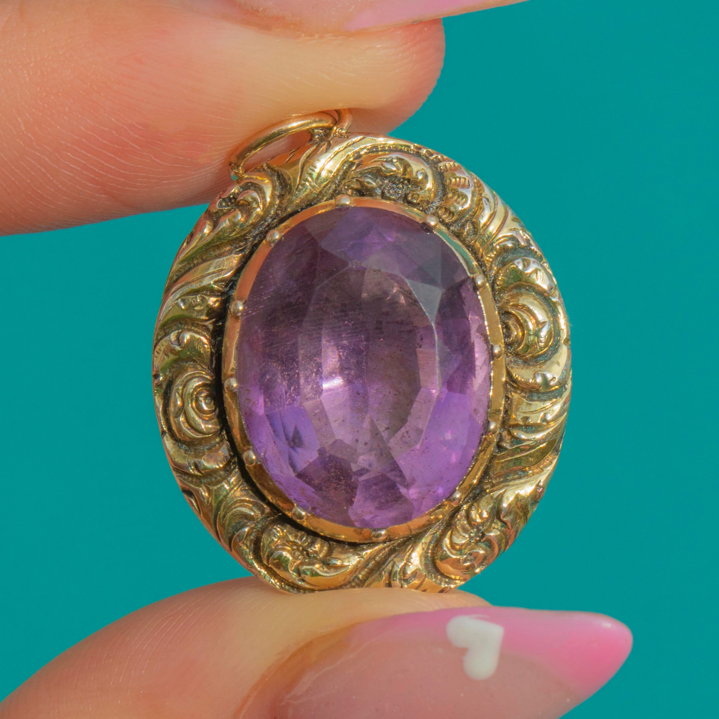 VERY GOOD: The chased Gold frame retains crisp detailing, and the closed-back setting remains secure and well-preserved. The Amethyst shows soft facet wear and gentle signs of age, typical for a piece of this era. There is some evidence of a previous conversion on the back, but this cannot be seen looking front on.