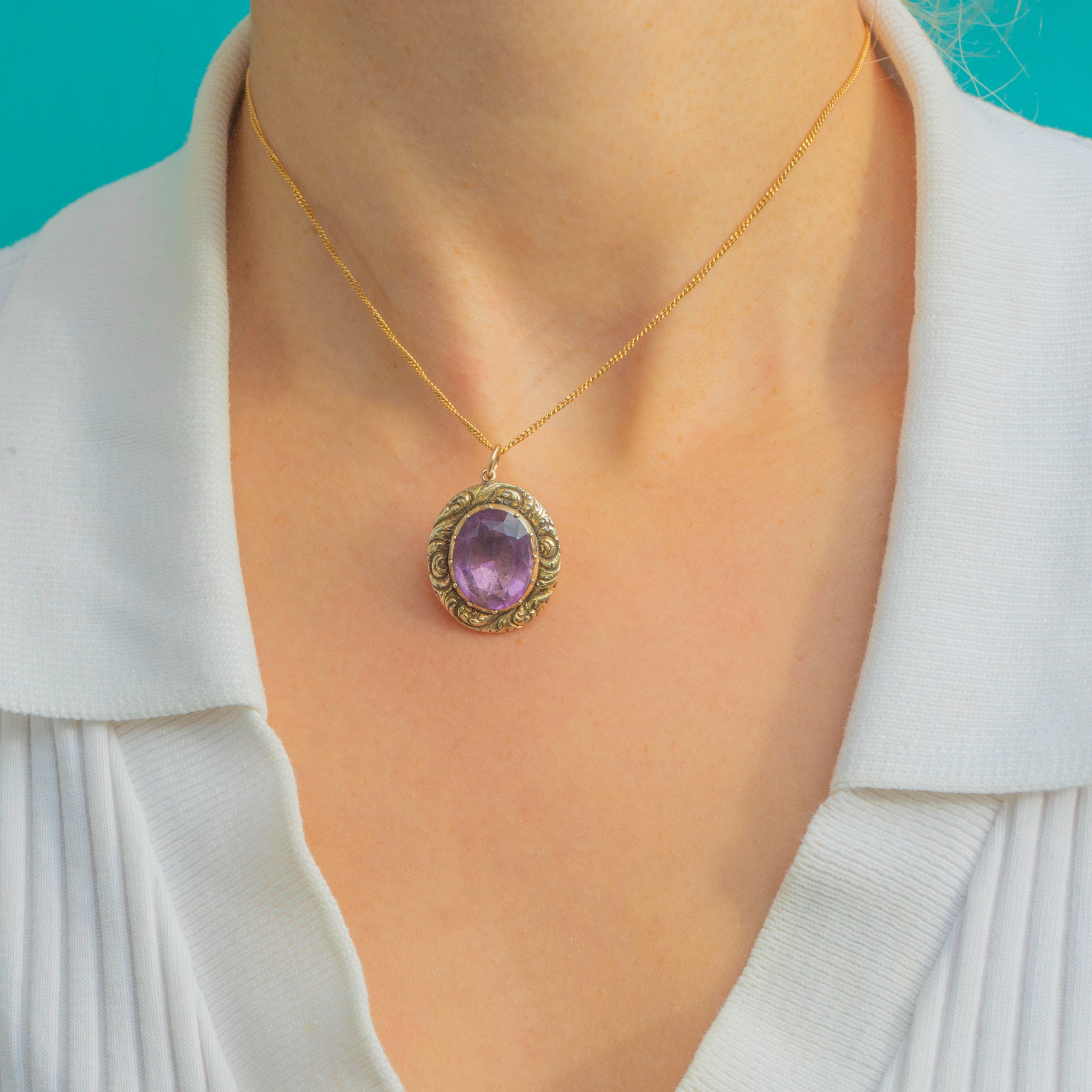 This beautiful Georgian Amethyst pendant showcases the rich colour and romantic craftsmanship of the late 18th to early 19th century. The deep purple Amethyst is faceted and mounted within an ornate chased Gold frame, its scrolling details adding texture and movement to the design. The gemstone glows warmly in its closed-back setting, a hallmark of Georgian jewellery, enhancing its inner fire and charm.