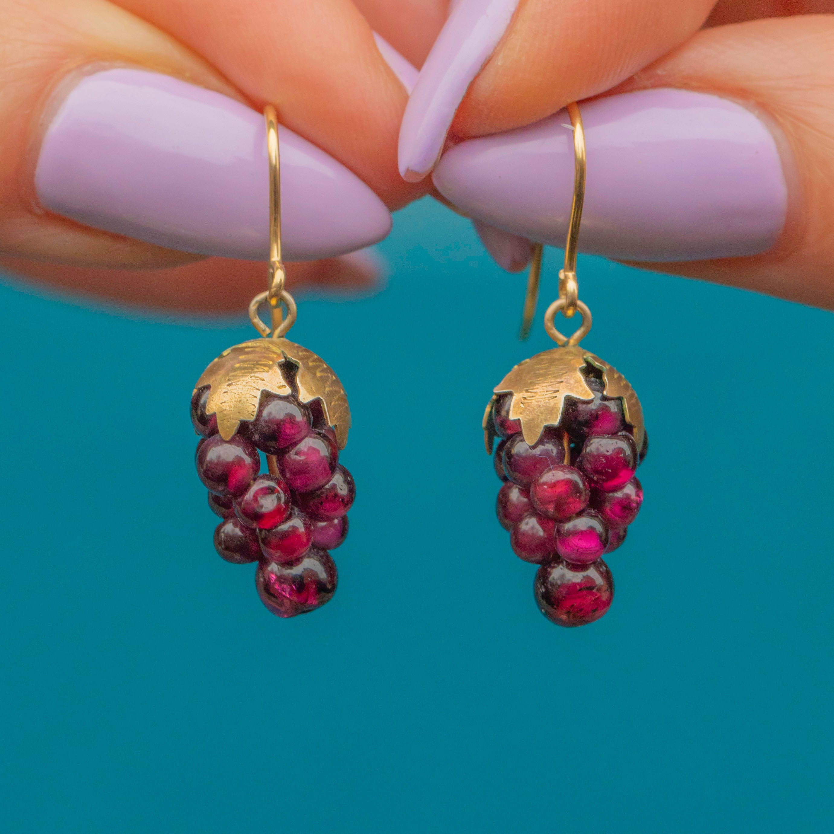 These 9ct Gold Garnet grape earrings are so adorable! Crafted from buttery 9ct Gold, these earrings feature a cluster of deep purple Garnets, formed into delicate grapes suspending from a Gold vine.