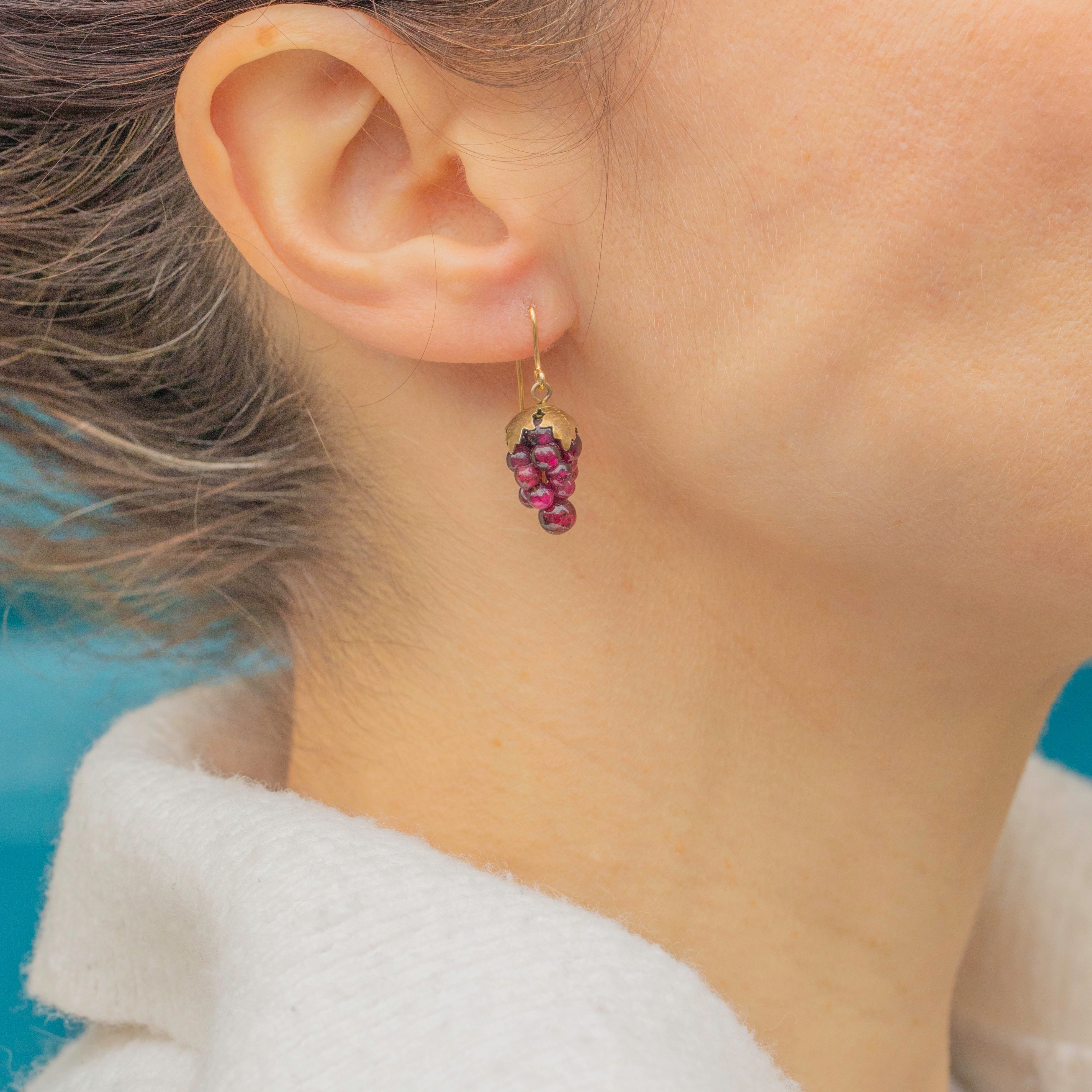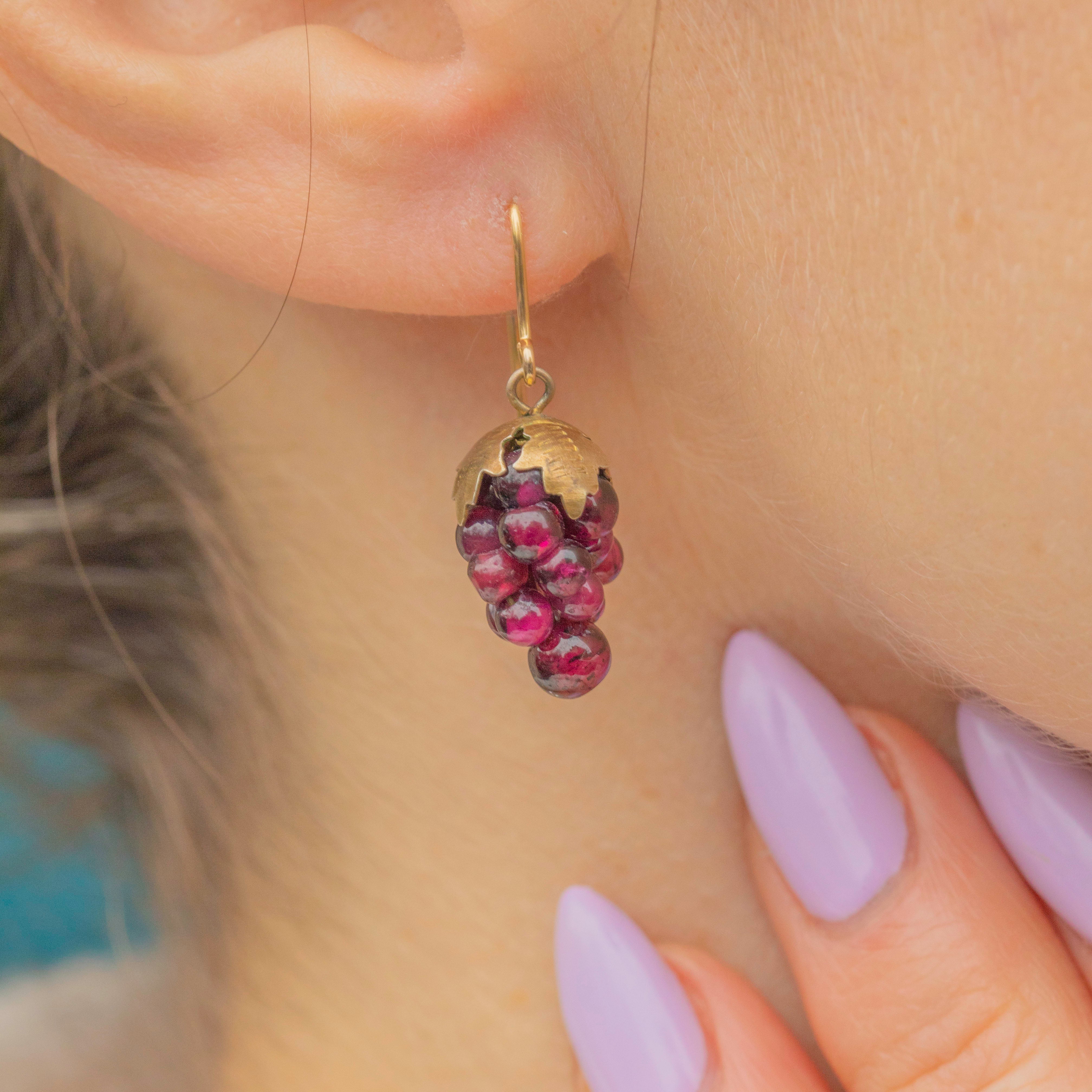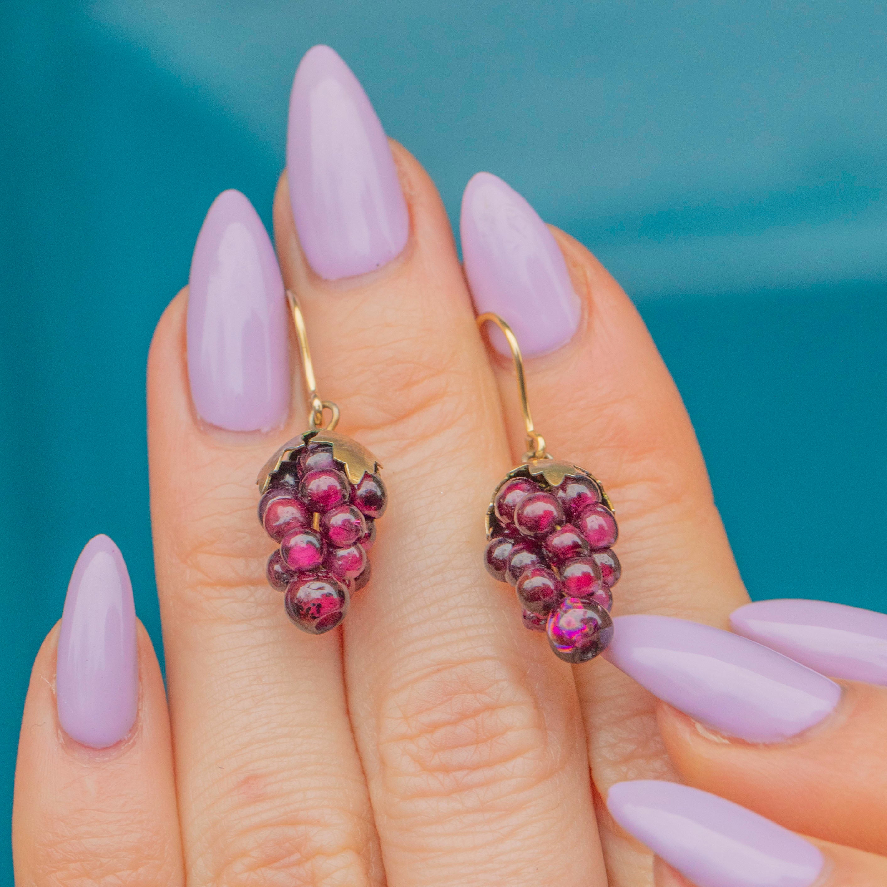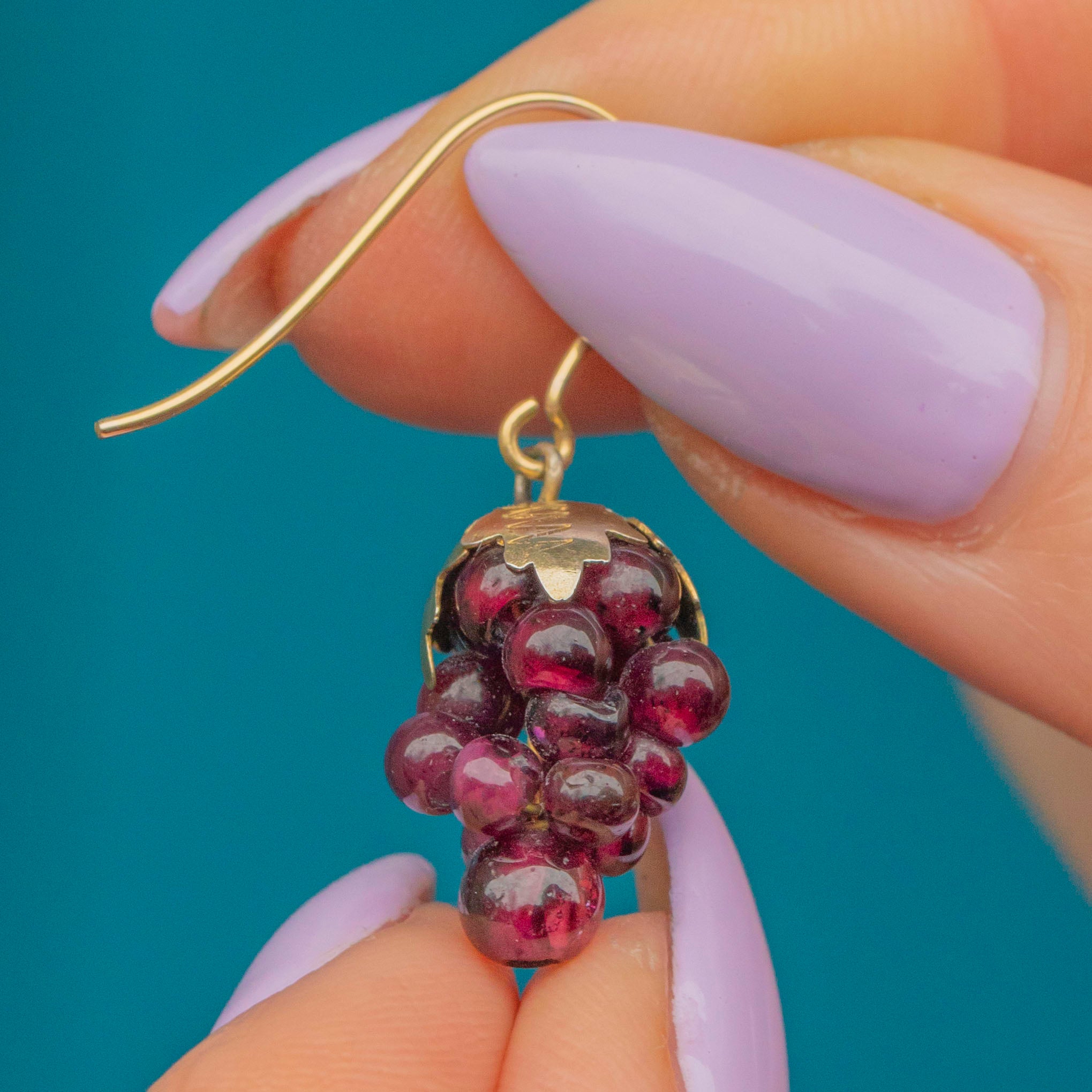 EXCELLENT. These 9ct Gold Garnet grape earrings are in superb condition. Each of the Garnet beads is saturated and securely attached. The Gold has a lovely rosy hue and, with secure hooks, you can wear this pair with confidence!