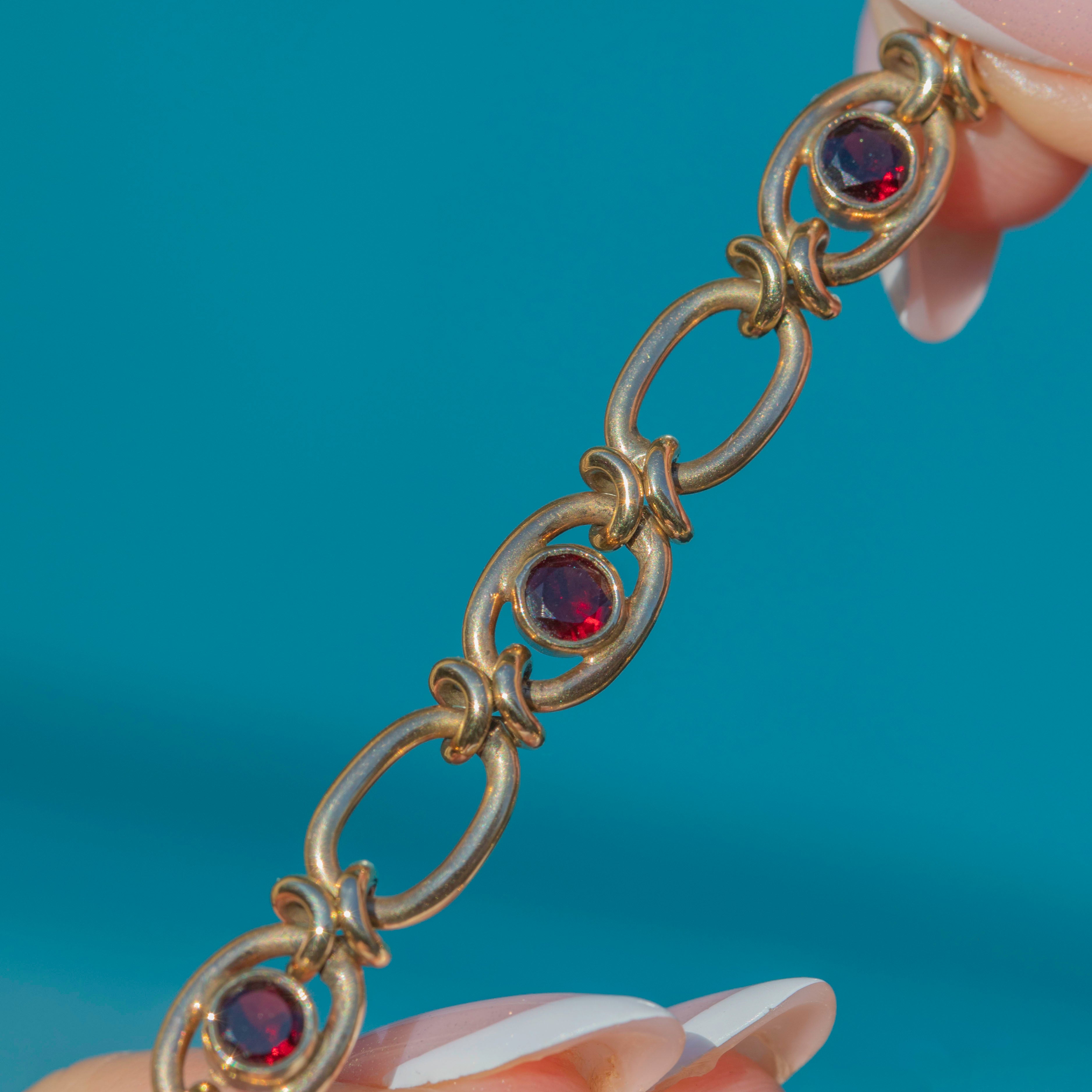 At 7.5" in length, her curvaceous links sit comfortably against your wrist and with each one embellished with a radiant Garnet, she will add the perfect pop of colour to every outfit. This vintage bracelet is bound to become your newest go-to piece!