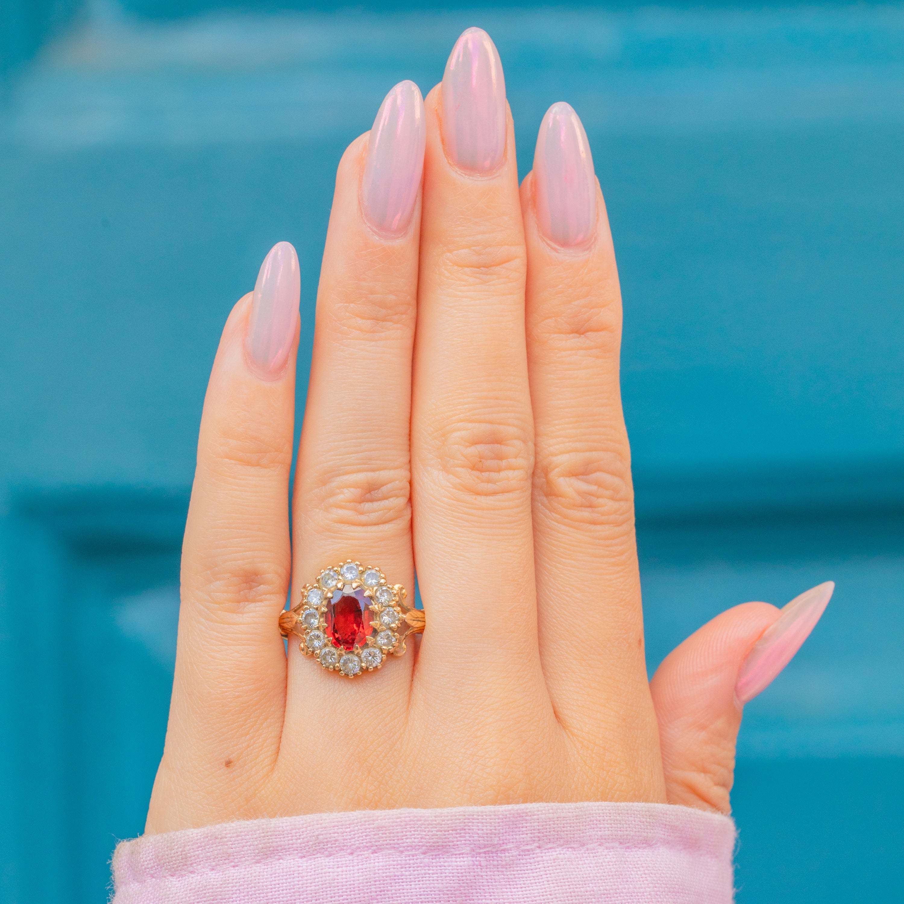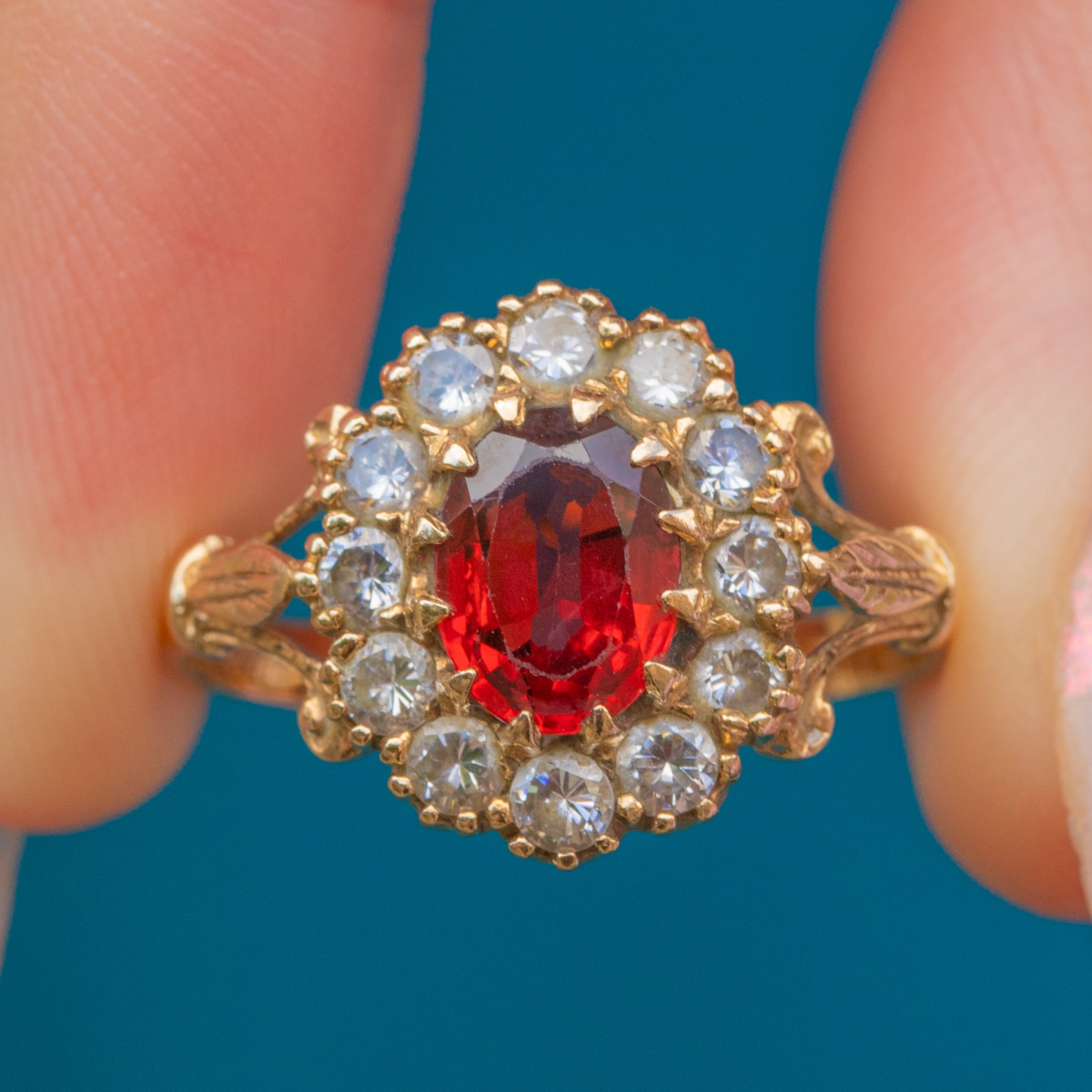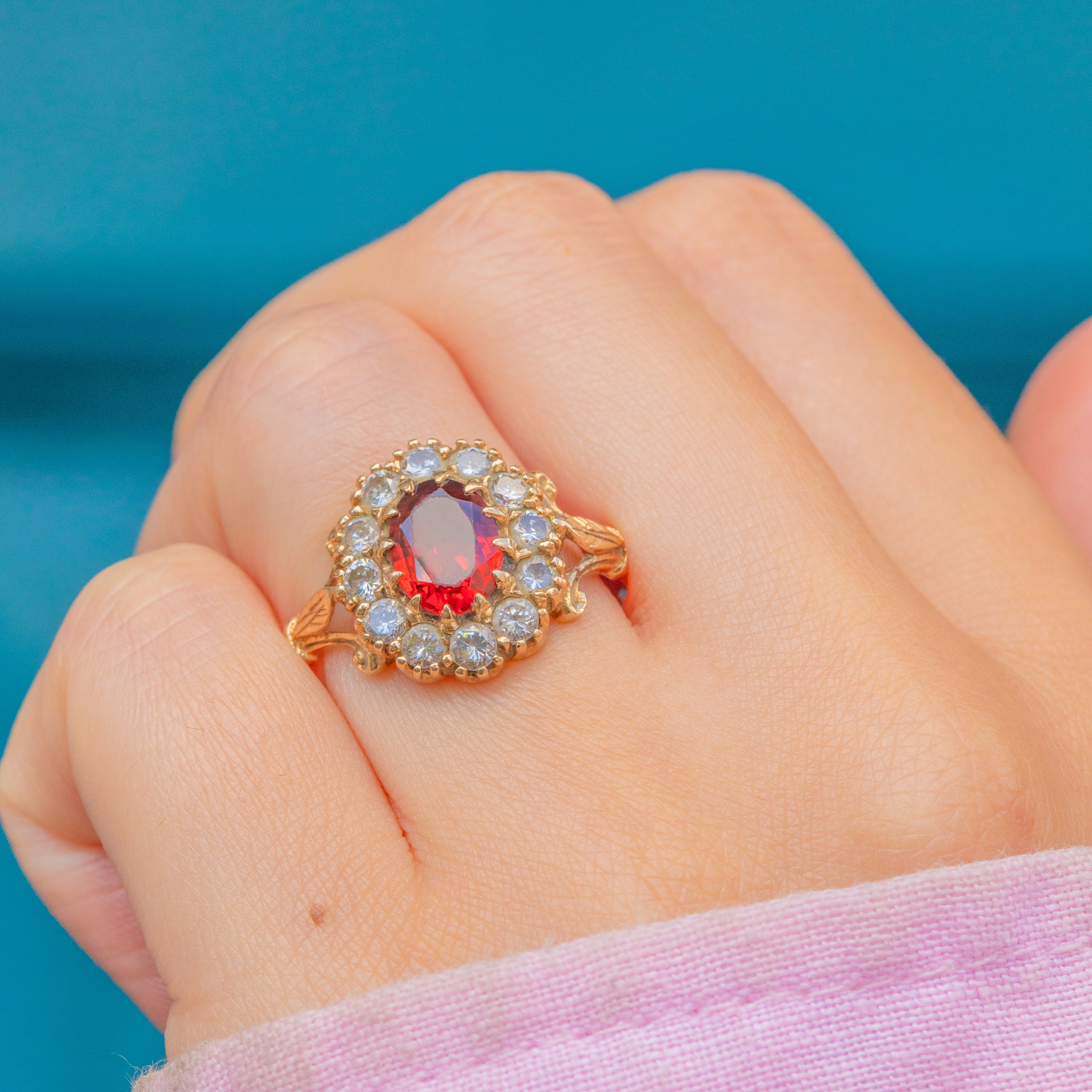 This vintage Gold ring features a central 1.25ct oval-cut Garnet, set within a halo of white Paste gemstones arranged in a traditional cluster formation.