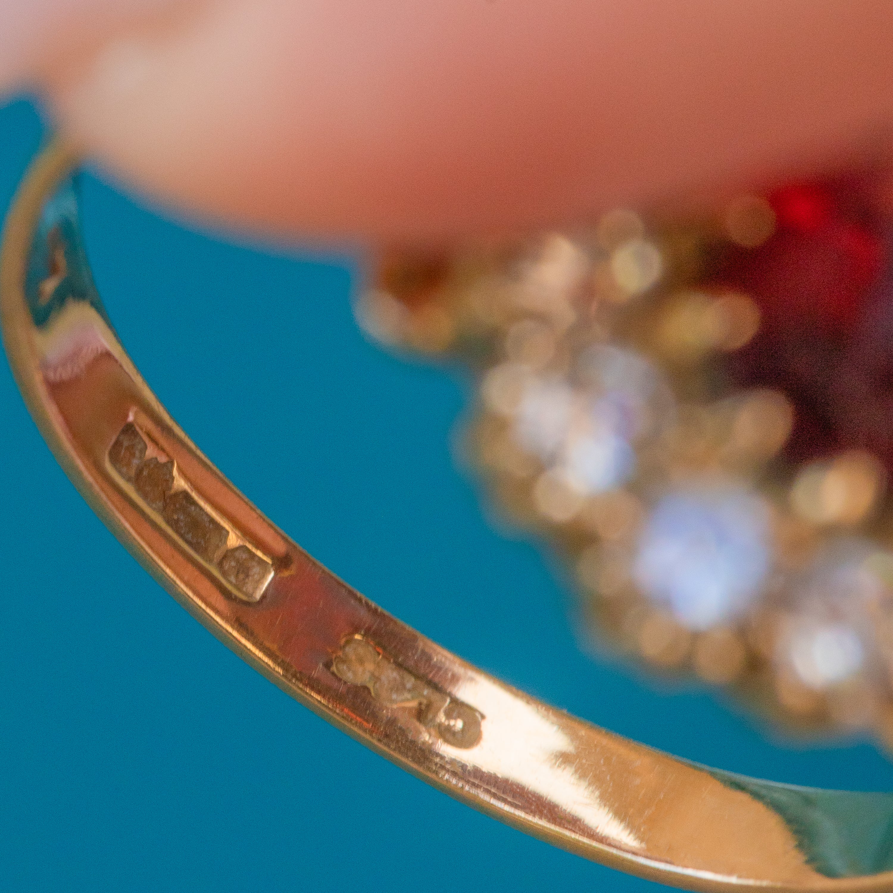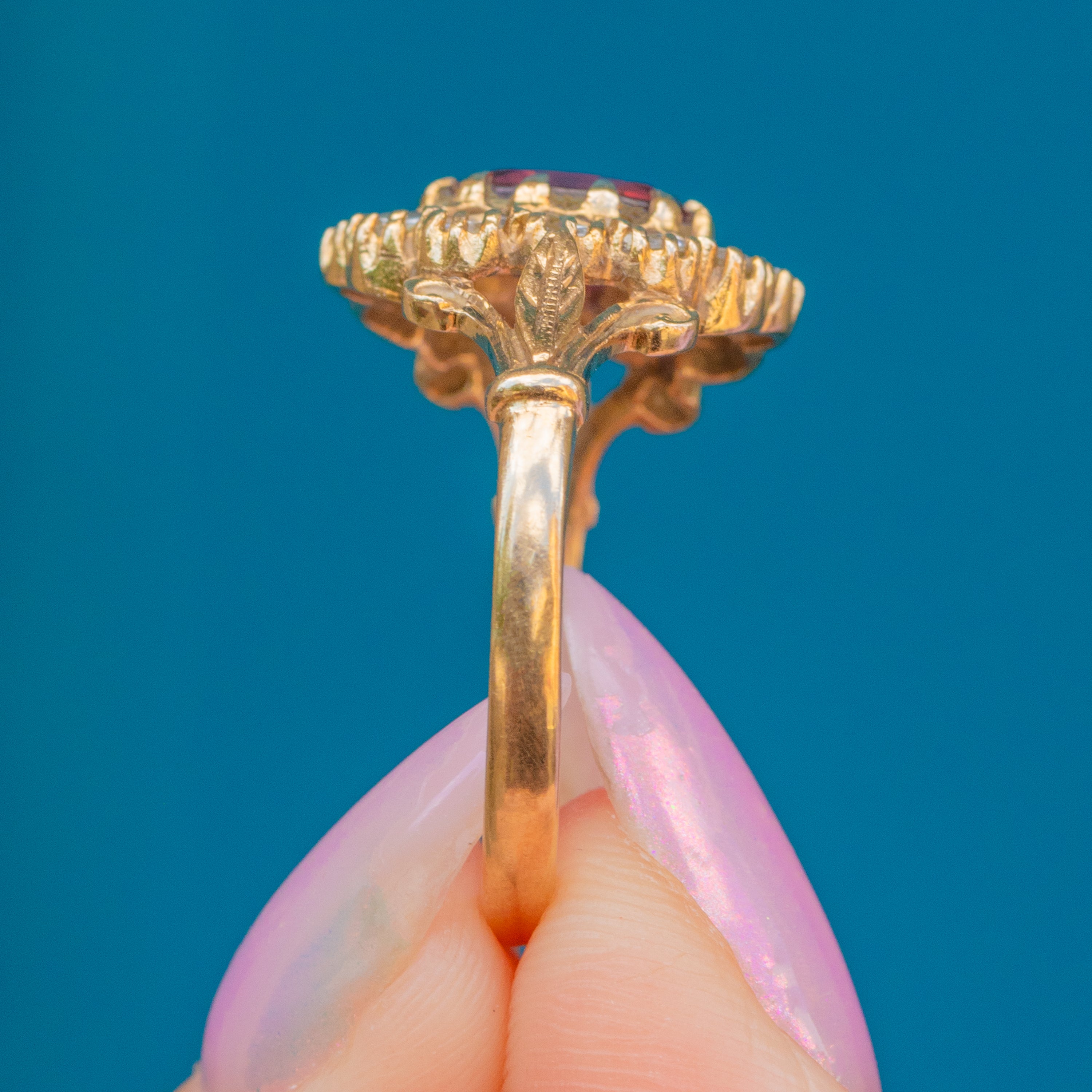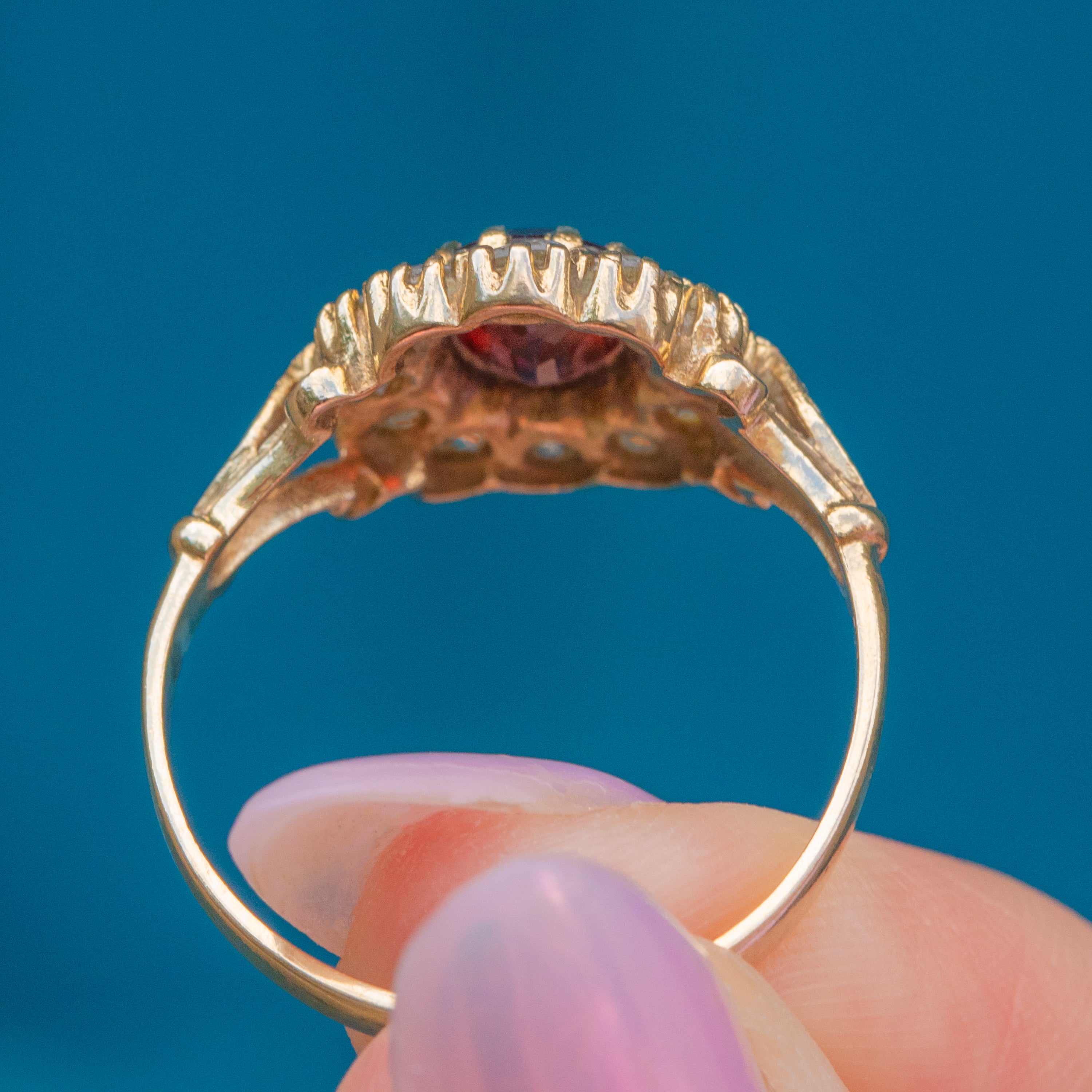 This vintage Gold ring features a central 1.25ct oval-cut Garnet, set within a halo of white Paste gemstones arranged in a traditional cluster formation.