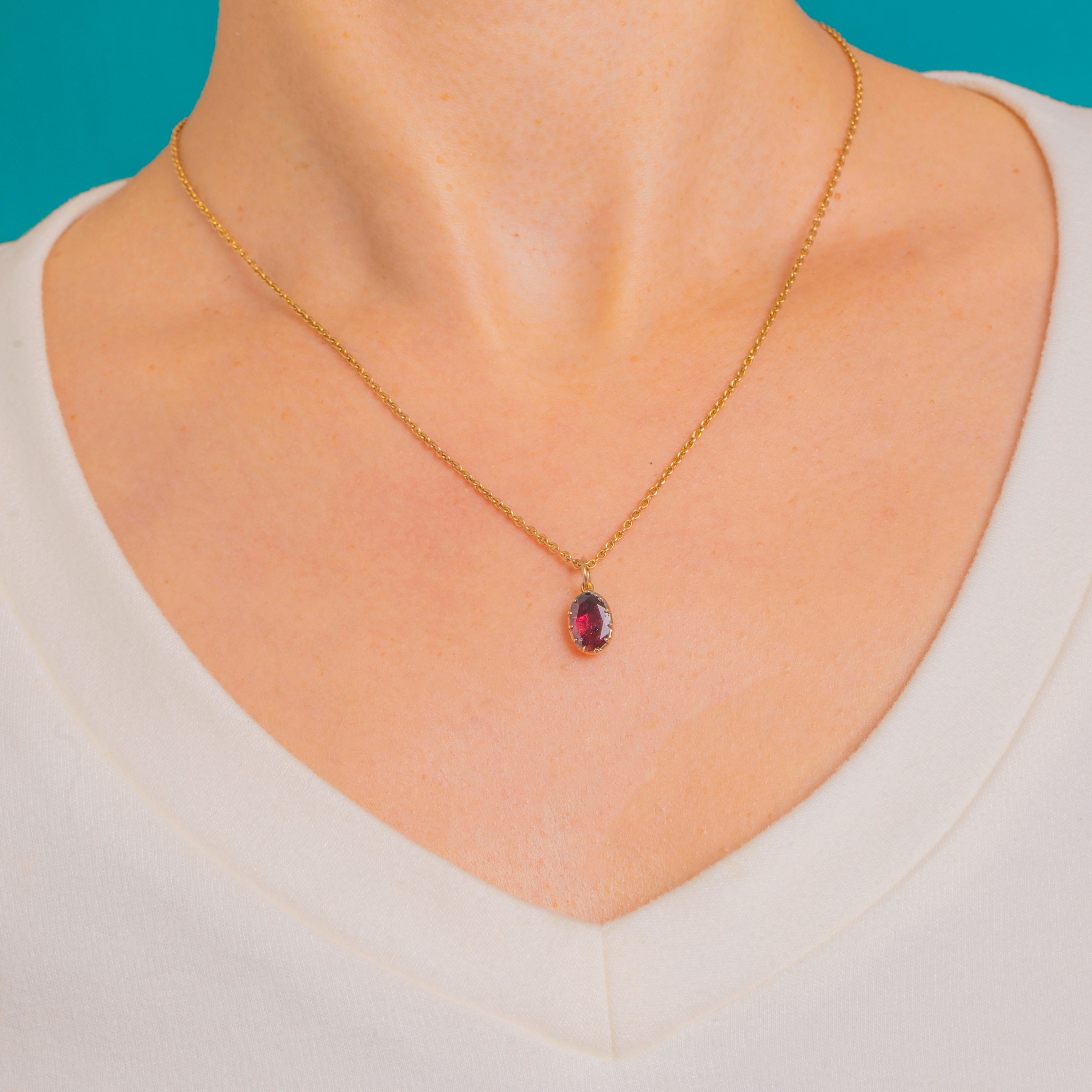 A petite treasure from the Georgian era, this charming 9ct Gold foiled flat-cut Garnet pendant distils timeless elegance into a delicate silhouette. The oval Garnet glows a deep, wine-red with bright flashes, enhanced by its traditional closed-back, foiled setting for a rich, romantic presence.
