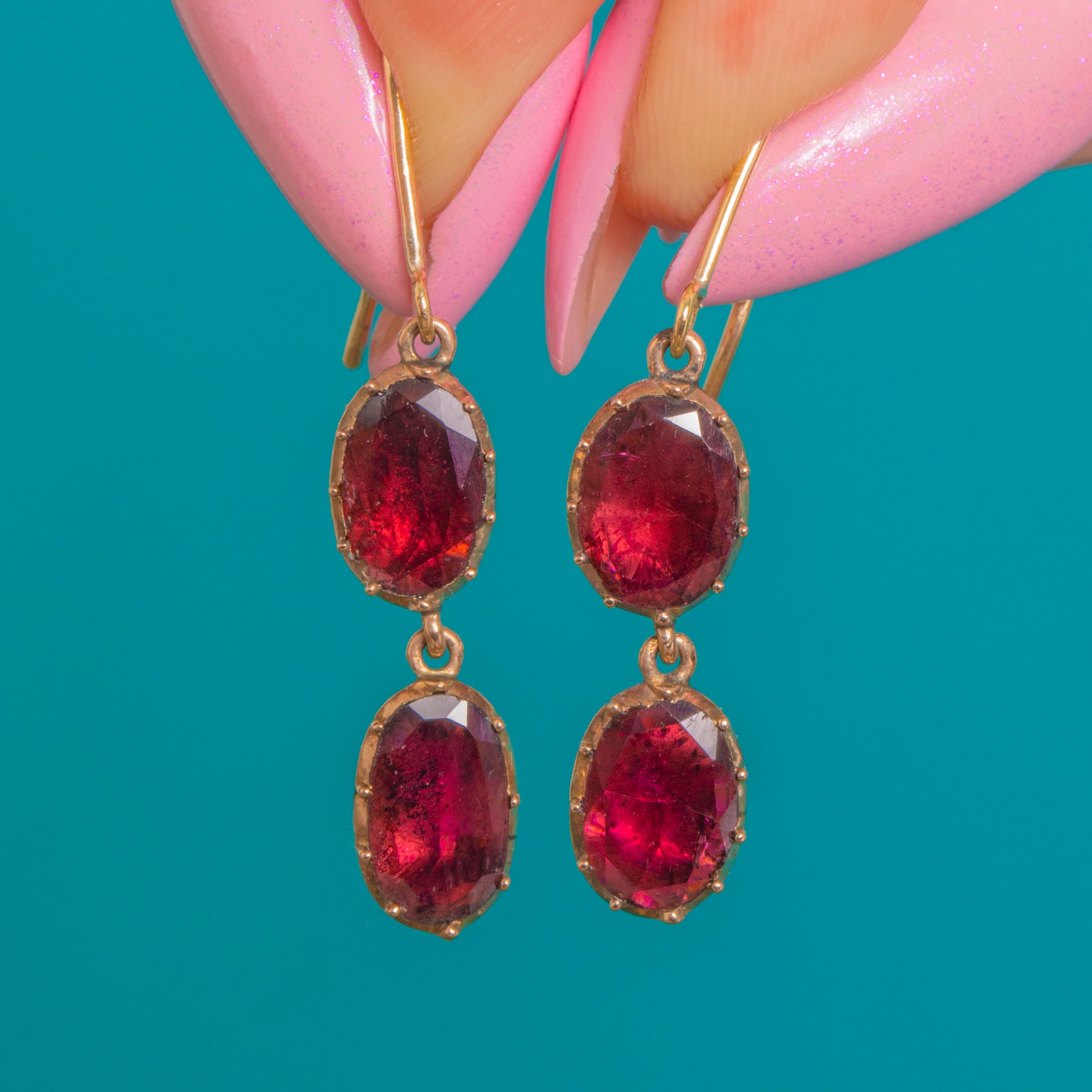 These Georgian double-drop earrings are a study in elegance, pairing rich Garnets with warm 9ct Gold. Each earring suspends two faceted oval Garnets in scalloped collet settings, linked so they sway softly with every movement. The deep crimson tones glow against the buttery hue of the Gold, creating a timeless, romantic allure.