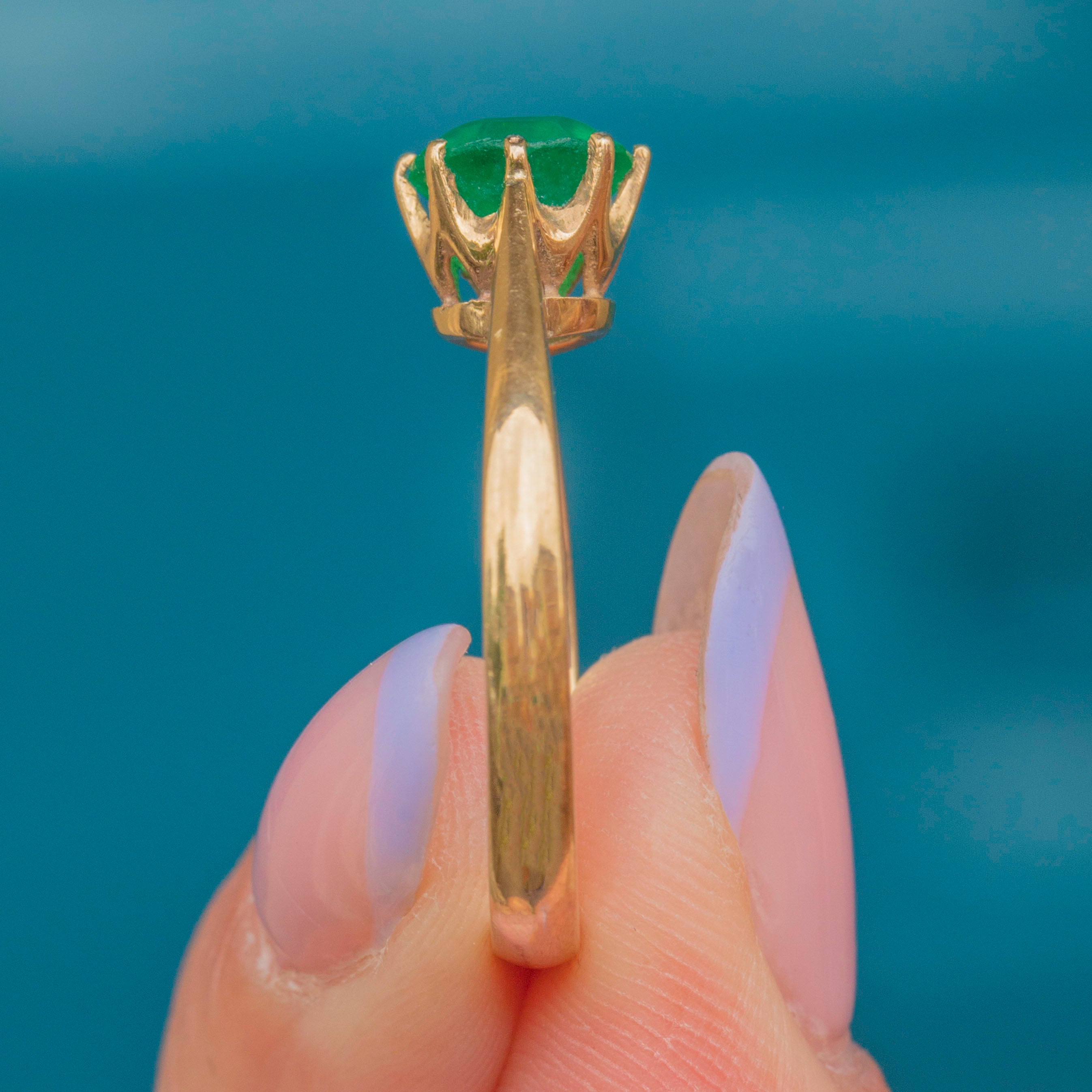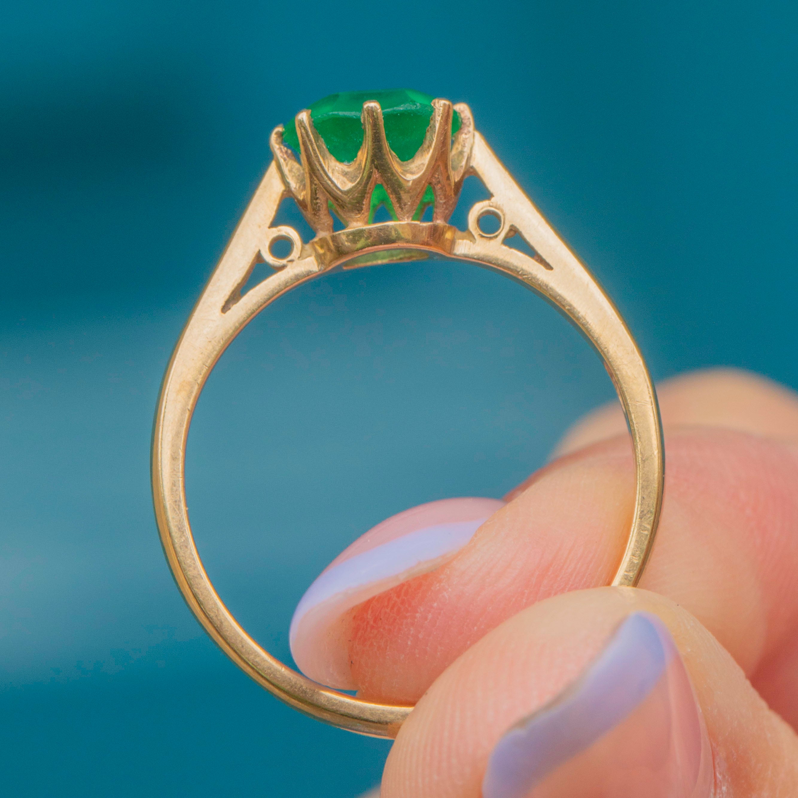 Crafted from buttery 9ct Gold, this vintage solitaire ring features a radiant round verdant green Paste stone in her centre, which is sure to catch your eye. She is hugged by 9ct Gold claws, with the warmth of the Gold effortlessly complementing the vibrancy of the Paste.
