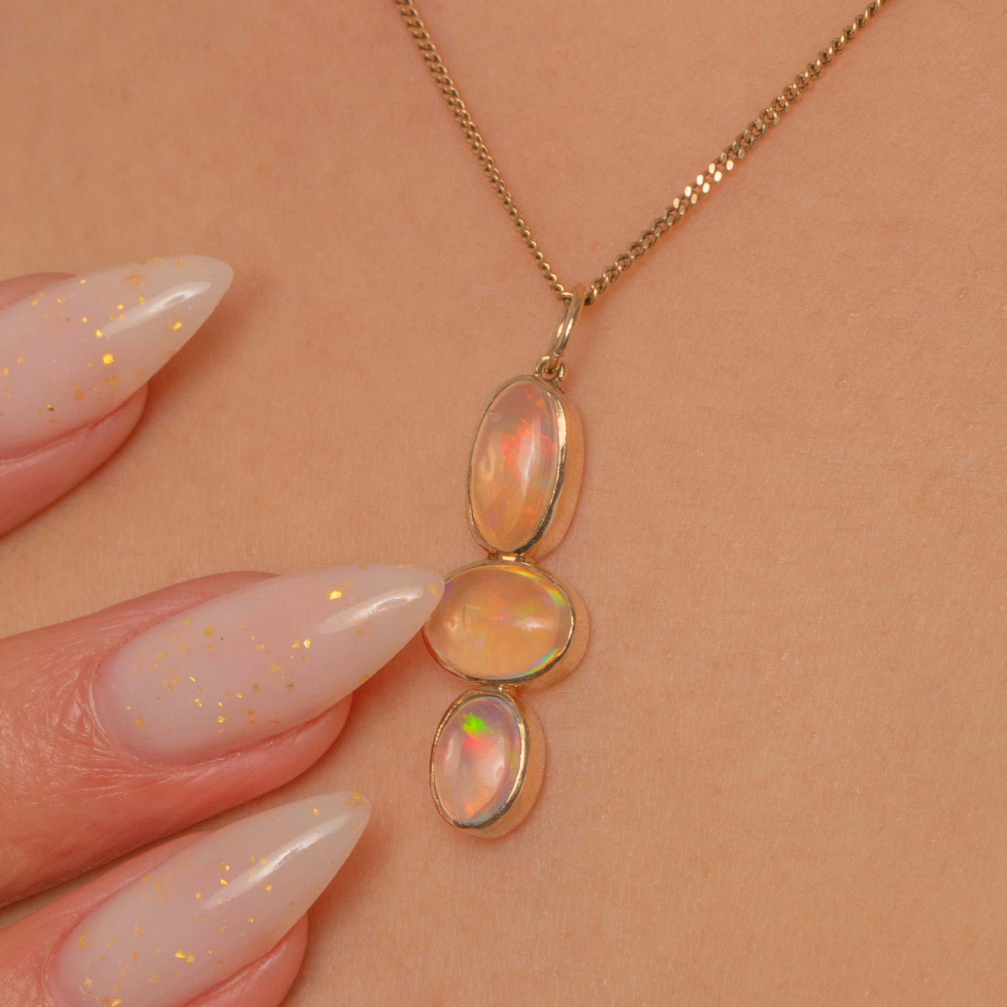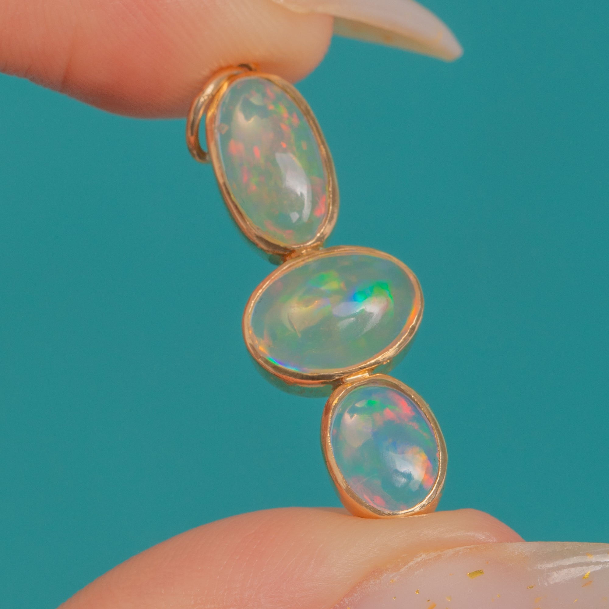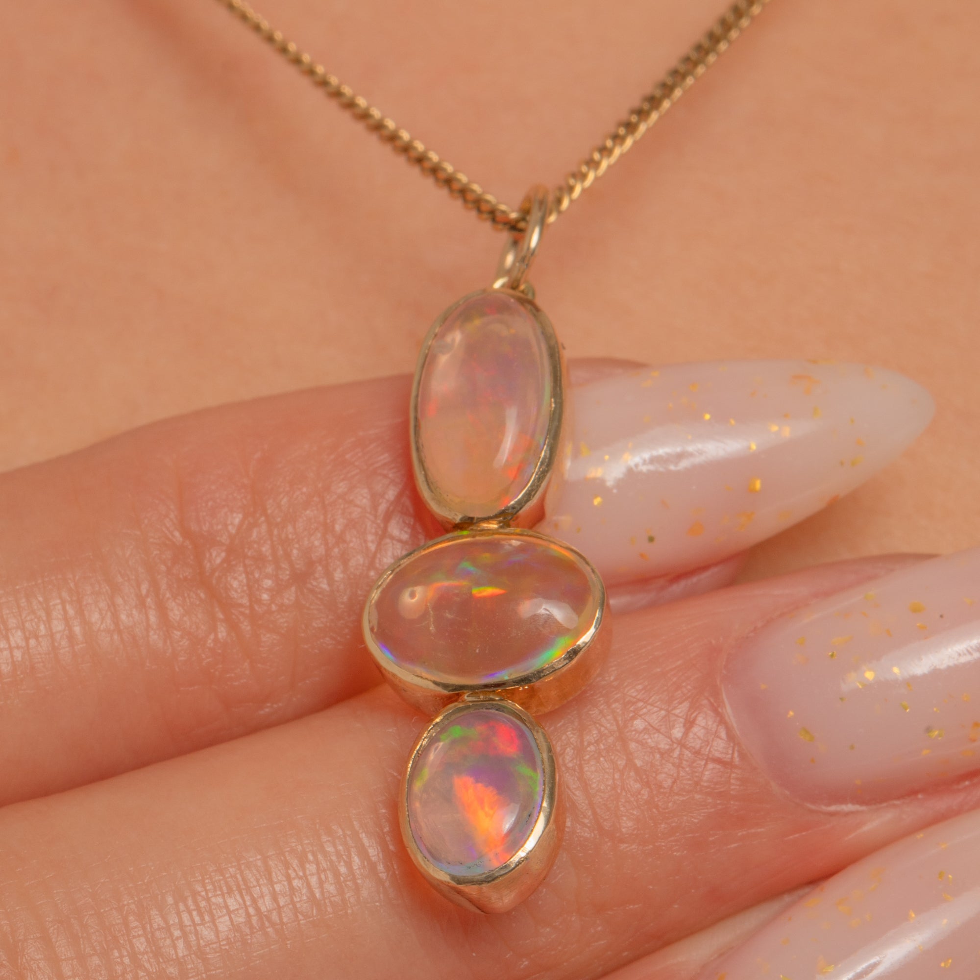 A luminous trio of Jelly Opals cascades in a refined vertical drop, each cabochon alive with vibrant play-of-colour—flashes of green, orange, red, yellow and blue shimmering across their milky translucence. Sleek rub-over bezels in warm 9ct Gold frame the stones, creating a graceful silhoutte.