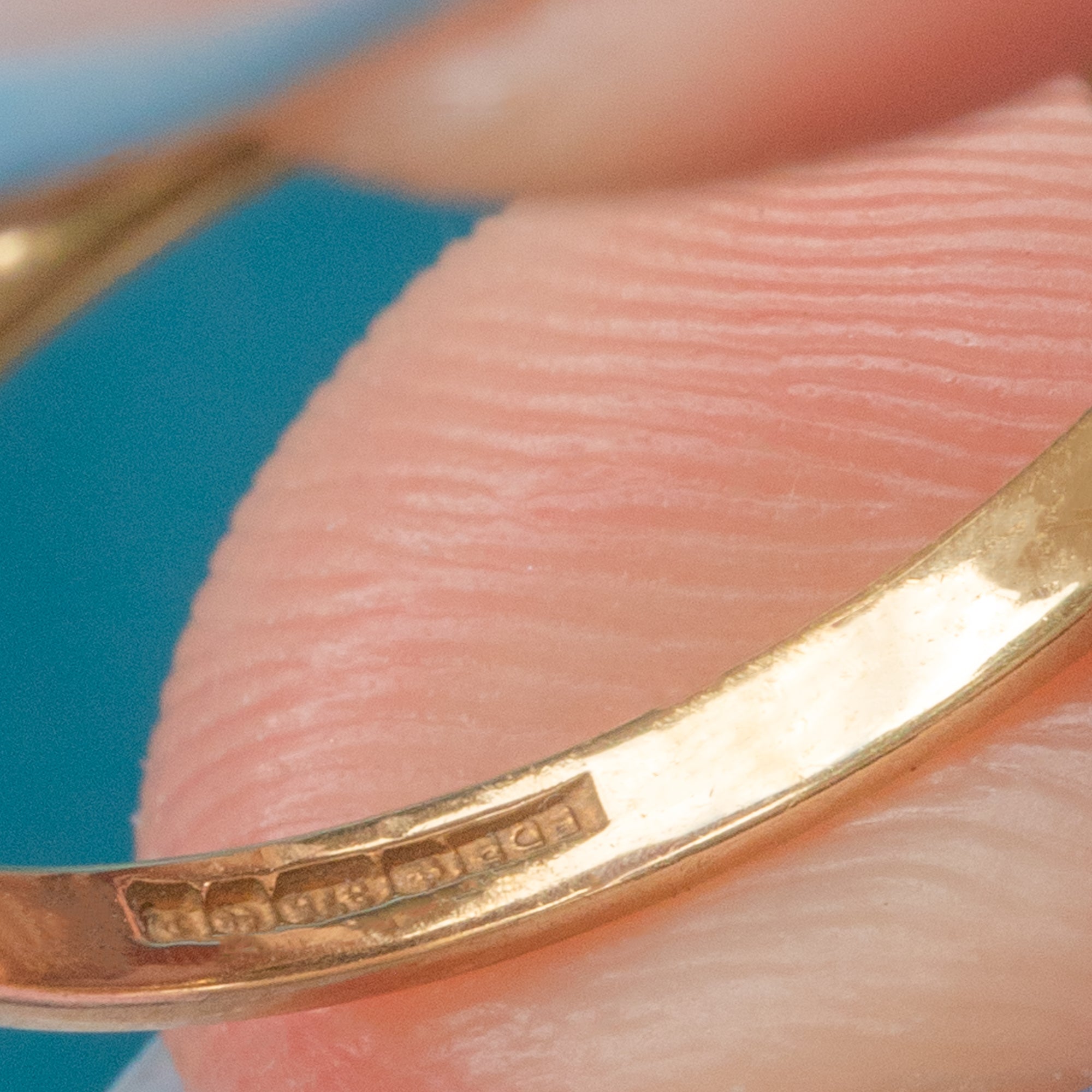 EXCELLENT: Each gemstone is securely set and free from any notable chips or surface wear. The band is buttery and smooth, with a full set of hallmarks dating to 1989 inside.