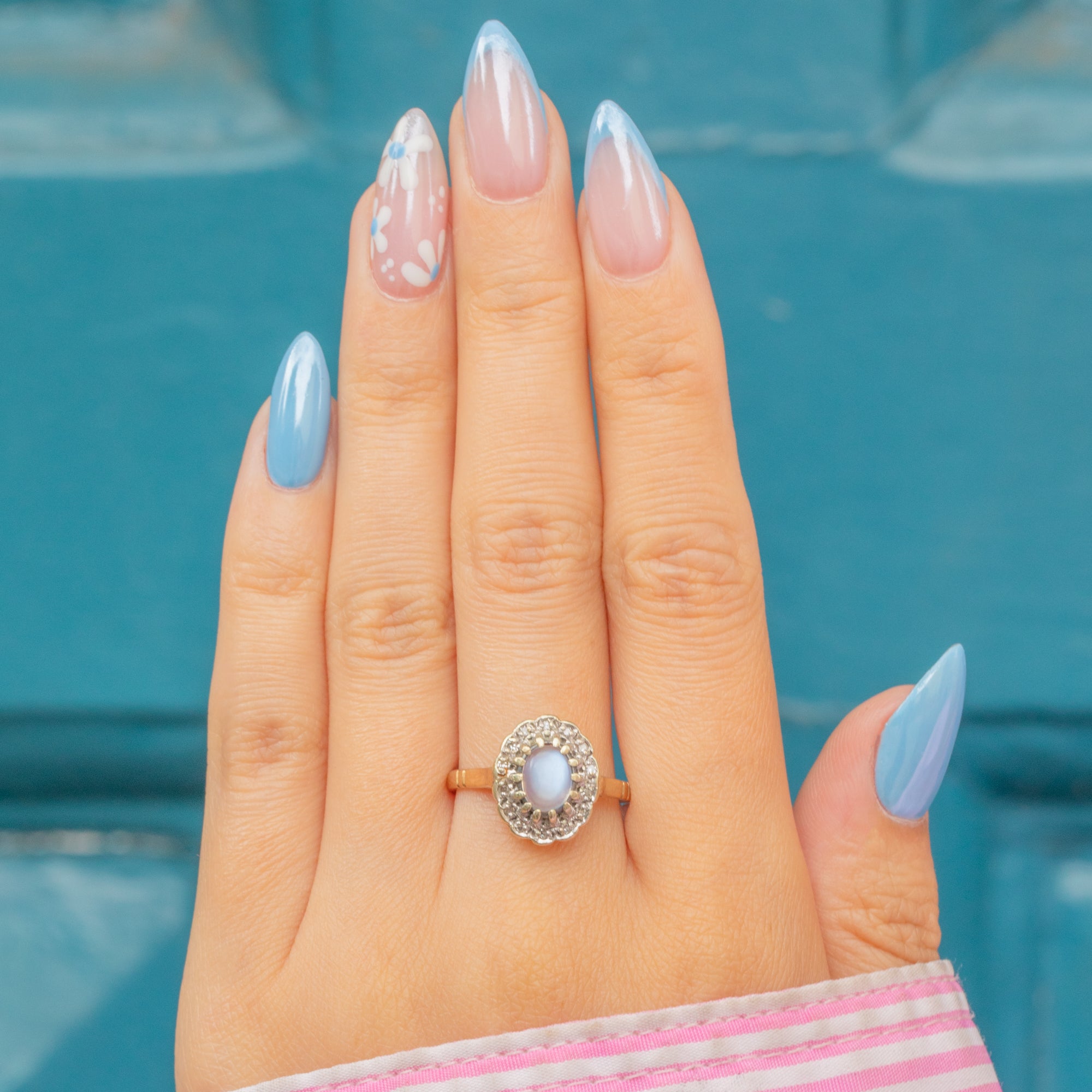 This vintage cluster ring displays a luminous 0.35ct Moonstone cabochon haloed by scintillating Diamonds, boasting decadence and refined sophistication.