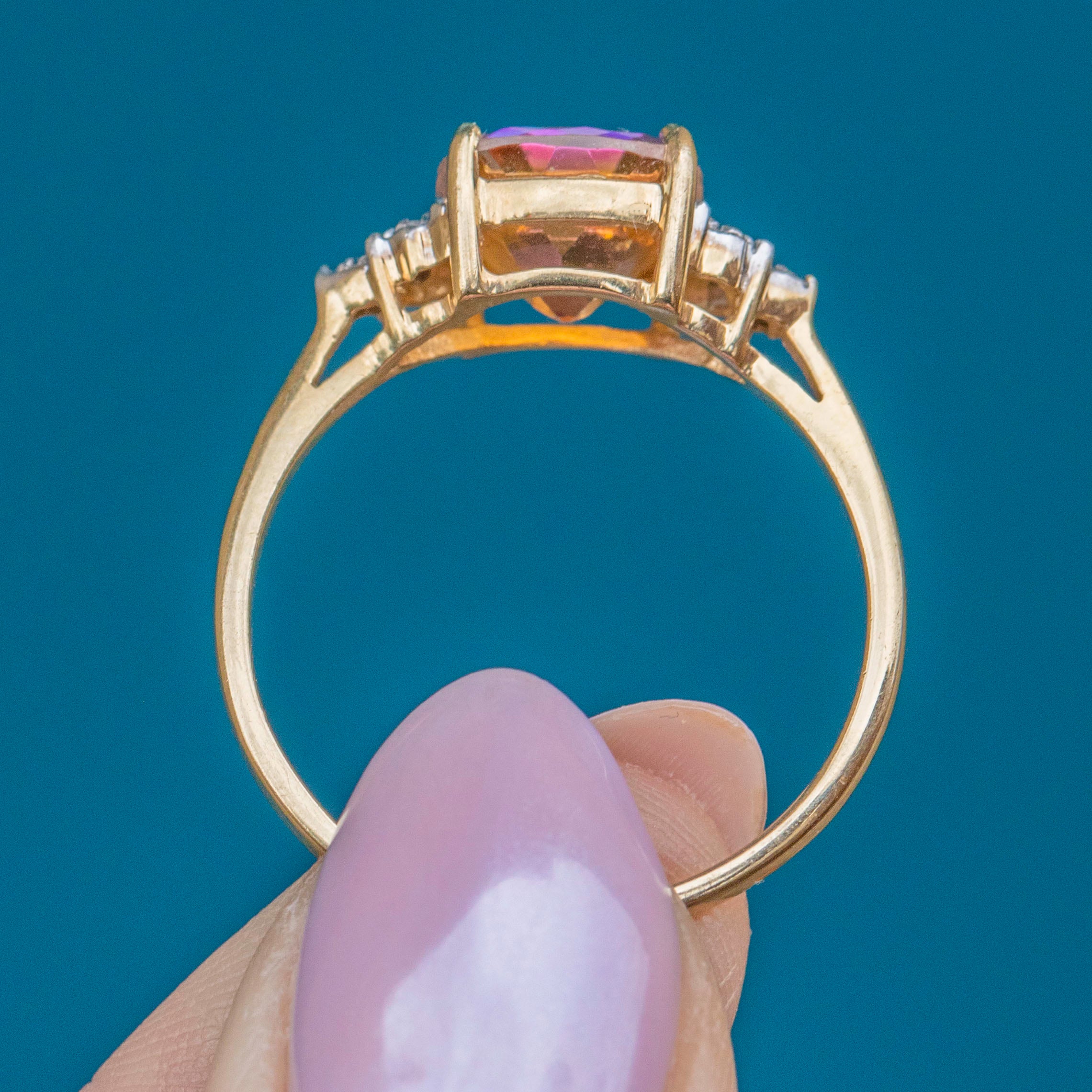 This peachy pink 9ct Gold Mystic Topaz Diamond cluster ring is simply adorable! Boasting a magnificent 2.85ct Mystic Topaz with rainbow flecks of hot pink, oranges, and a few flashes of blue, she will make a mesmerising addition to your growing jewellery collection!
