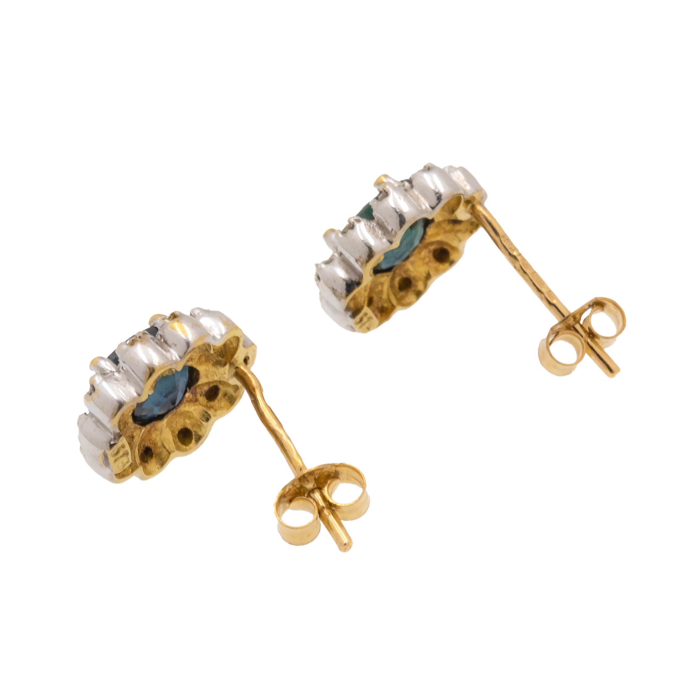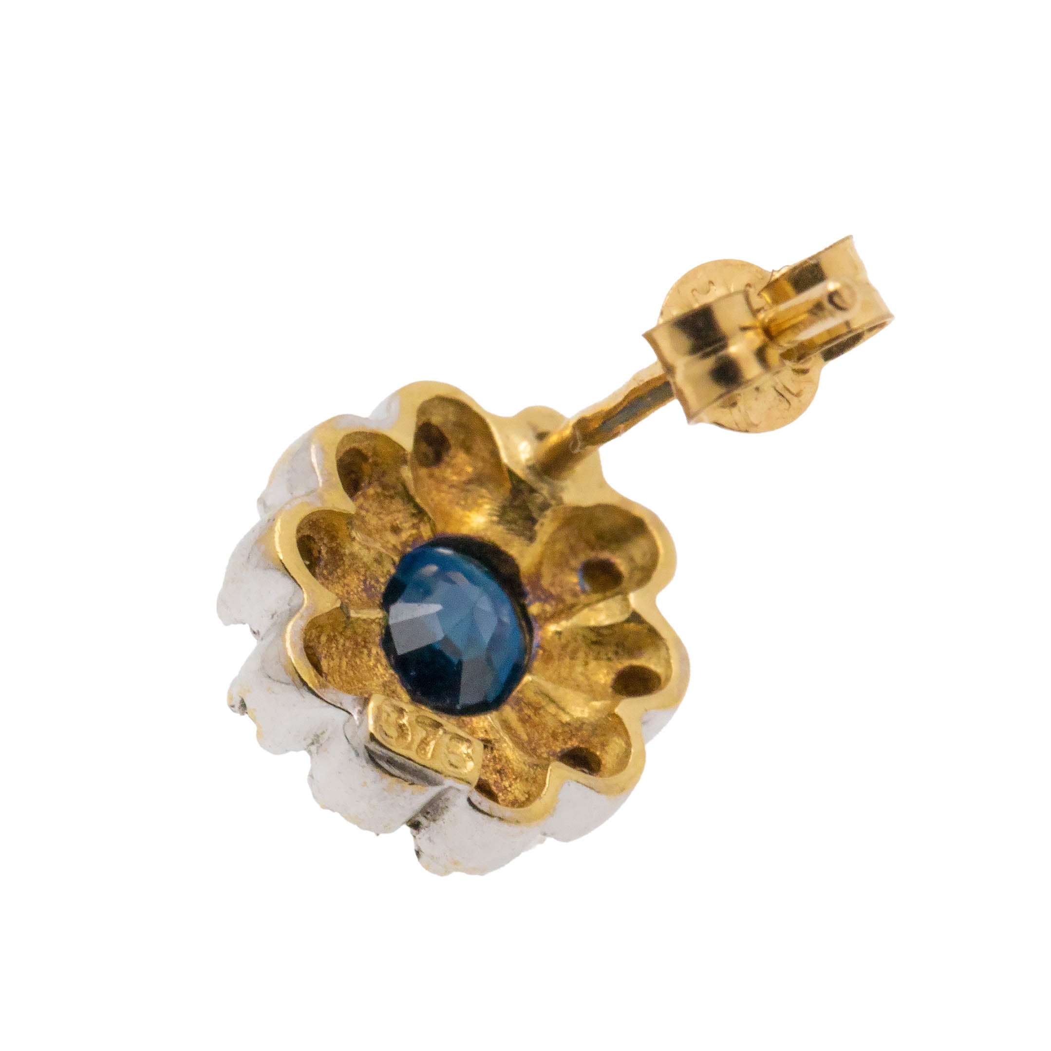 MATERIALS: Tests as 9ct Yellow Gold posts, 9ct White Gold settings, Diamonds (0.10ct), Natural Sapphire (No indication of heat treatment present) (0.50ct).