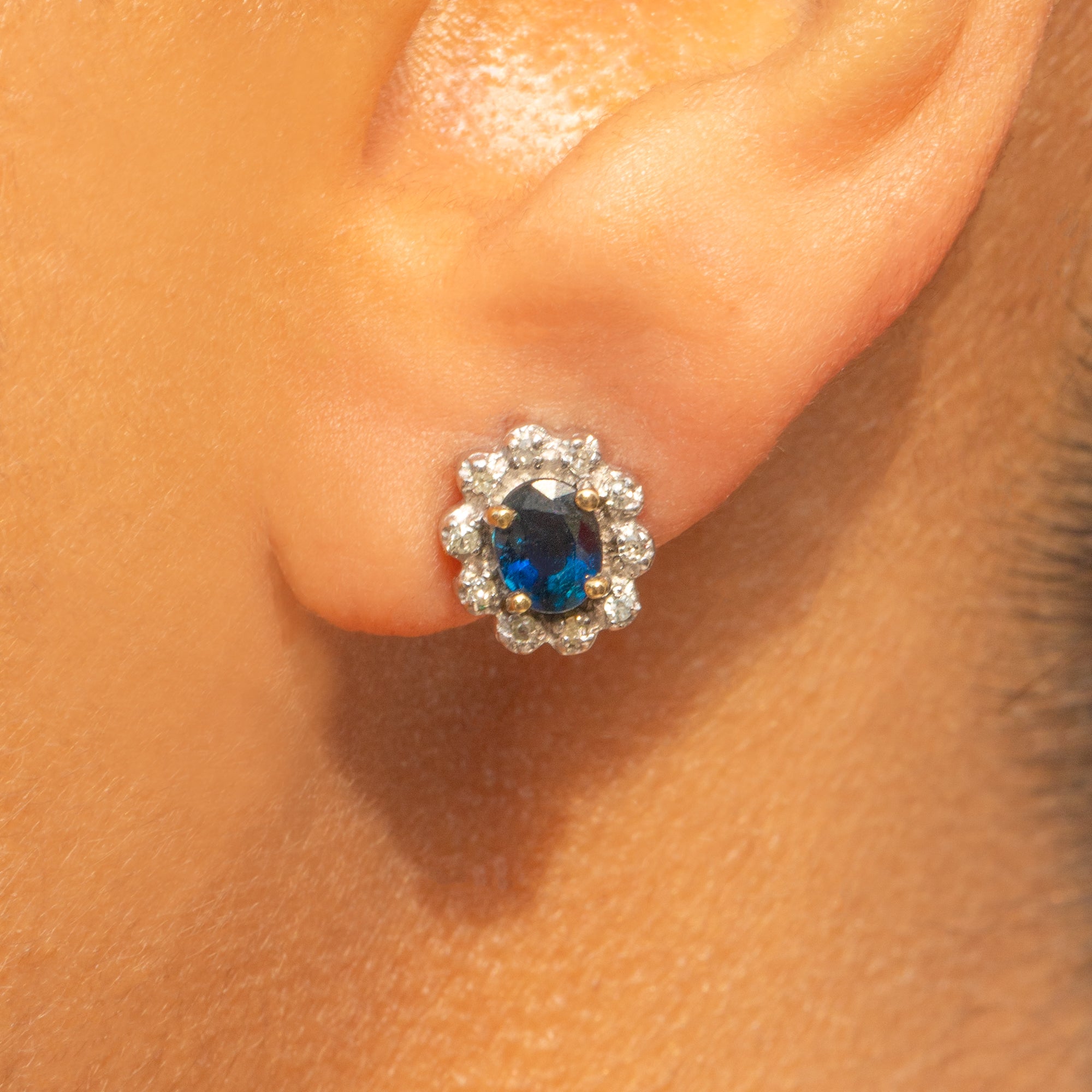 EXCELLENT. These 9ct Gold Natural Sapphire Diamond flower cluster earrings are in wonderful condition. This delightful pair have little wear to note and will provide you with years of enjoyment. The Natural Sapphires are rich in hue and beautifully faceted, and the Diamond petals sparkle brilliantly. The posts are fully hallmarked, and the butterfly backs allow you to wear this pair with confidence. Sapphire and Diamond are a timeless pairing - you won't ever fall out of love with these!