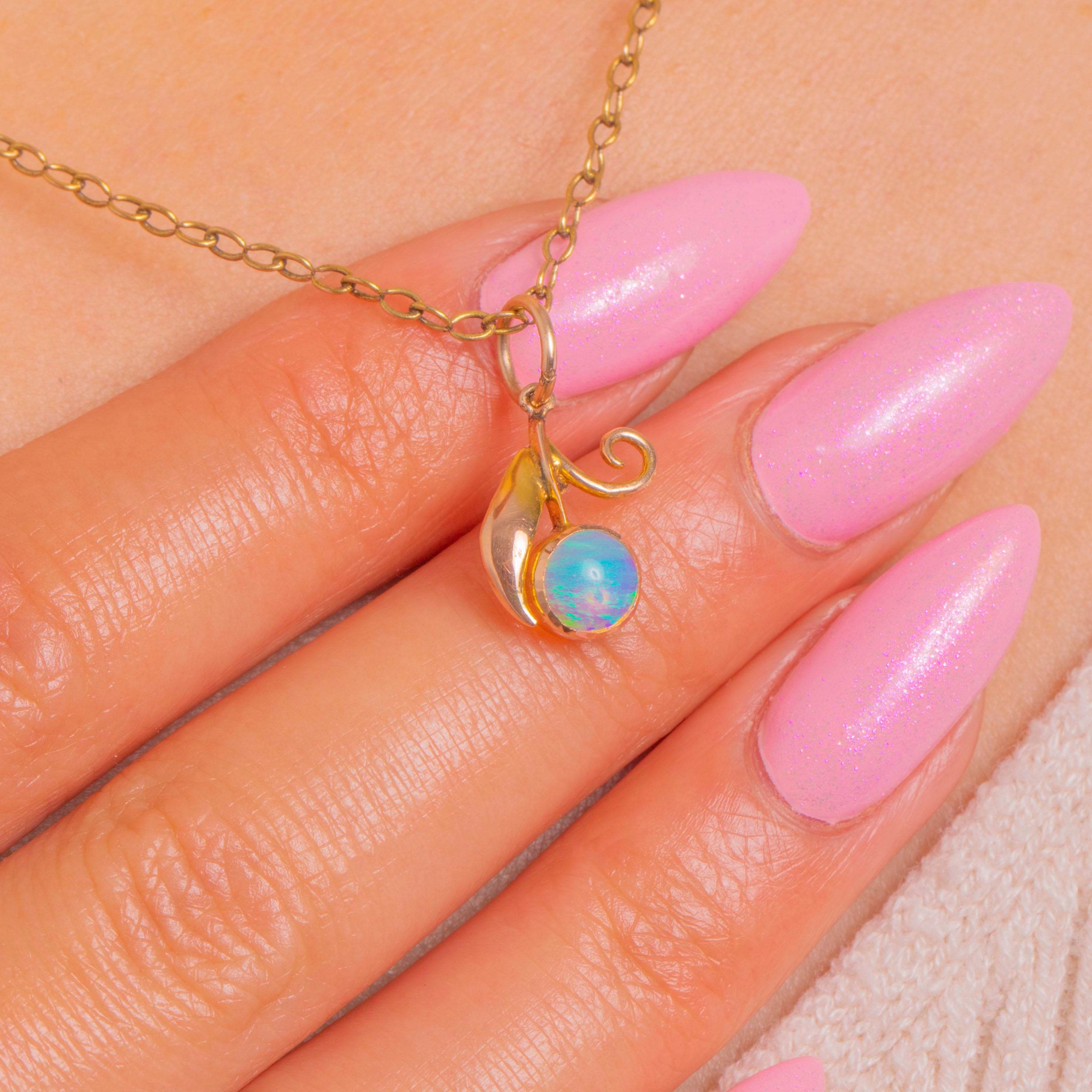 Sweet and sculptural, this petite “berry” charm pairs a luminous round Opal with a softly polished 9ct Gold leaf and a delicate curled tendril. The Opal’s blue-green play of colour glows against a smooth bezel, while the organic foliate detailing lends a romantic, Art Nouveau flourish.