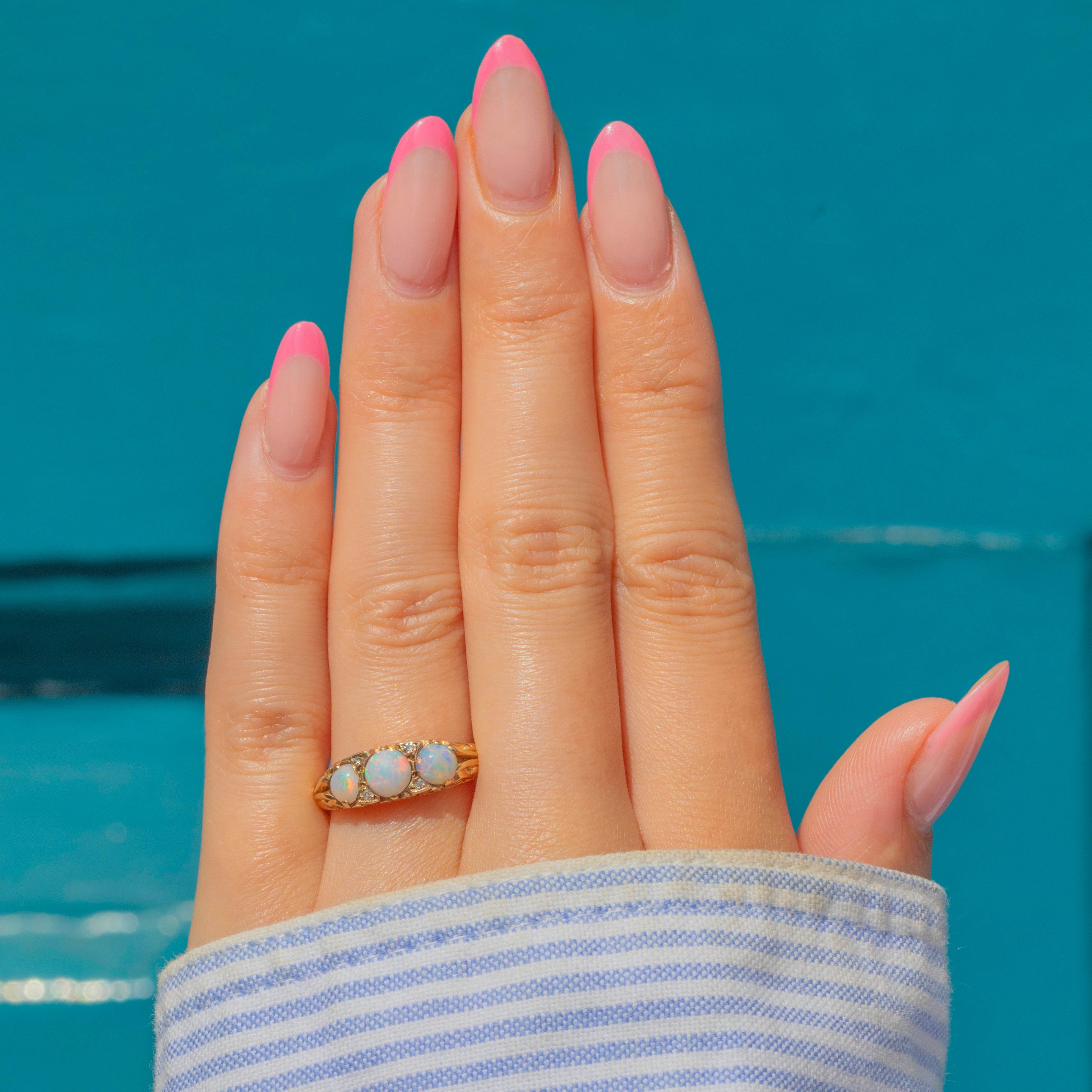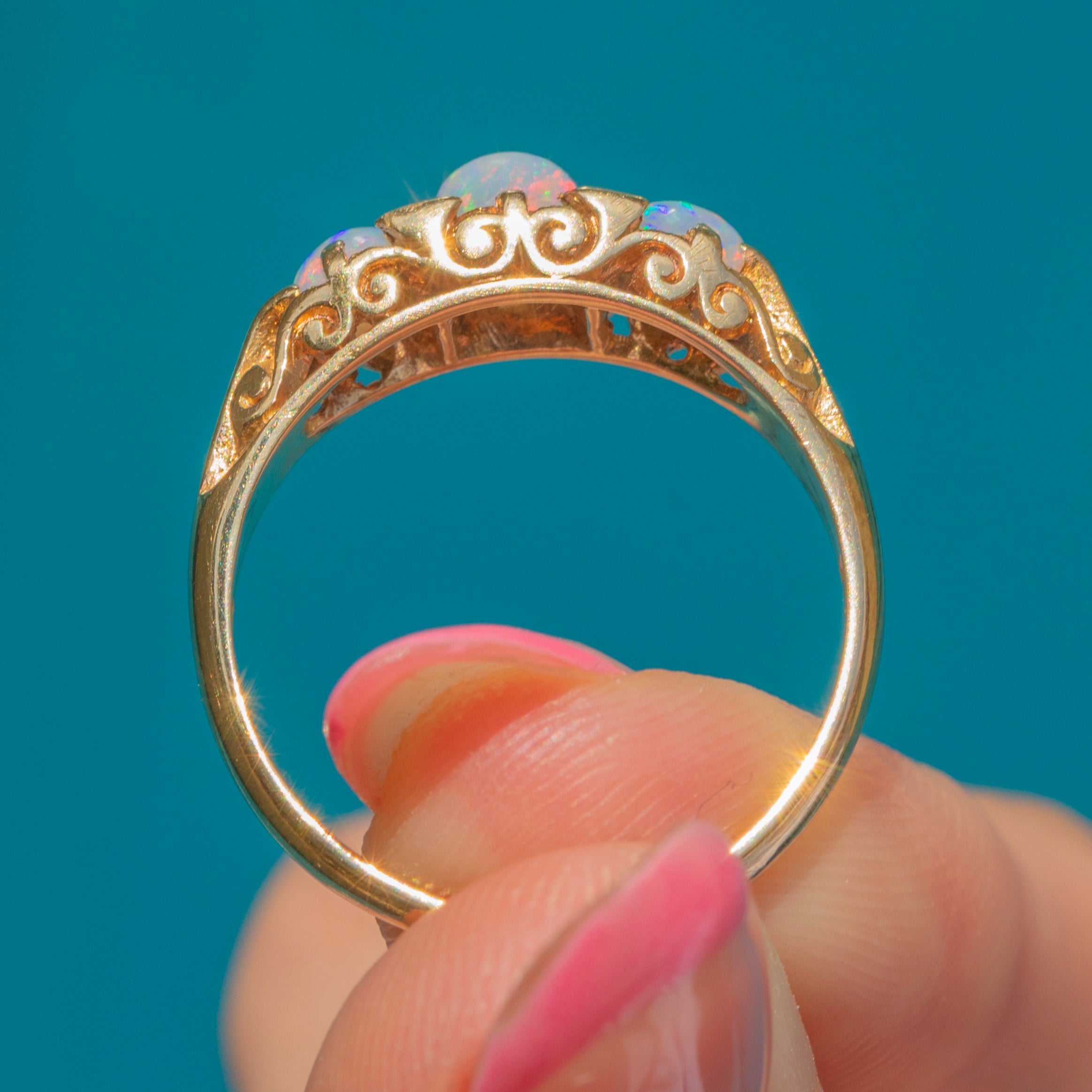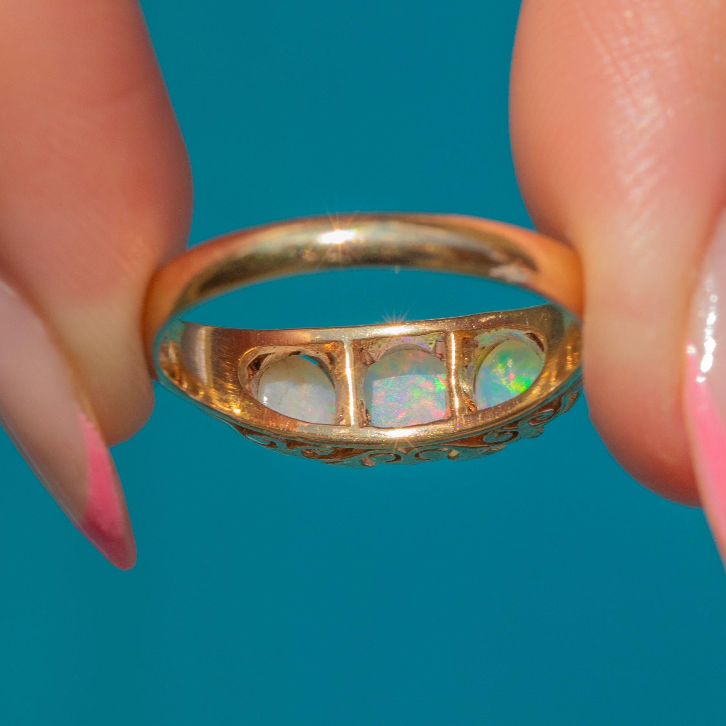 Providing beauty from all angles, the gallery boasts ornate scrollwork, crafted entirely from buttery 9ct Gold. Fully hallmarked to 1975, this Vintage Opal ring takes heavy inspiration from ring designs of the Victorian period!