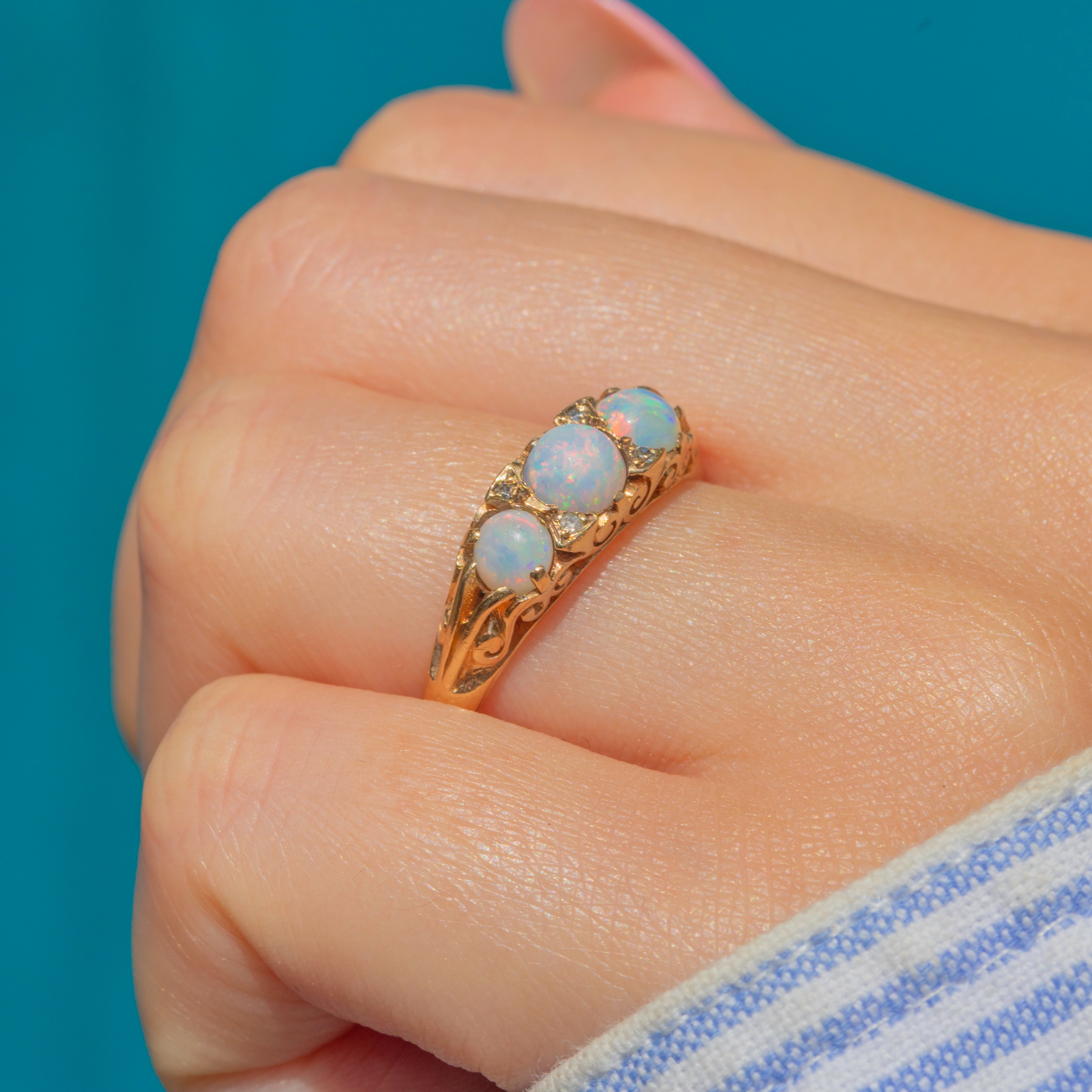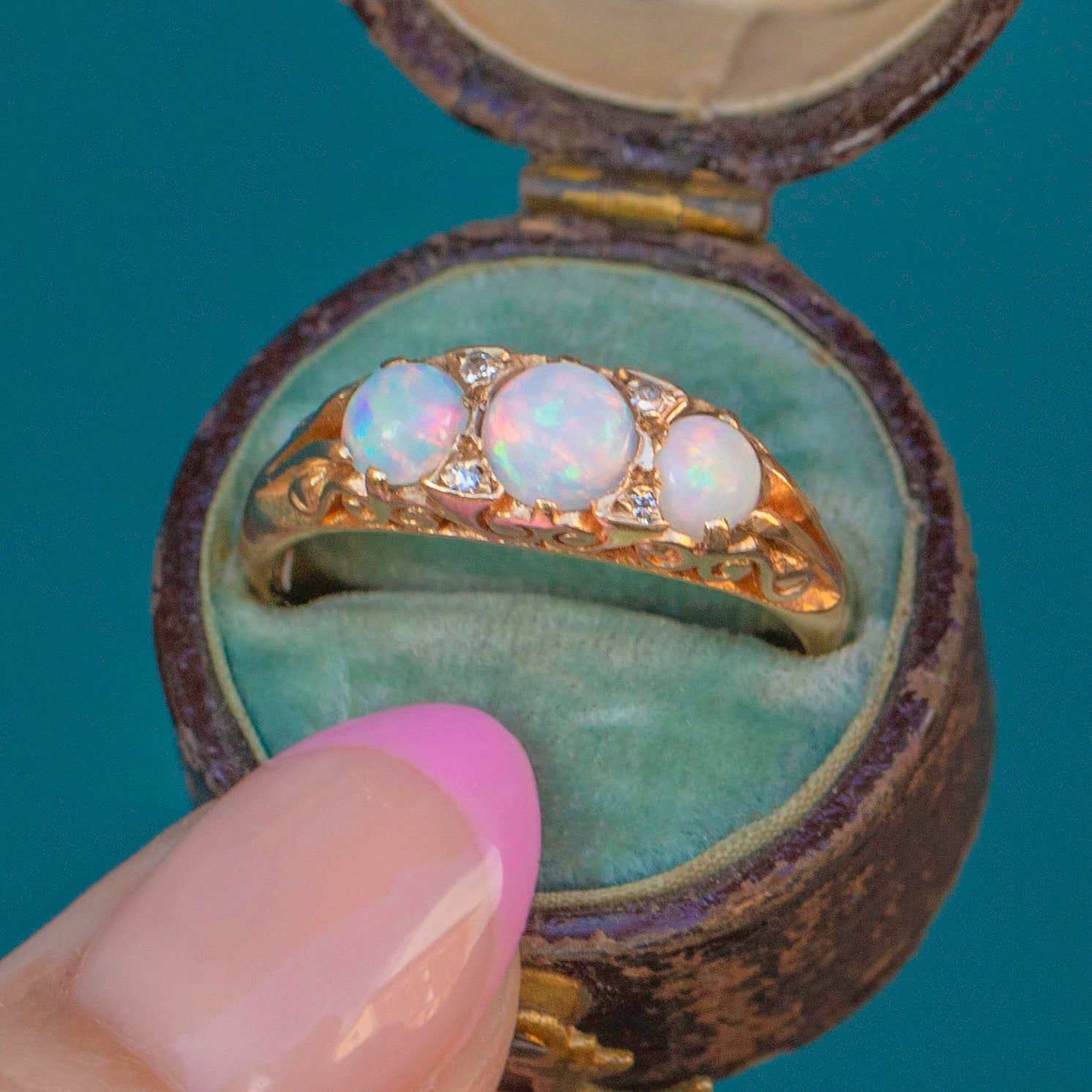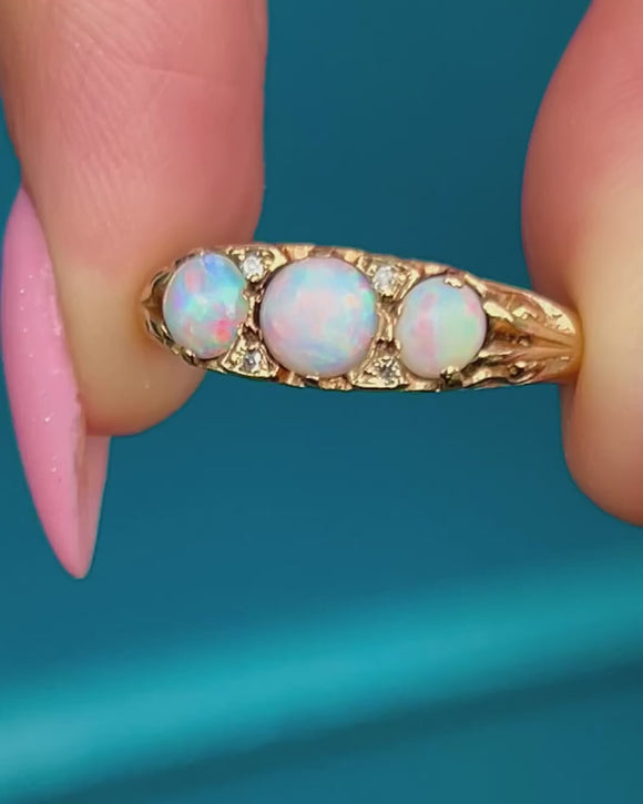 EXCELLENT: This 9ct Gold Opal Diamond three stone ring is in very good condition. The Opals have no damage to note and have an exceptional play of colour. The Gold possesses wonderful reflective qualities and the gallery details are exquisite. There is a faint resize mark on the back of the band, however this cannot be seen when worn and in no way detracts from the overall beauty of this Vintage ring!