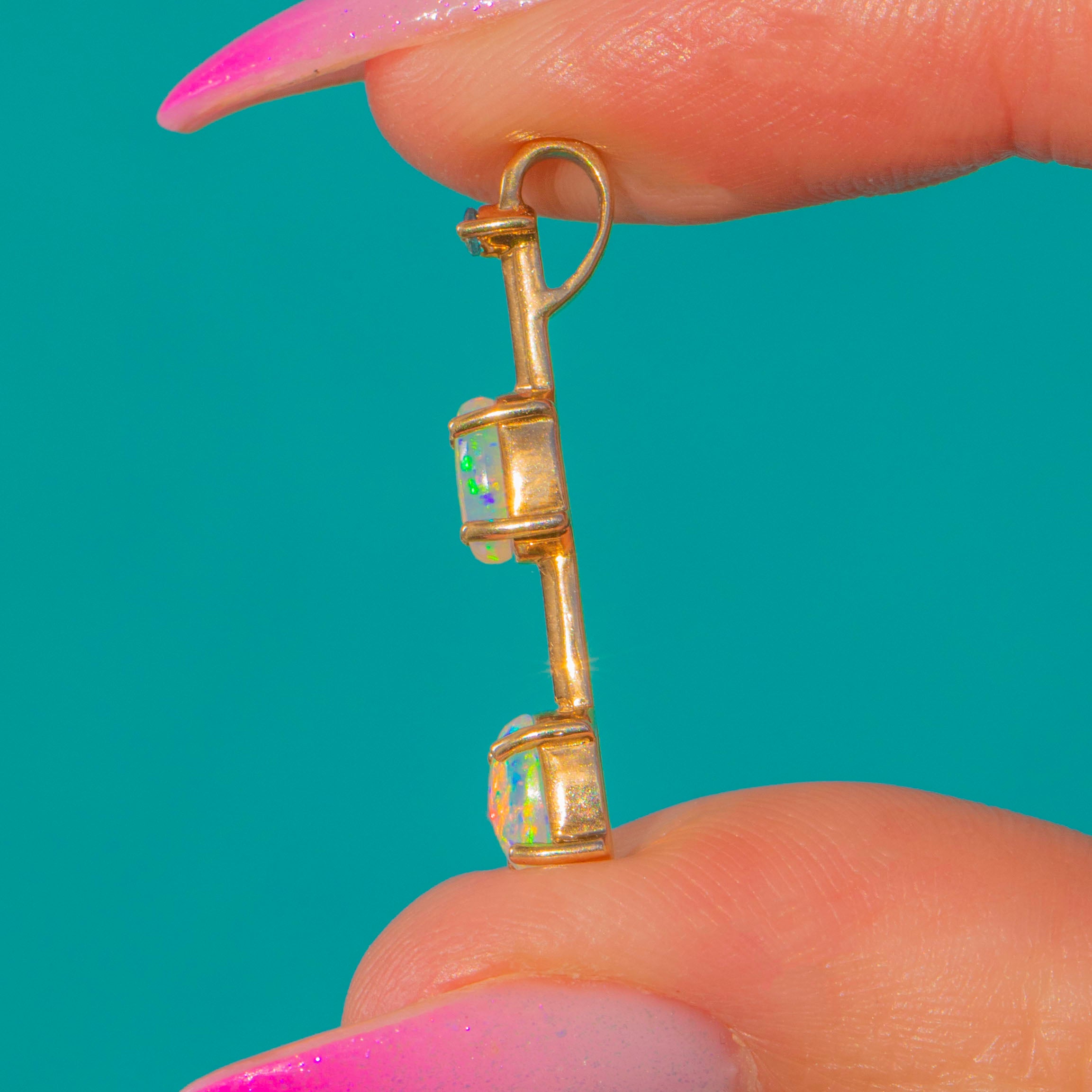 A refined Victorian bar pendant that lets its gemstones take centre stage. Two luminous Opal cabochons glow with playful flashes of blue, green and orange, crowned by a petite Emerald for a fresh pop of colour. The linear silhouette is sleek and minimal, crafted in warm 9ct Gold for an effortlessly elegant finish.