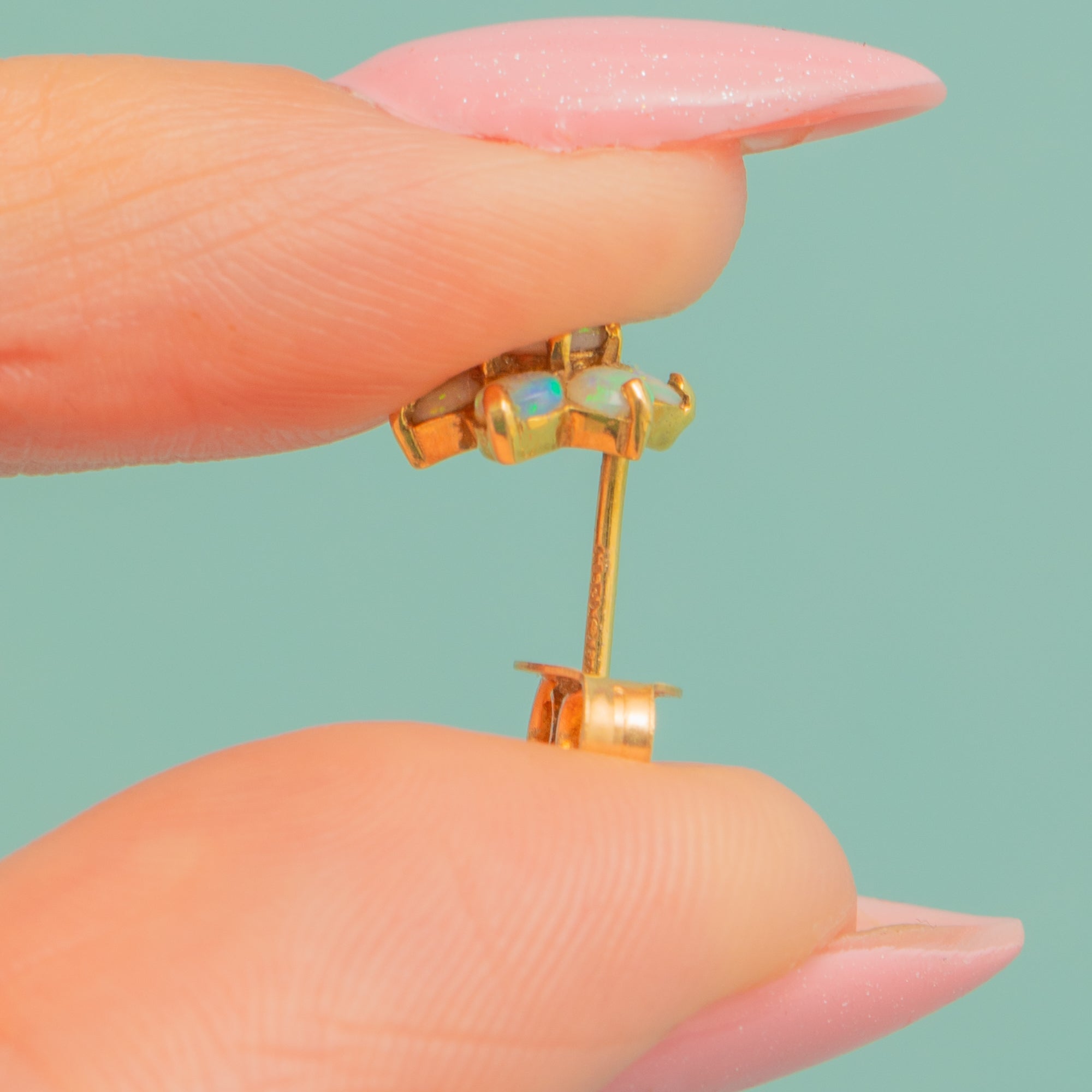 VERY GOOD-EXCELLENT: These 9ct Gold Opal flower cluster stud earrings are in lovely condition. The Opals are set securely, with only minor surface wear to the gemstones and Gold. With secure butterfly backs, these vintage earrings can be worn with confidence.