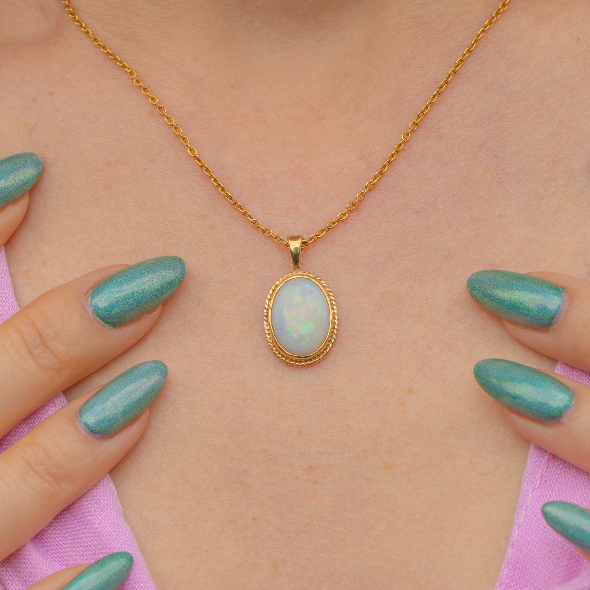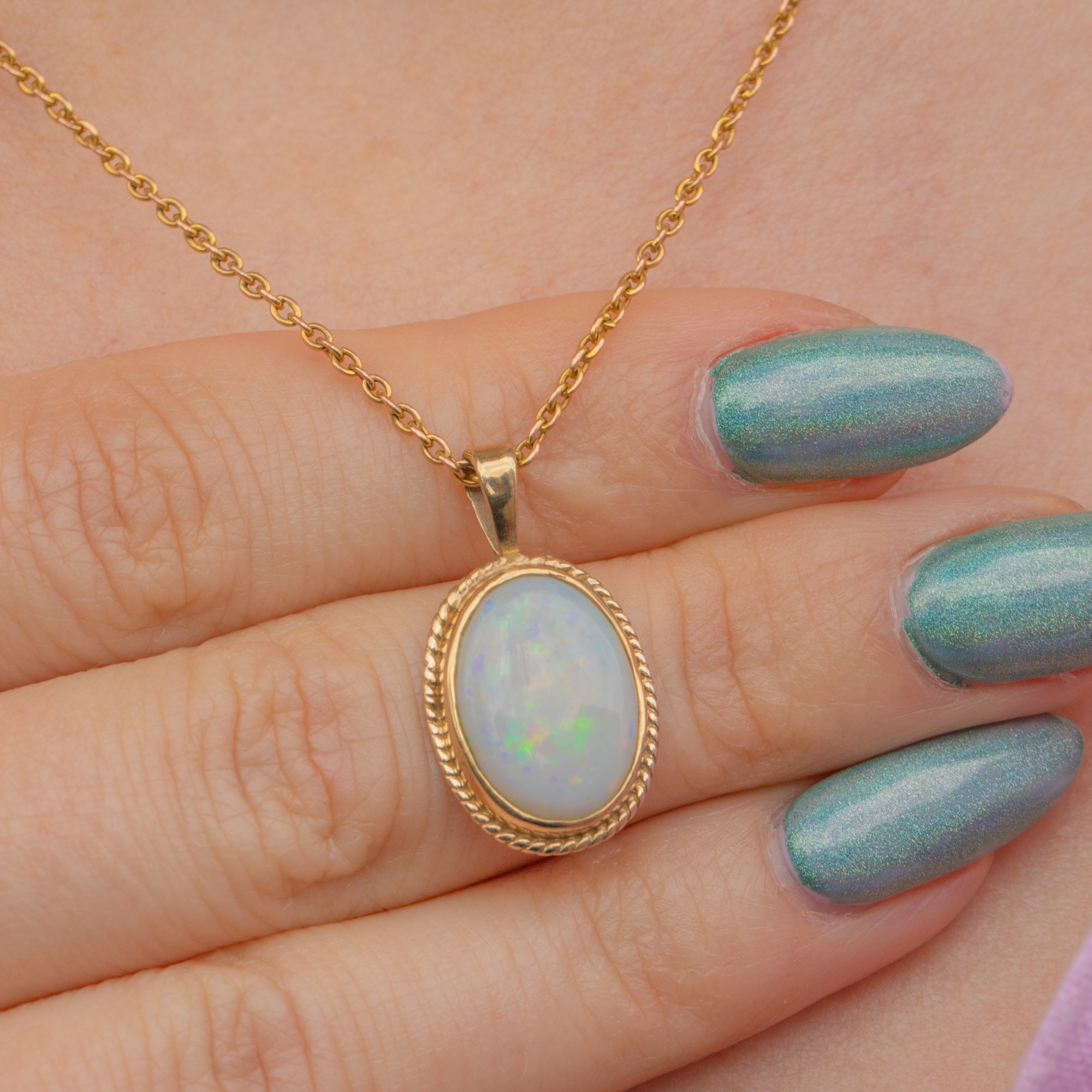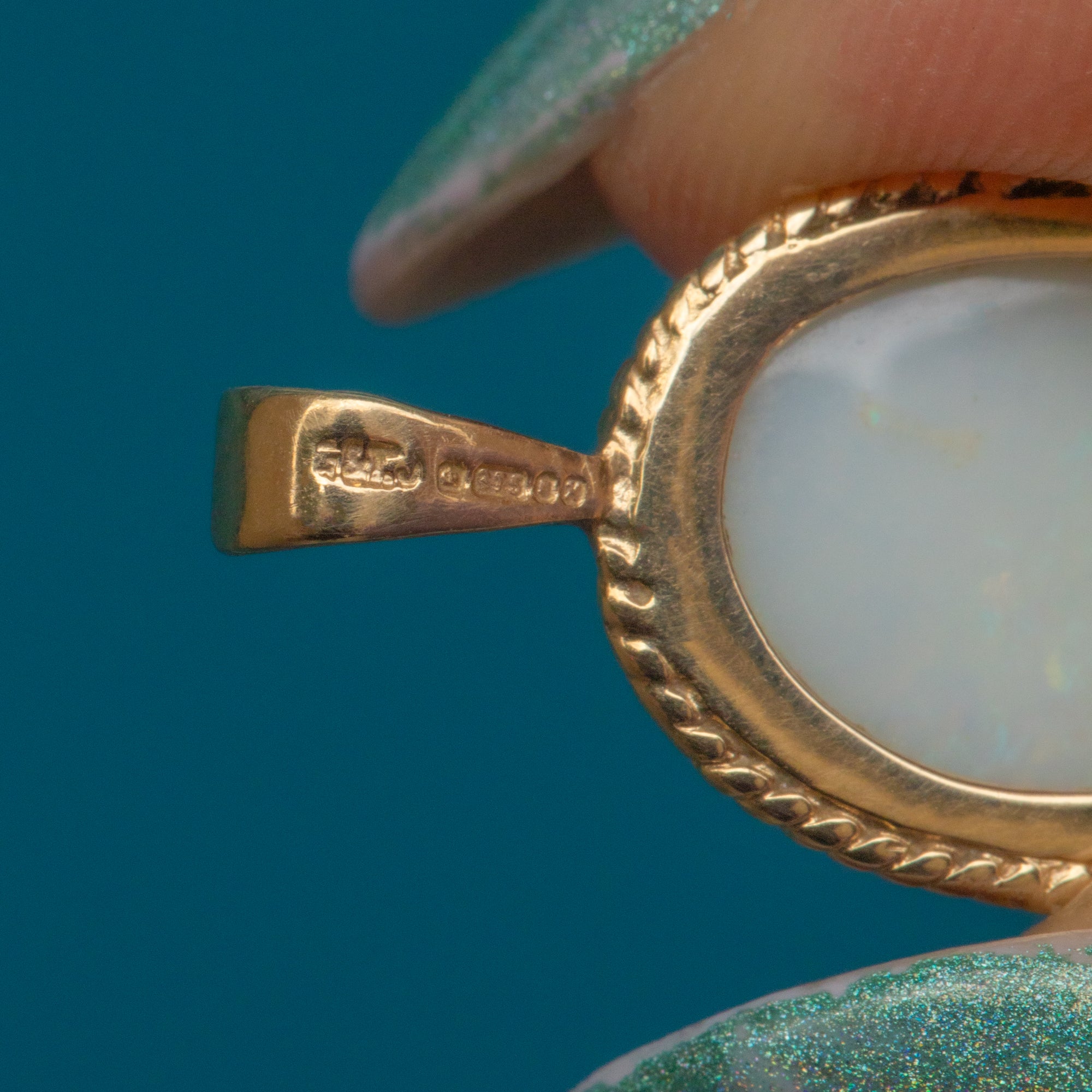 VERY GOOD. This 9ct Gold Opal pendant is in very good condition. The Opal cabochon is smooth with only one small scratch on the surface, noticeable under very close inspection, and is securely held within its bezel. The Gold is buttery and the rope border is firmly affixed with no signs of wear. There is a little wear on the back of the pendant, but this does not affect the integrity of the piece and cannot be seen while the pendant is being worn. With a sturdy bale, all this striking Opal pendant needs is a chain to adorn!