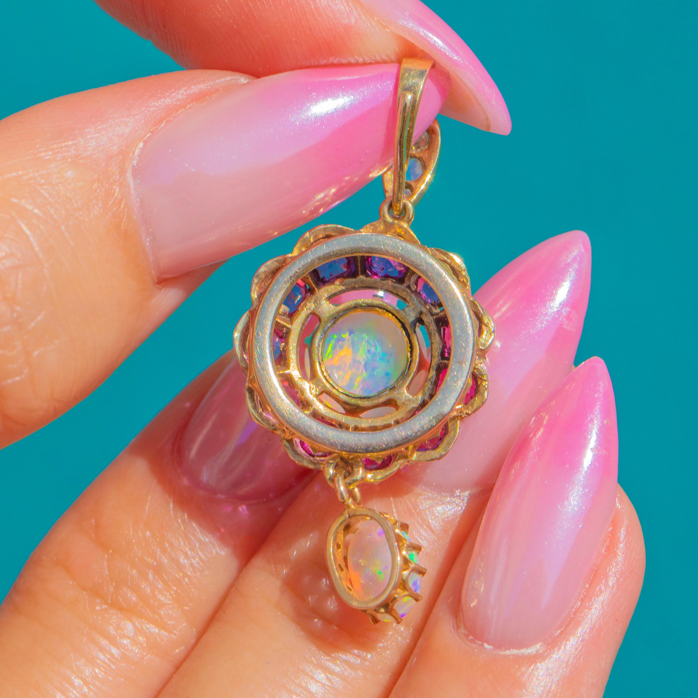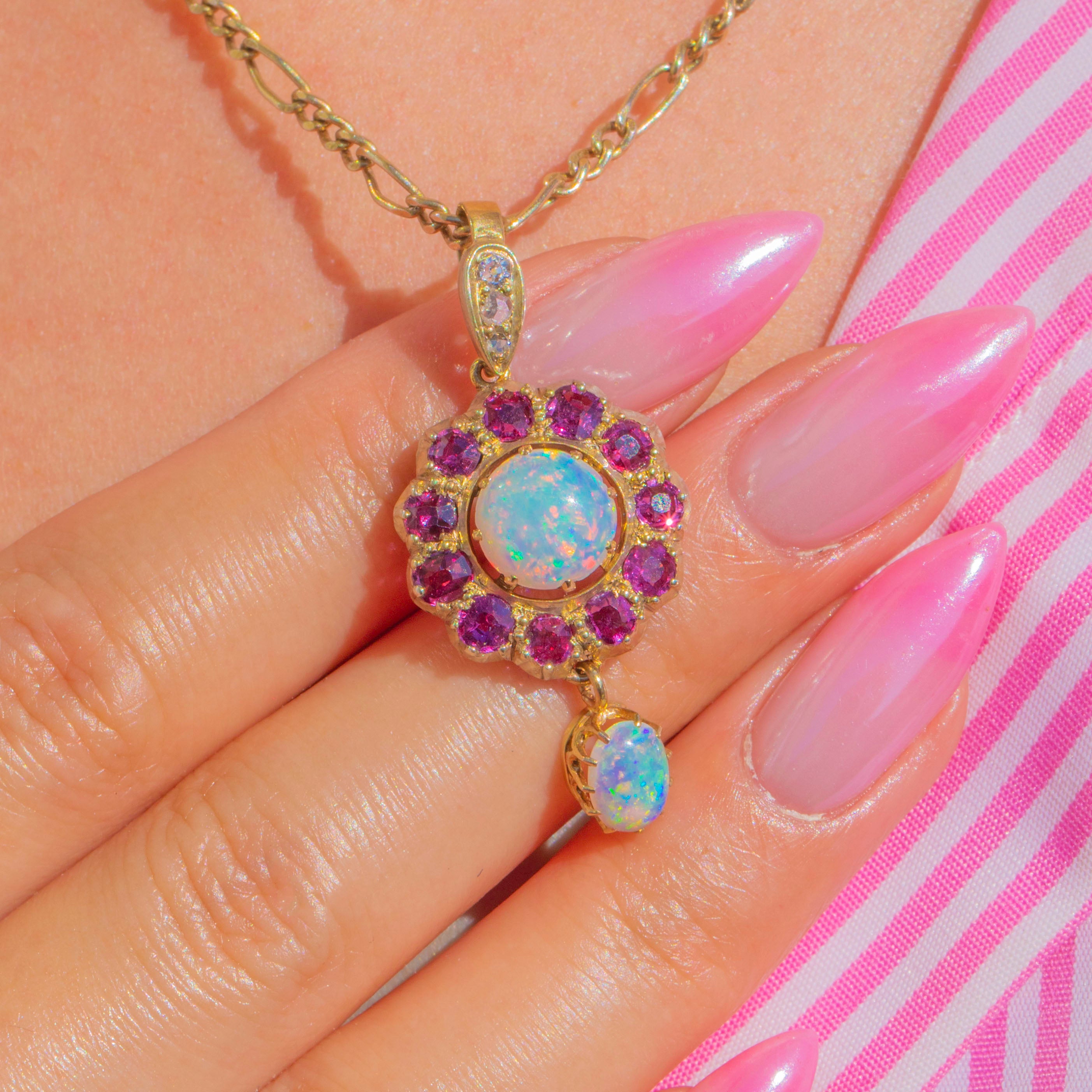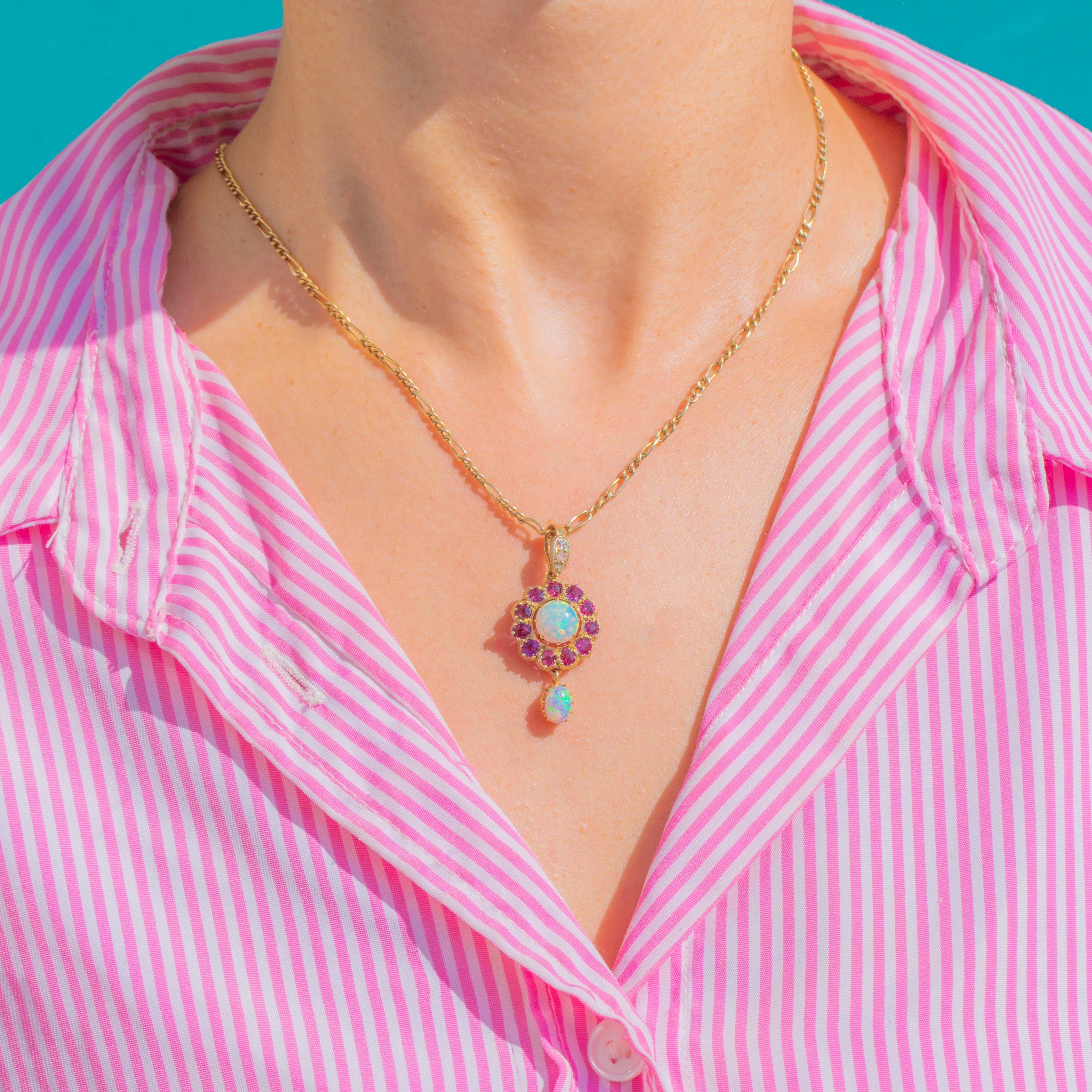 Glimmering with romantic colour and movement, this Victorian 9ct Gold cluster drop pendant centres on a luminous round Opal cabochon, haloed by a vivid rosette of Rubies. A petite oval Opal is articulated beneath, catching the light with every step and echoing the ethereal play-of-colour above. Tiny Diamonds sparkle at the bail, adding a delicate flicker of brilliance to the warm Gold.