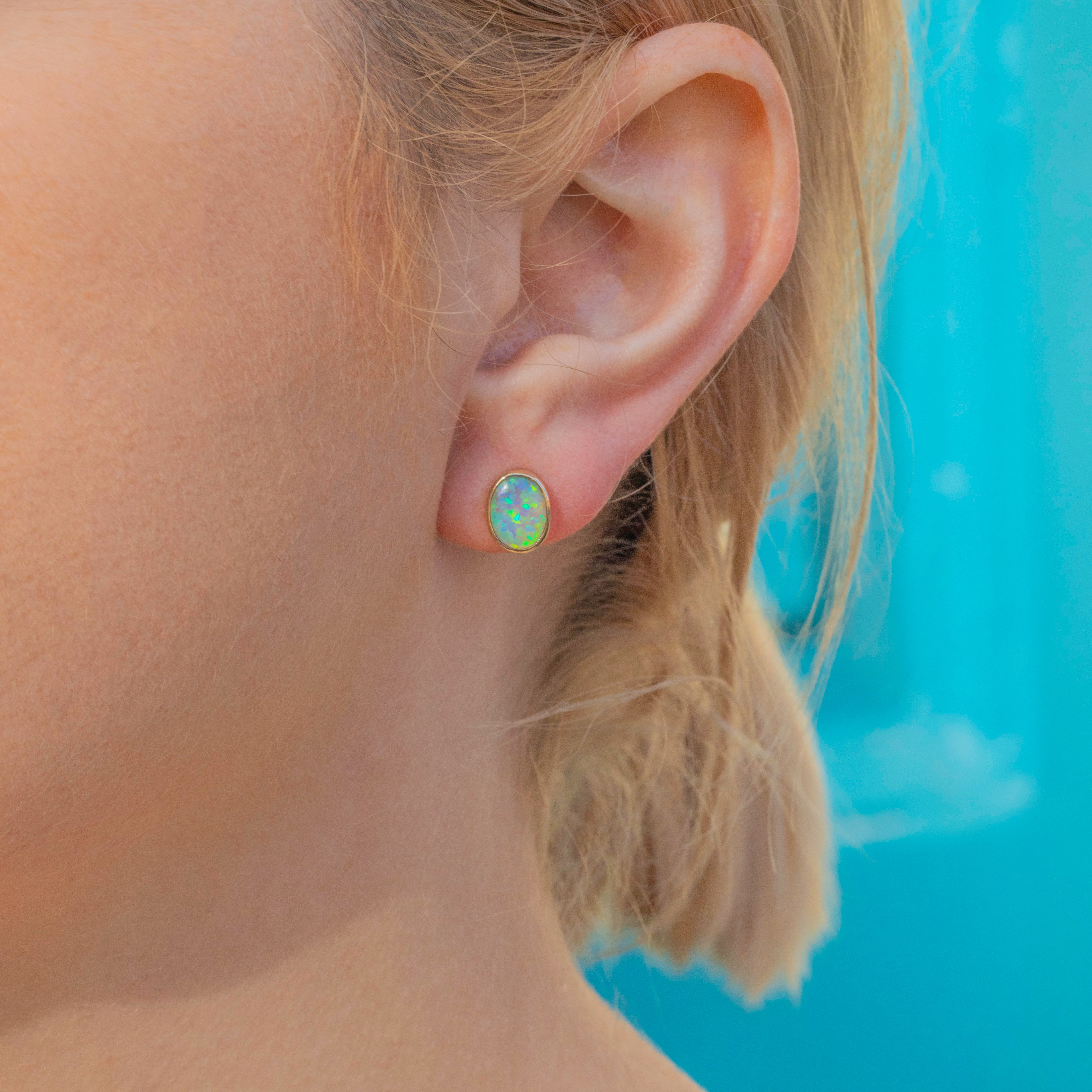 EXCELLENT. We are pleased to present these 9ct Gold Opal stud earrings in excellent condition. The vibrant Opals catch the light beautifully and are free from any scuffs or chips. The Gold is bright and buttery and the bezels are robust, holding the Opals securely in place. With snug-fitting butterfly backs, you can wear these vintage Gold studs with absolute confidence!