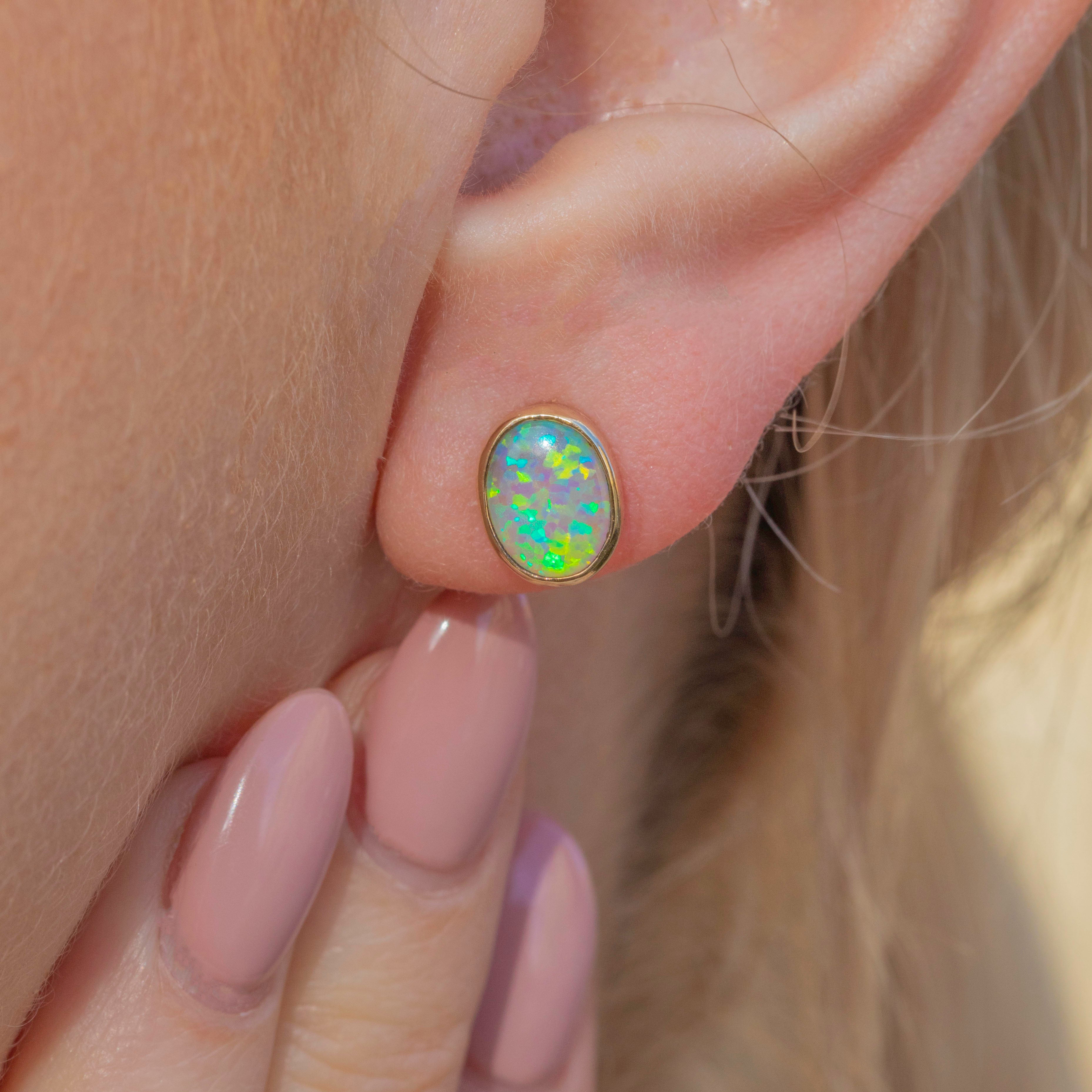 Radiating vibrant green and blue hues through to flashes of pink and purple, these vintage Opals will bring a vibrant pop of colour to your lobes. These vintage studs are crafted from buttery 9ct yellow Gold, effortlessly complementing the iridescence of the Opals.