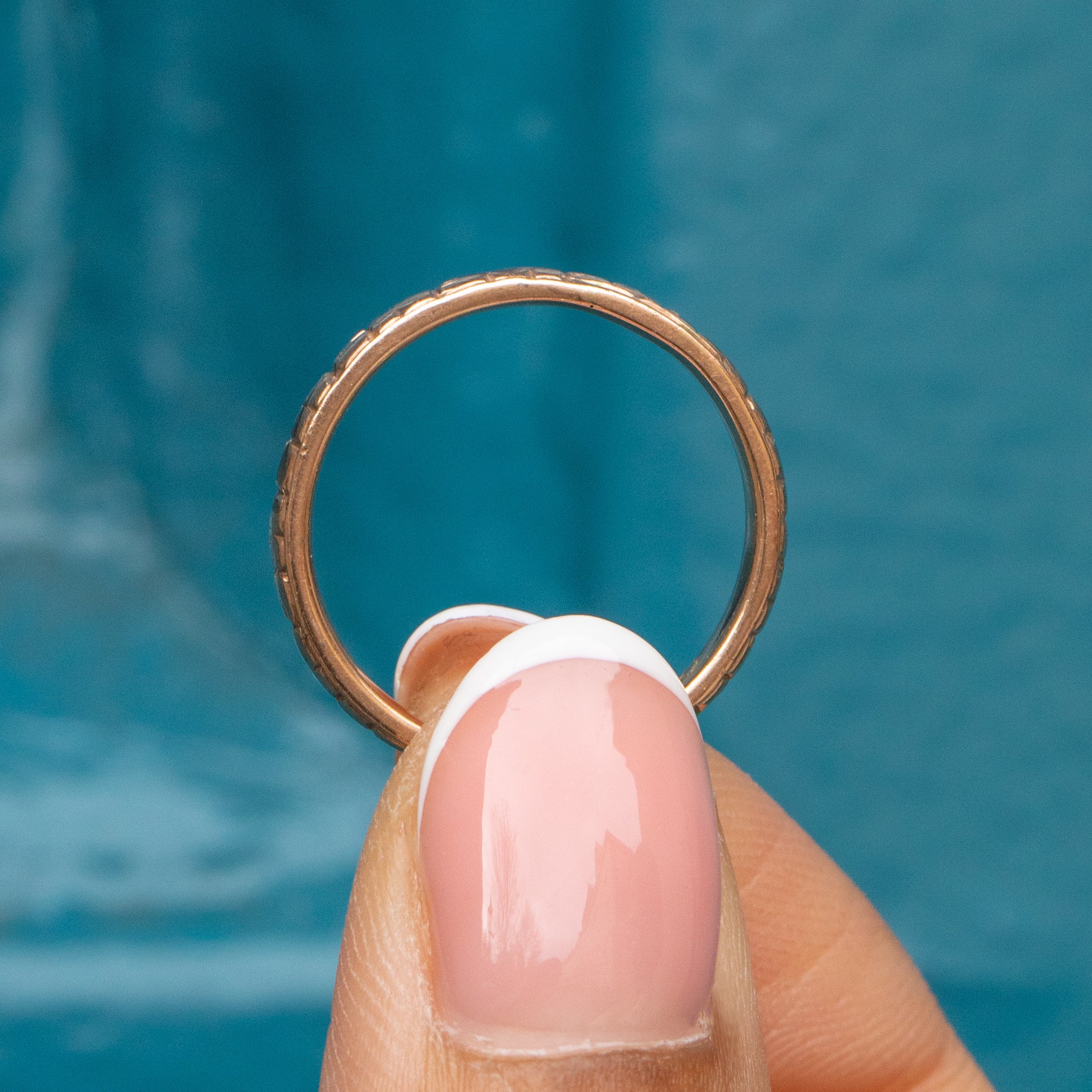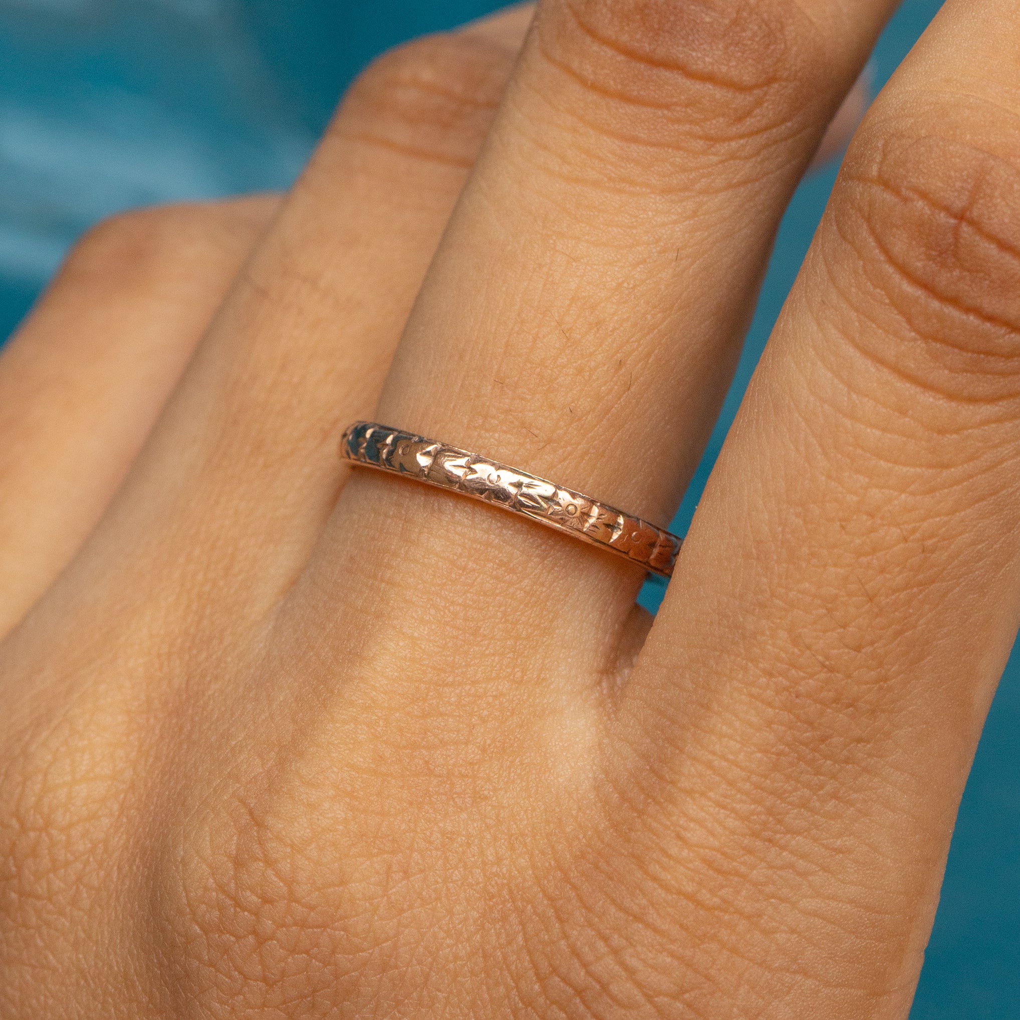Orange blossom motifs have been skillfully etched across the faceted form of this vintage Gold band, symbolising innocence and fertility, a popular design for wedding bands that link back to the Victorian era!