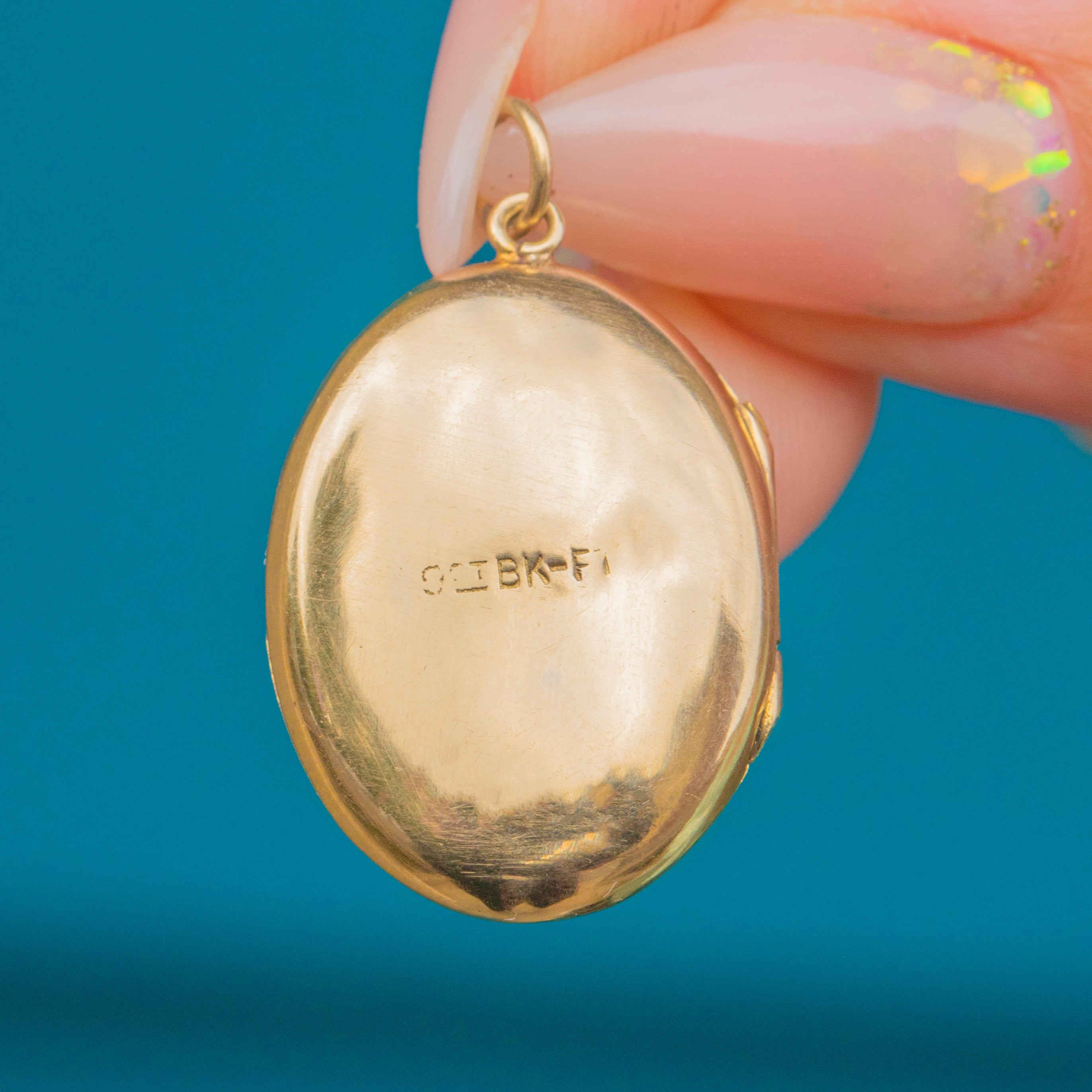 This Edwardian oval locket offers timeless elegance in glowing 9ct Gold. The smooth front is embellished with a delicate flourish of hand engraving, balancing the simplicity of polished Gold with decorative charm. Inside, it opens to reveal two compartments ready to hold cherished photographs or mementos.