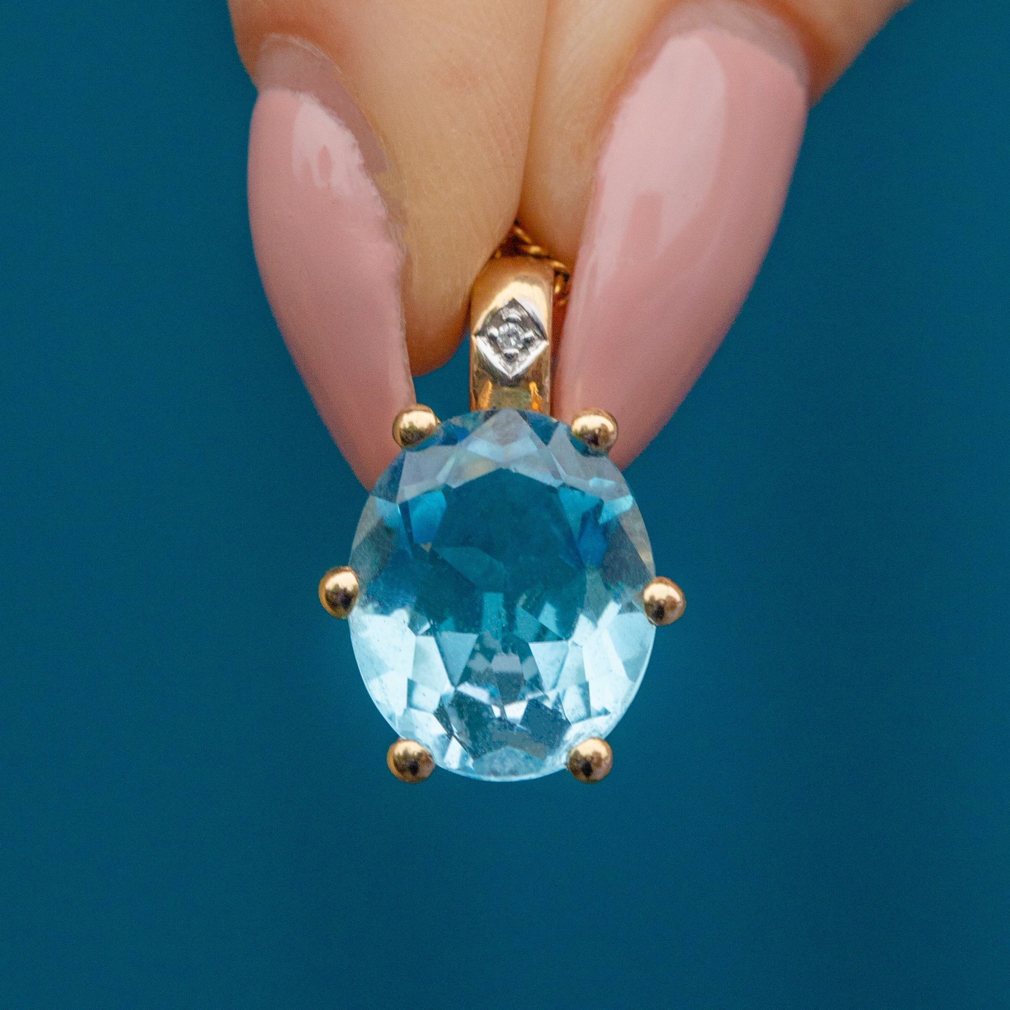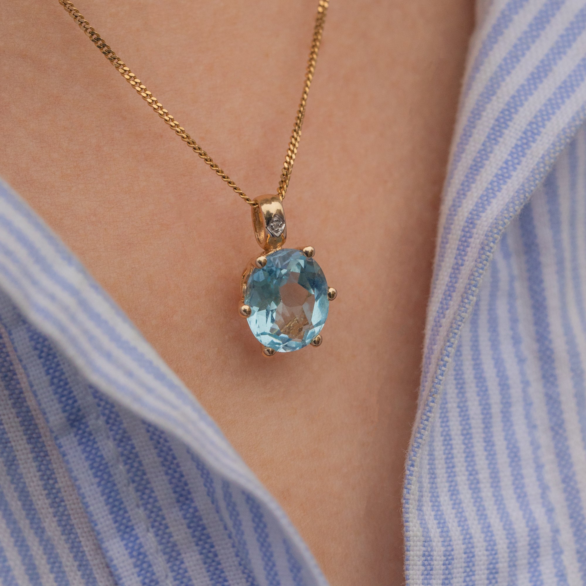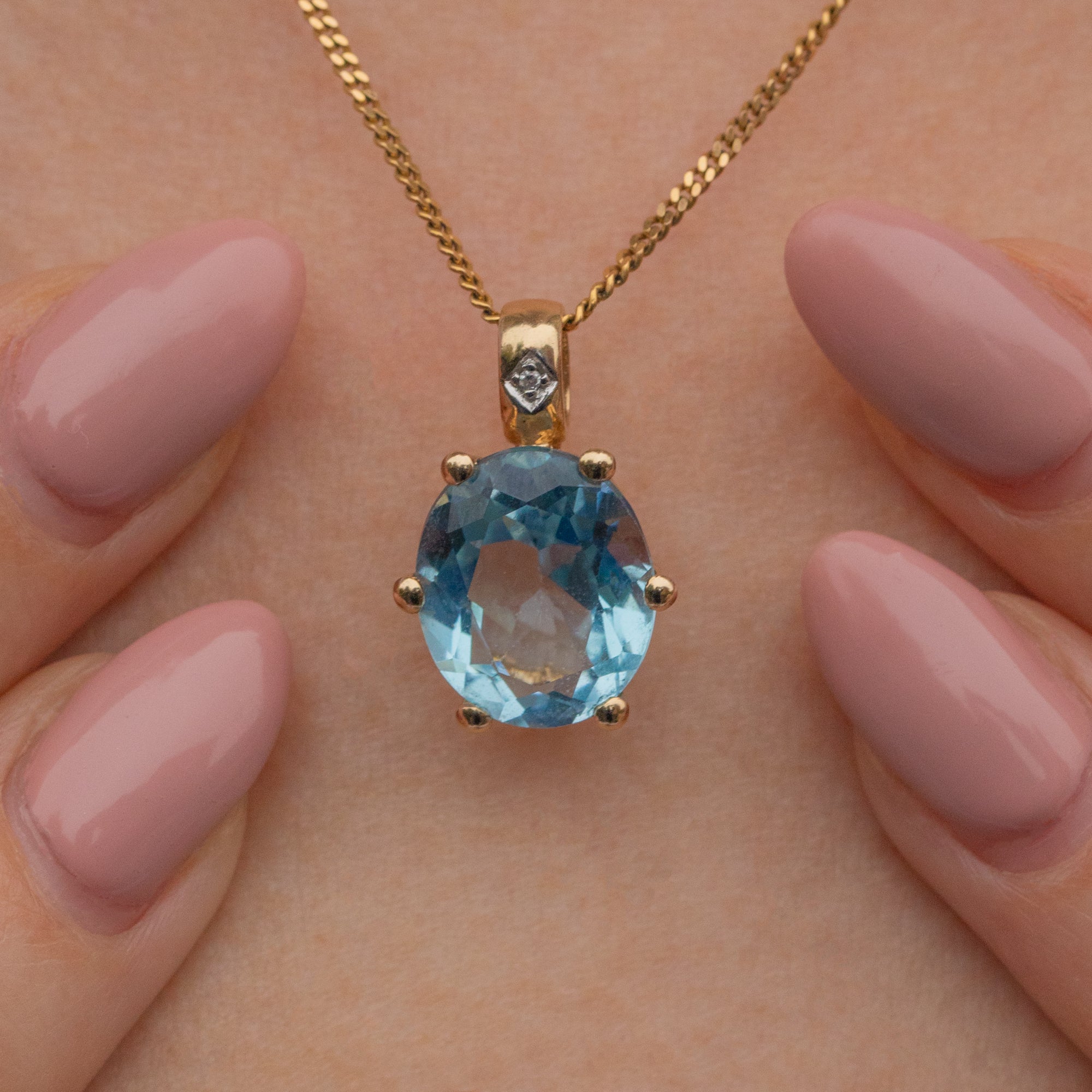 Add a pop of sky-blue serenity to your wardrobe with this 9ct Gold Oval Topaz Diamond charm! This Vintage pendant boasts a heavenly 2.35ct Topaz shimmering with ethereal light, evoking a feeling of tranquility and calmness.