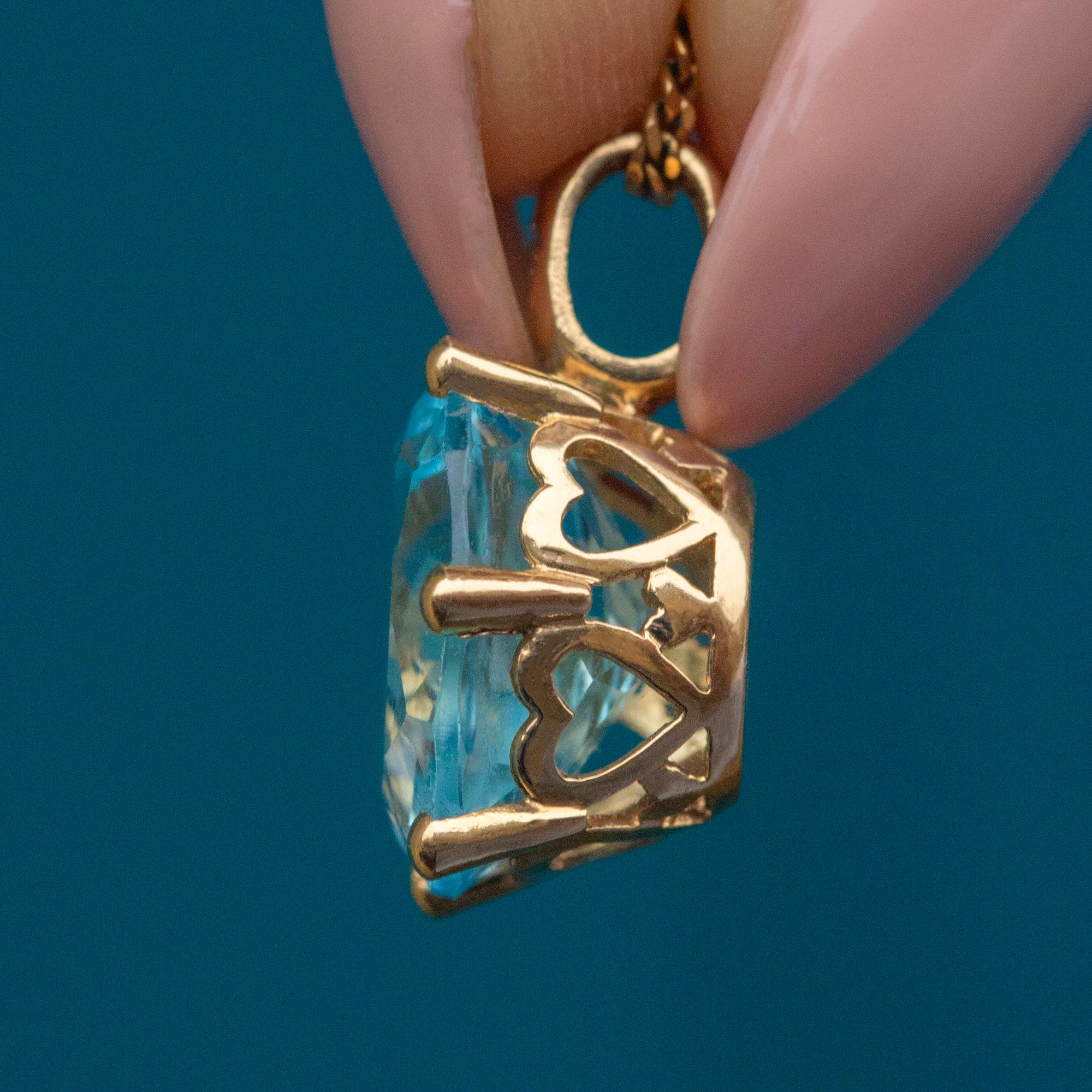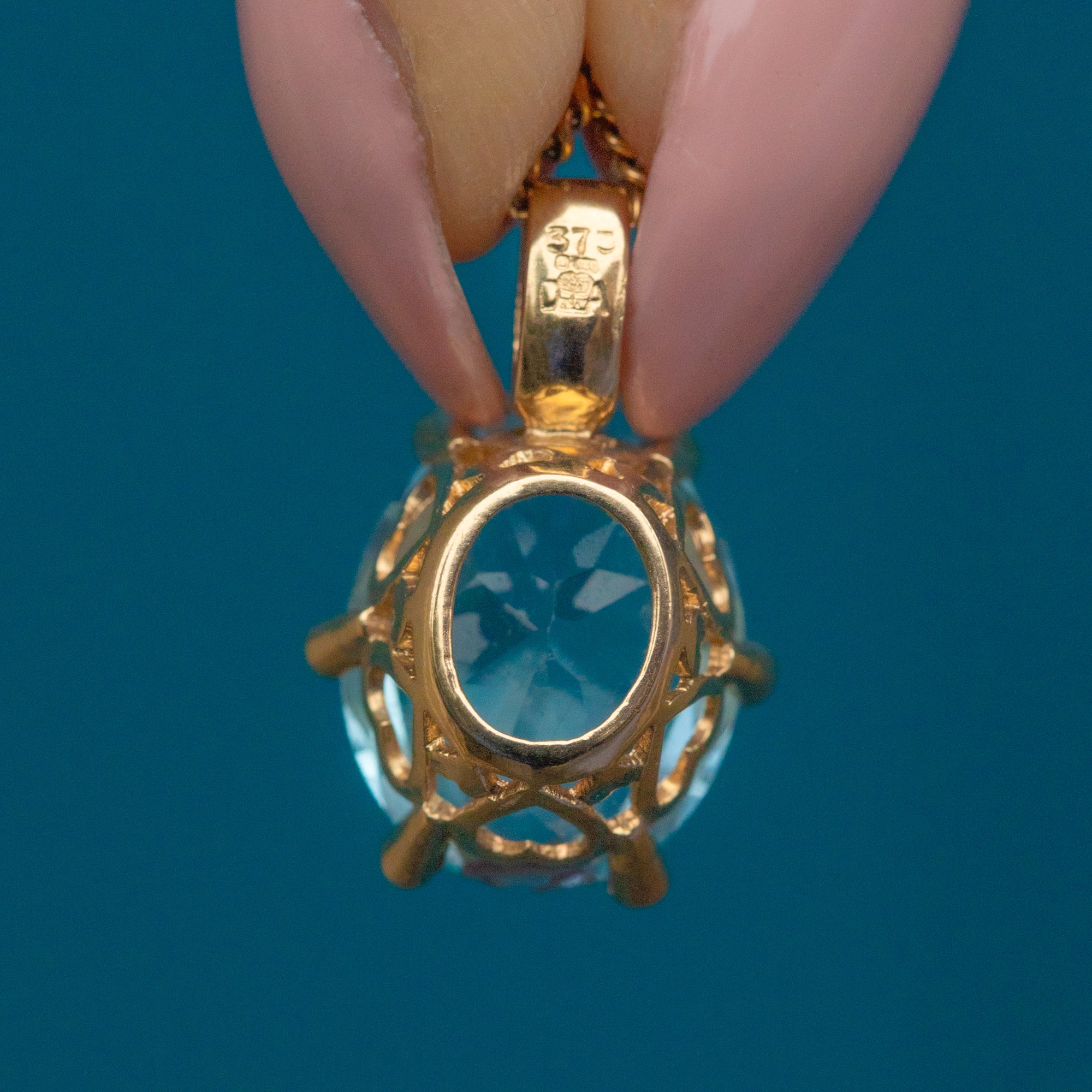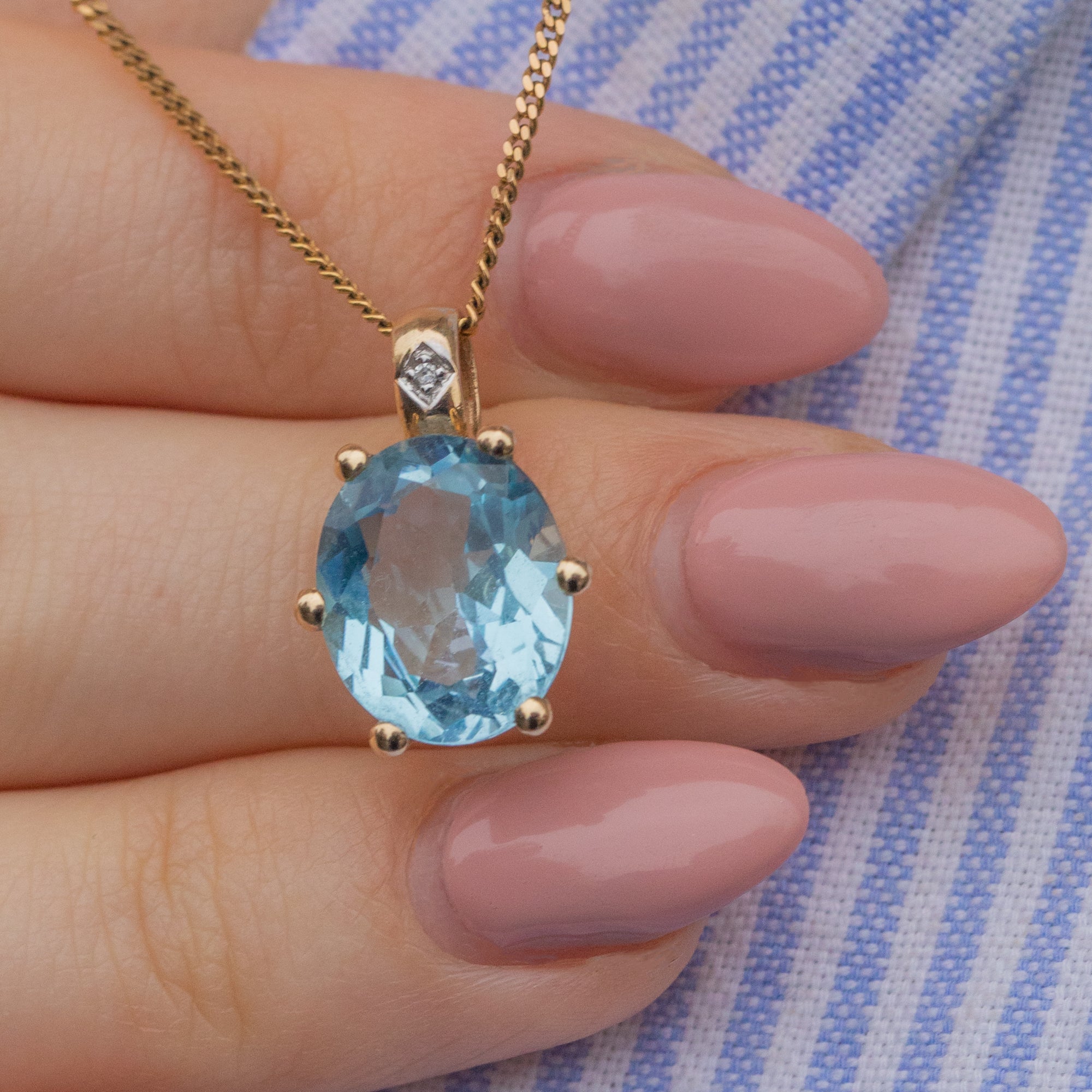 Add a pop of sky-blue serenity to your wardrobe with this 9ct Gold Oval Topaz Diamond charm! This Vintage pendant boasts a heavenly 2.35ct Topaz shimmering with ethereal light, evoking a feeling of tranquility and calmness.