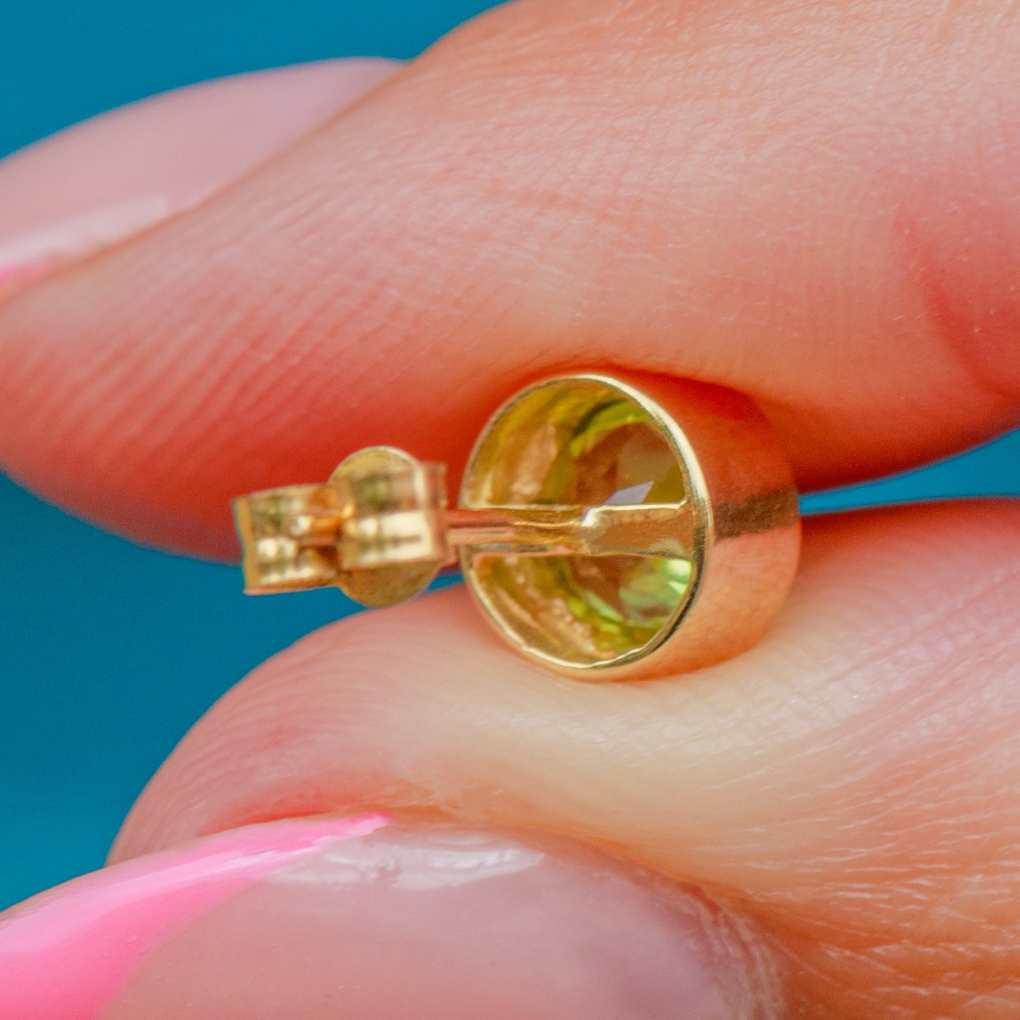EXCELLENT: These 9ct Gold Peridot bezel-set stud earrings are in excellent condition! The Peridots are simply delightful and free from any chips or abrasions. The Gold is saturated throughout and the bezels hold each Peridot securely in place, with only very mild wear to their surface. With secure butterfly backs, these versatile vintage Peridot earrings are set to become your new grab-and-go pair!