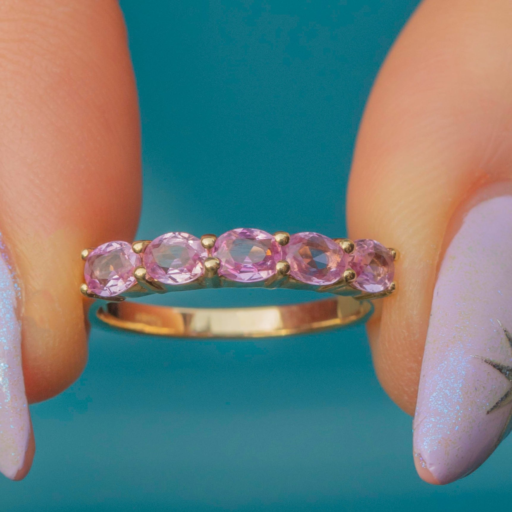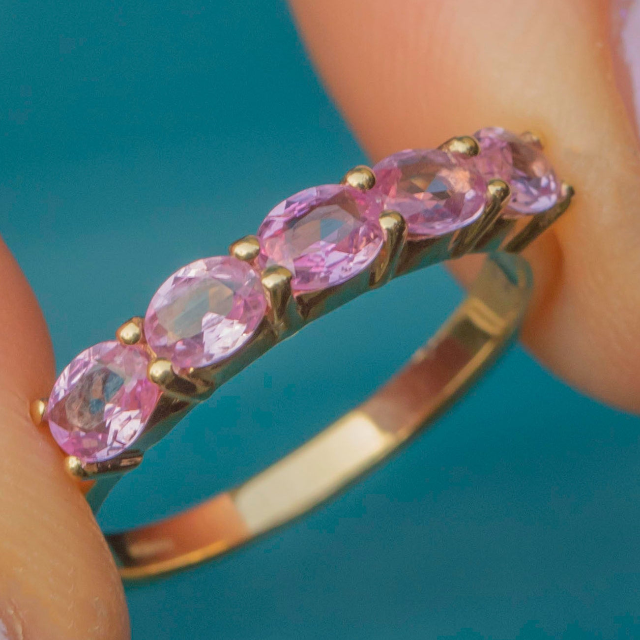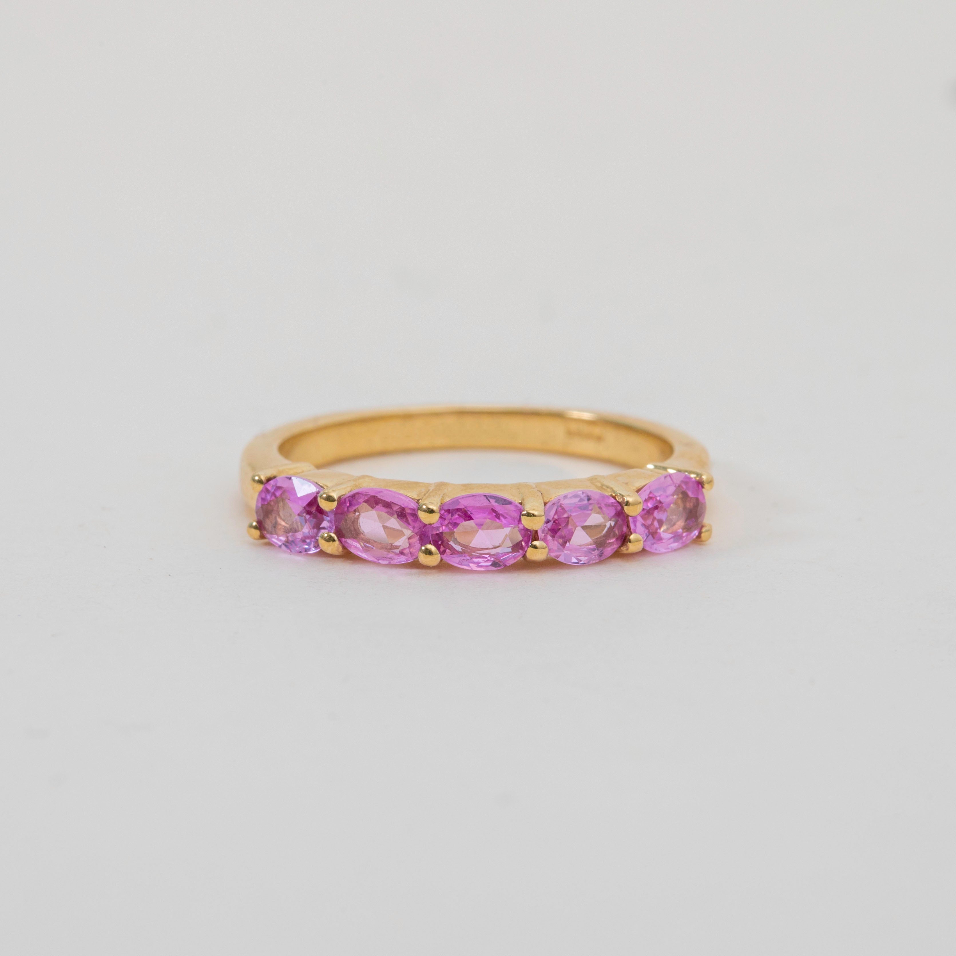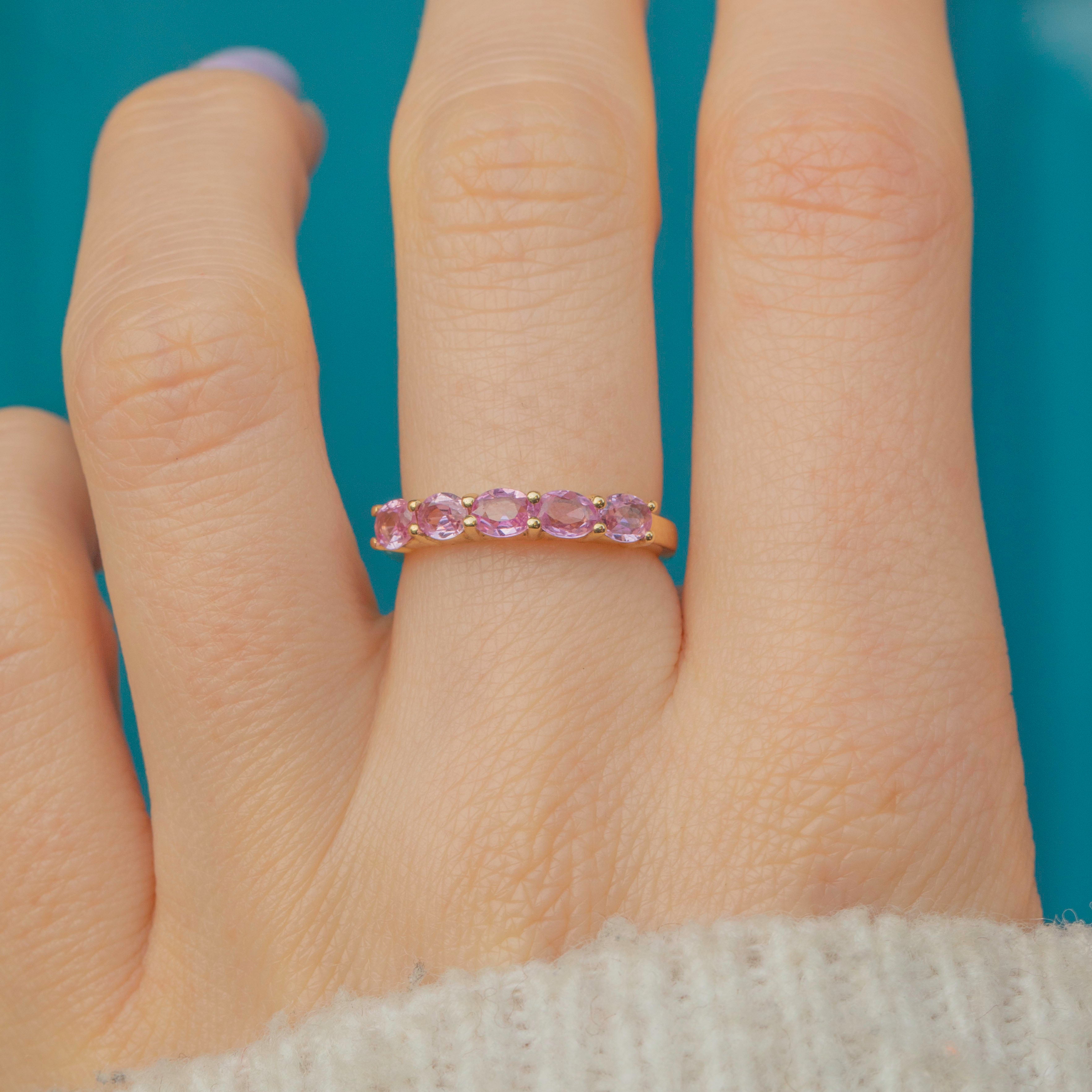 Crafted from buttery 9ct Gold, this eternity ring features five stunning pink Sapphires, each radiating soft rose hues as they catch the light. A symbol of eternal love, this Sapphire ring is the epitome of romance and is the perfect piece to add to your collection this valentines day!